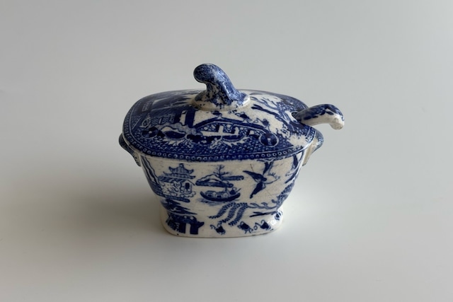 モシュリンヌ小さな木箱 Grasse 蓋の左上に小さく書かれた Grasse は、南フランスのプロヴァンス地方にあるグラース「世界香水の首都」として知られる香水産業の聖地。 白と黄色の花束が静かに描かれた手のひらに乗るほどの小さな木箱です。小物入れですが、このサイズですと当時はスタンプ(切手や印紙など)入れとしても使われていました。 丁番は真鍮製、若干のぐらつきがありますが使用するのに支障はなさそうです。上蓋の右手前が欠けています。経年変化によるオリーブの渋い色合いと木目がとても美しい一品です。 モシュリンヌ・ボックスは1900年代初めにスコットランド南西部の Mauchline で制作されていた木工民芸品。オリーブの木を使ったこの木工品は1930年頃まで作られていました。当時はフランスやスイス等、ヨーロッパ各地の観光地にスーベニールとして輸出されていました。オリーブの美しい木目に蓋には花や鳥など自然をモチーフとした絵が描かれました。 元々数の少ないモシュリンヌですが、草花の絵がハンドペイントされている物が多く、木象嵌された物もあります。 ・England 1900-1930年頃 ・サイズ:縦5.2cmx横6.5cmx高さ3.4cm