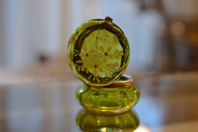 グリーンの透明ガラスと白と金彩のエナメル画がとても素敵な小さなポット。 パウダーボックスやピルケースなど小さなものを入れておくのに便利な小物入れです。色んな使い方がありそう。 蓋にはエナメルで描かれた白いの花と金箔が少し立体になってエンボスになっています。胴回りの金物は真鍮製で作られています。蓋の開閉も良好です。 現地ディーラーはモーゼルガラス製といってました。モーゼルガラス(Moser)は、1857年にチェコ(旧オーストリア=ハンガリー帝国)のカルロヴィ・ヴァリで創業された、世界最高峰のクリスタルガラスブランドです。その品質と美しさから「王様のガラス」と称され、ヨーロッパの王侯貴族や国家元首に愛されてきた歴史を持ちます。本当ならすごいです。 どこで作られたものにしてもとてもきれいで繊細、そしてチャーミングな一品です。 ・France 1900’s前後 ・サイズ:直径約4.8cmx高さ3.8cm