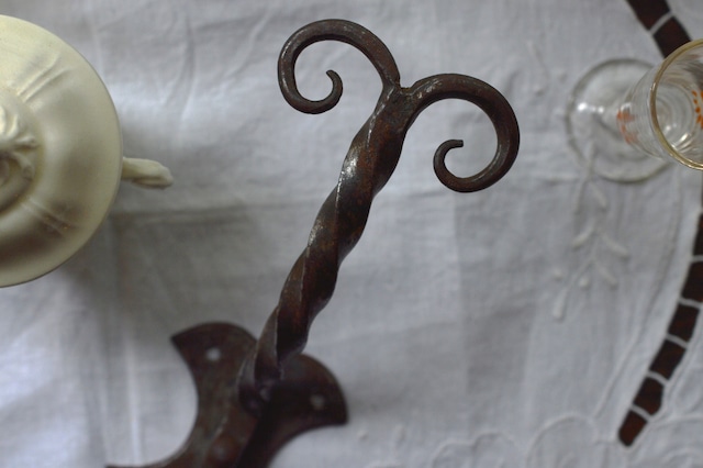 金物の先端がまさに水牛の角のような形をしたフック金物。支柱はねじれた形状、魔法の館からやってきたような武骨ですがおもしろいデザインの一品です。 鉄製で当時フランスの鍛冶職人によって作られたものと思われます。 表面の汚れや錆は大体落としてあります。初めはもっと煤黒い色をしていました。 壁付けタイプで台座に4つのビス穴が開いていますので、簡単に取り付けることができます(ビスは付属していません) 本体と台座は別パーツですが台座裏からビスでしっかり固定されています。 重みがありますので下地補強されている場所あるいはビスの効くところに取付してください。 おうちのエントランスホールやクローゼットや寝室などにいかがでしょうか。お店にも展示しておりますので、ぜひ手に取ってみてください。 ・France 1900’s前期 ・サイズ 本体:高さ20cmx横幅7cm、台座:縦7.2cmx横6cm