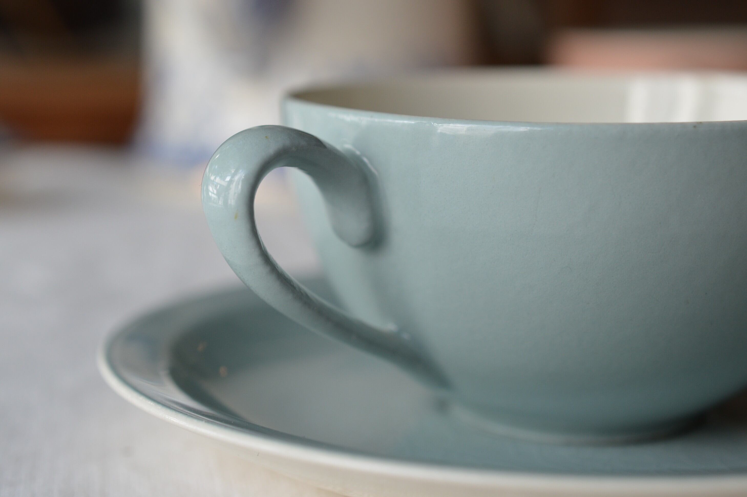 パステルと言っても柔らかでちょっとセピアな色合いでとてもいい感じです。カップの内側はホワイトアイボリー色。容量も横広の形状ですが深さもあり、お茶でもコーヒー用でも使えそうです。