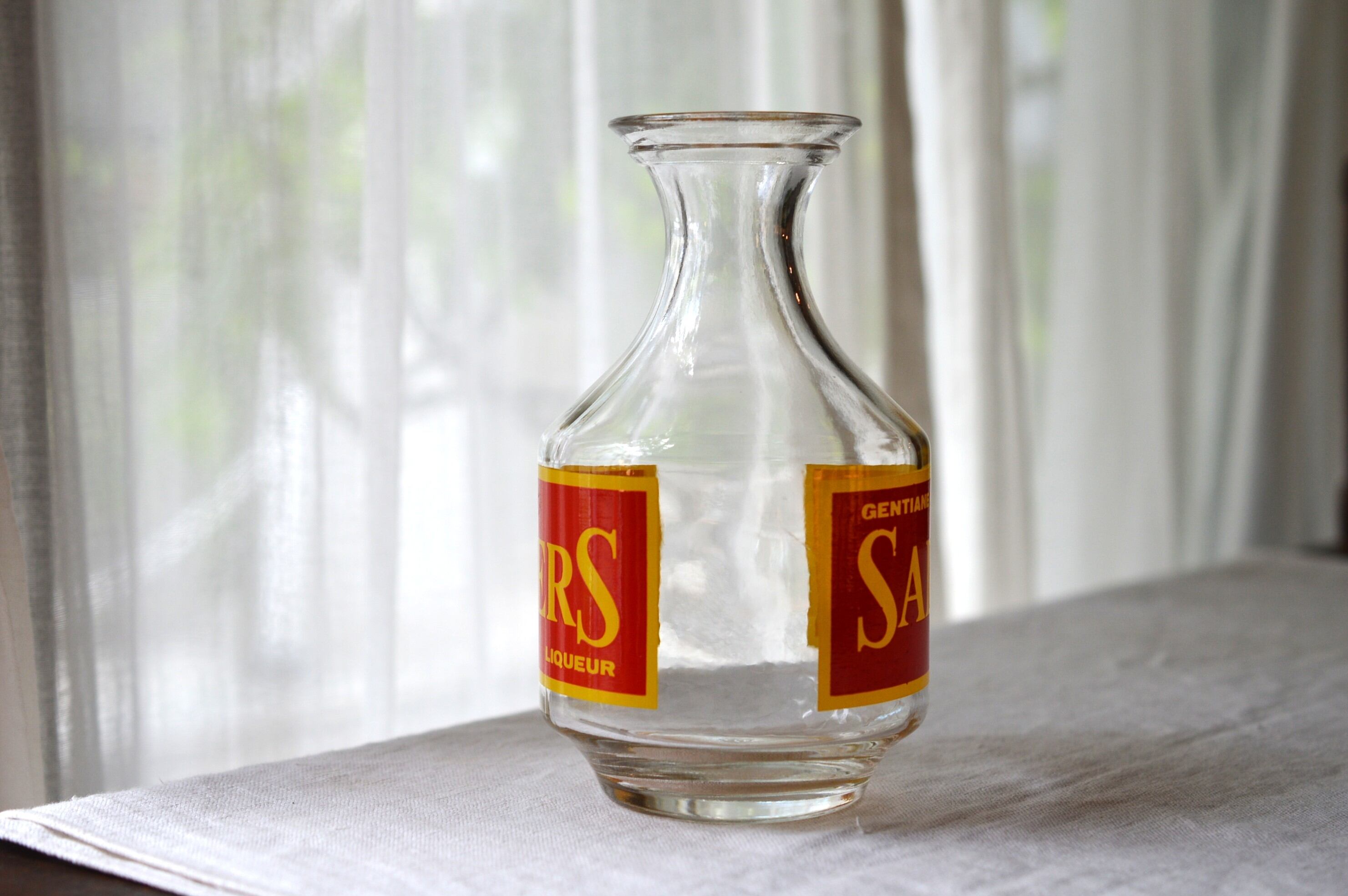 SALERS GENTIANEのカラフェ。1970年代くらいのガラス製カラフェです。フランスのワイン酒造メーカーの名前やブランド名が入ったデザイン。特徴のある伝統的なフォントやデザインがチャーミングです。
