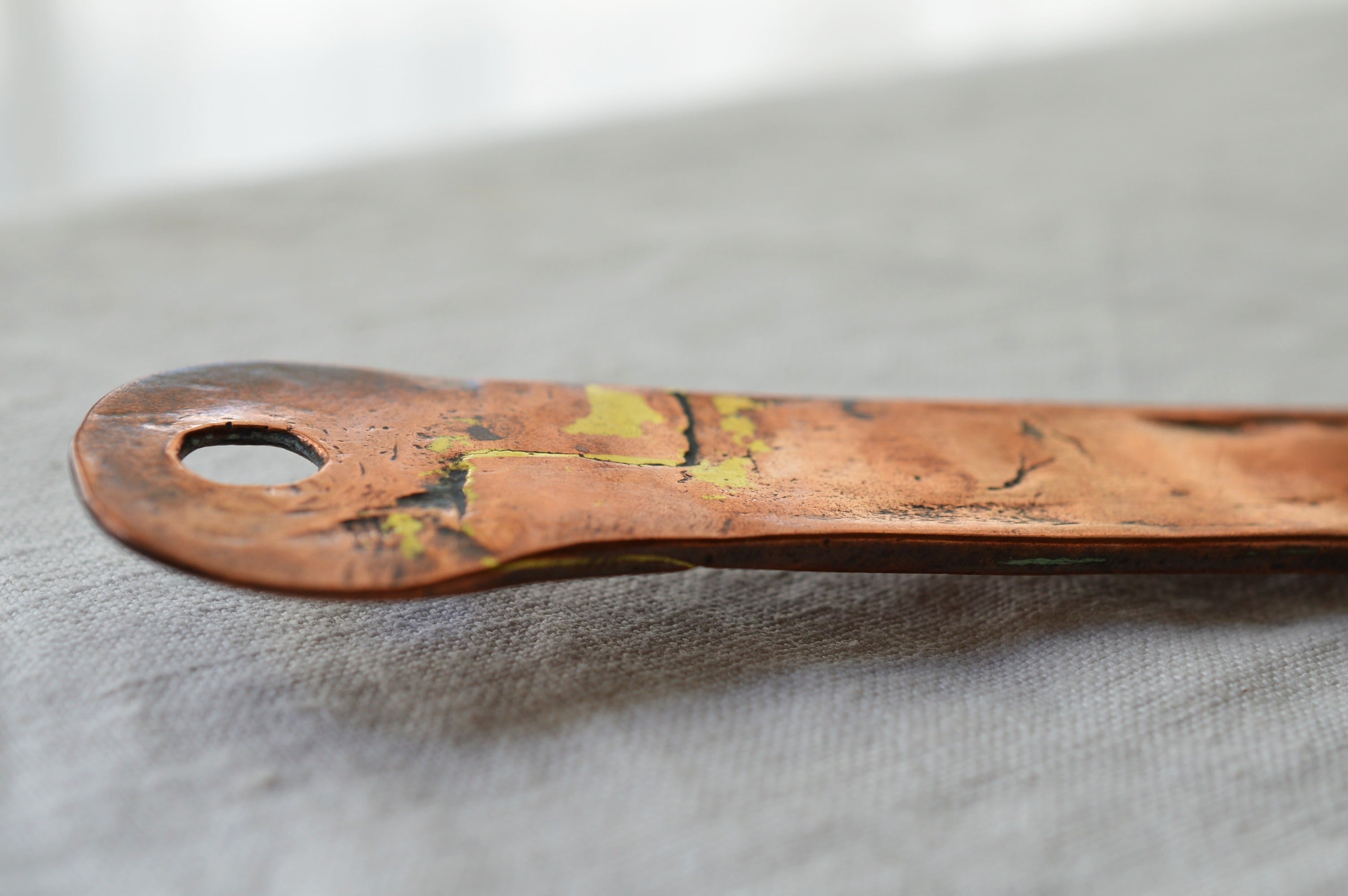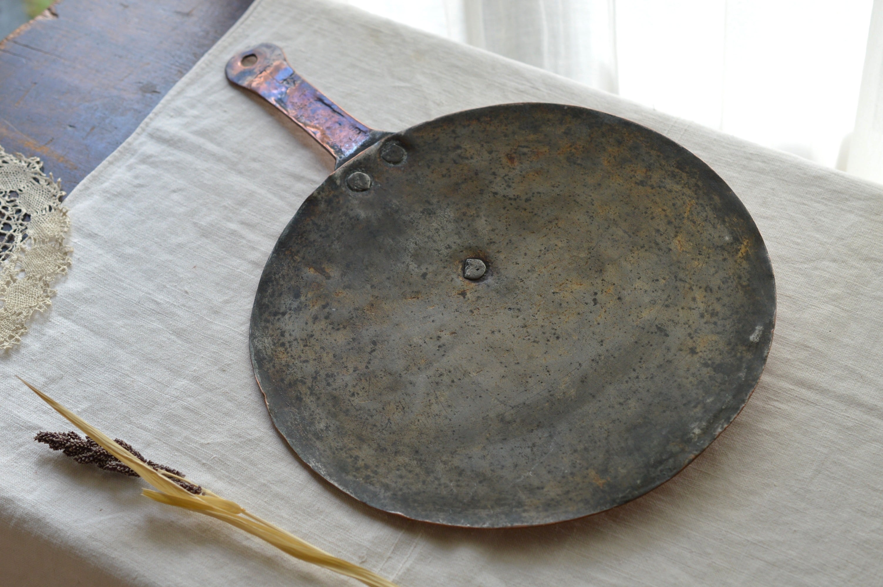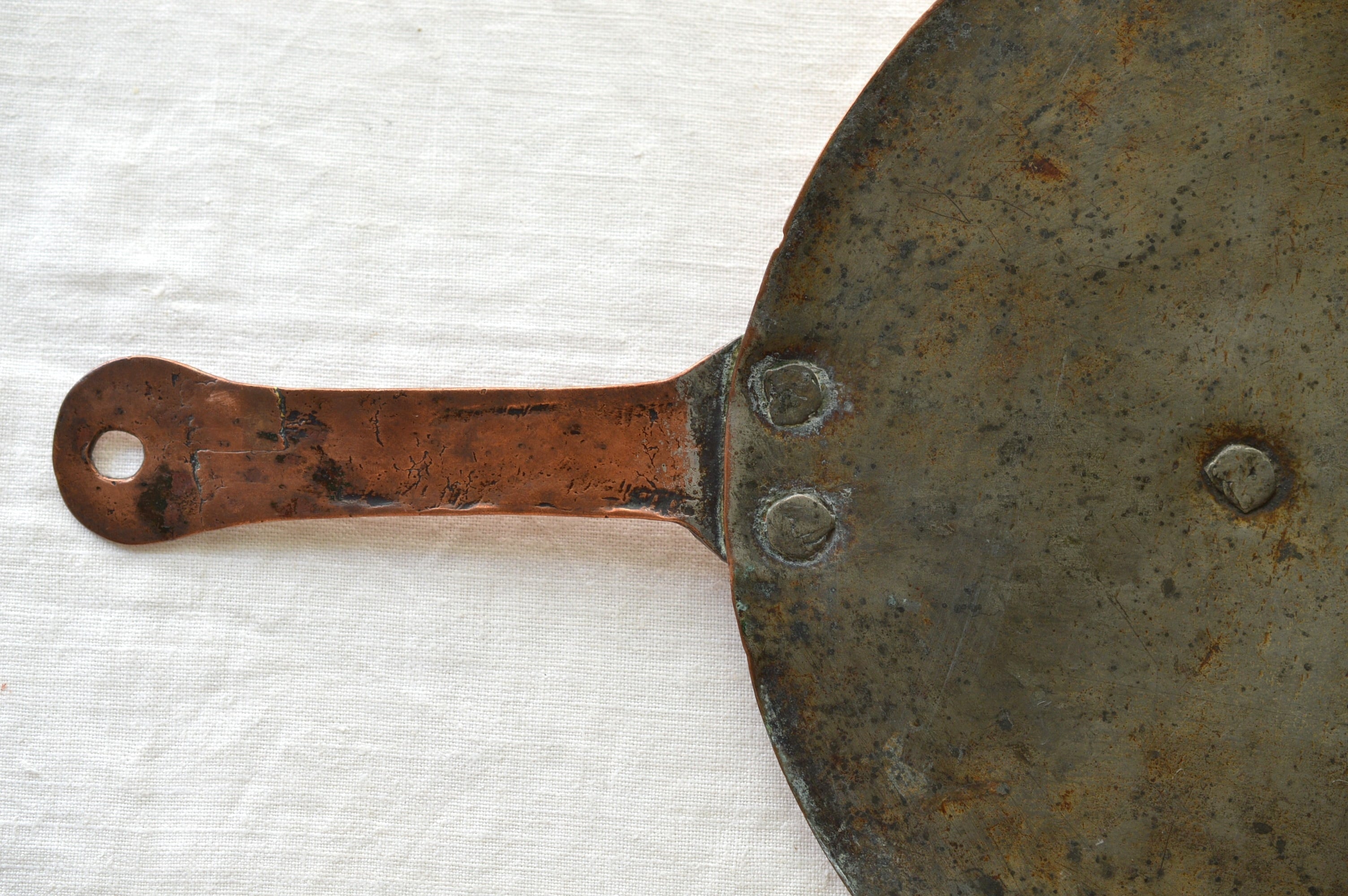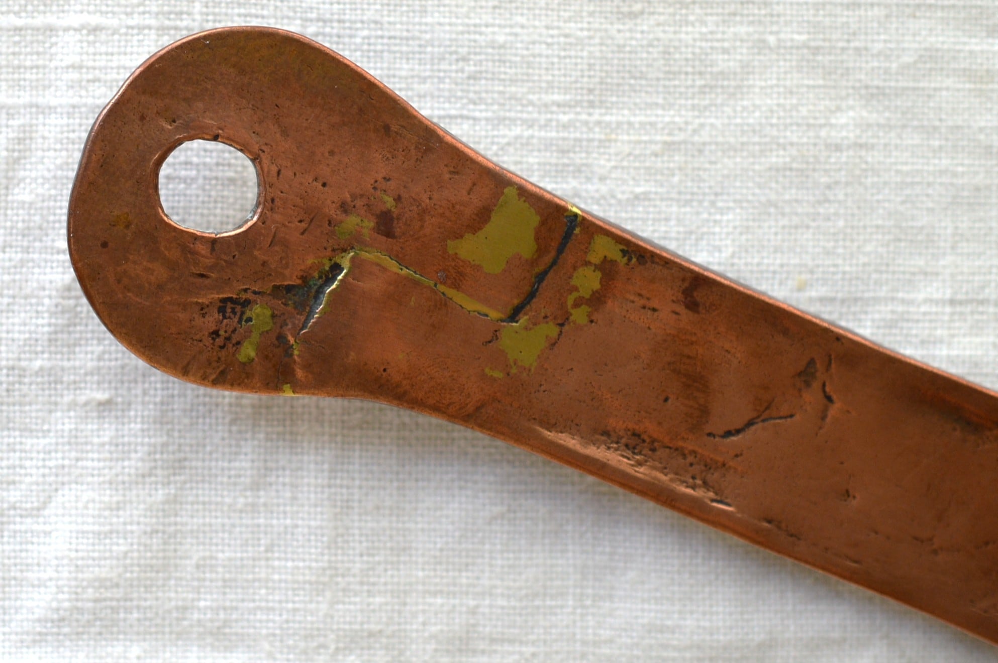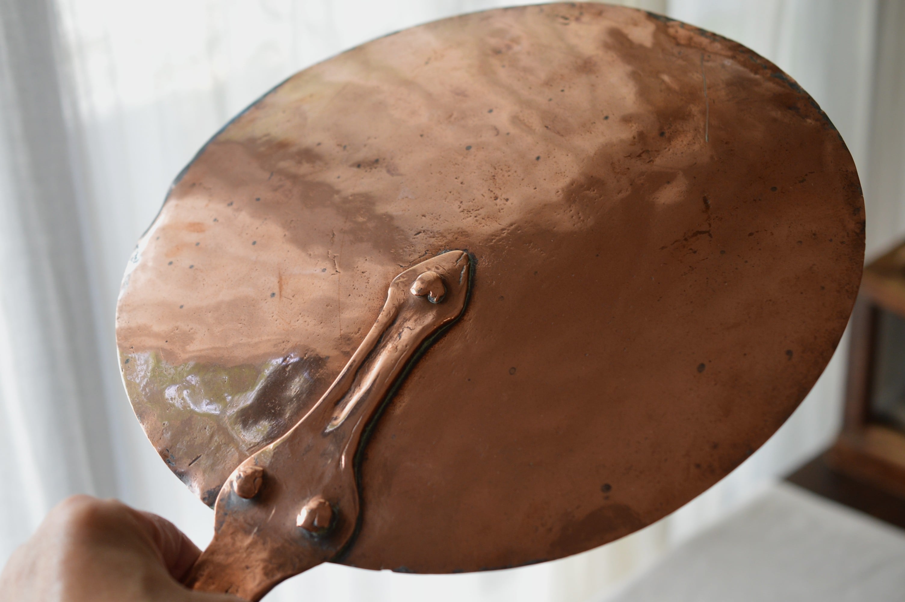 非常に珍しいスプラッシュパンの蓋ですが、通常の鉄製のハンドルではなく、銅製のハンドルとリベットが付いています。個性的な形をしたこの銅製の蓋は、経年変化による使用感と緑青が美しく輝いています。裏側の錫メッキは摩耗が進み本来の銅が見えています。そのむかし銅板職人によって一つひとつ手作業で叩き上げられた一品です。