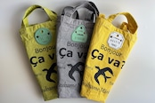 布はすべて当店で手染めで丁寧に染めています。プリントはシルクスクリーンで版下を作り、すべてハンドメイドで制作しています。色の違いや染めムラなどがあり、どのバッグも同じ仕上がりのものはありません。それぞれ趣をお楽しみ頂けると幸いです。週末のサイクリングやショッピングのお供に是非いかがでしょうか!