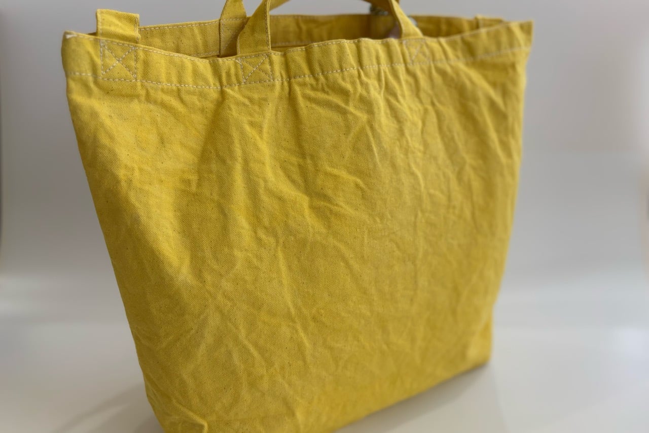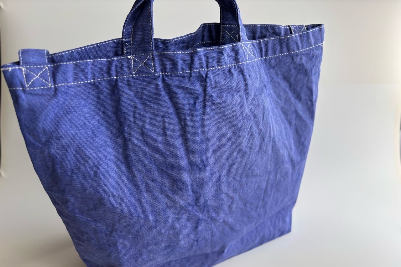 サイクリングトートは斜め掛けと手持ちの2wayタイプになっていて、自転車に乗るときはカバンを後ろにまわしてお使いいただくといい感じです。素材は厚めのコットンでハリ感のある生地を採用していています。