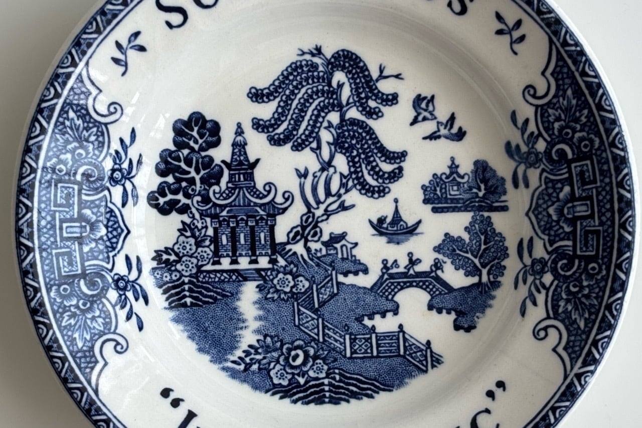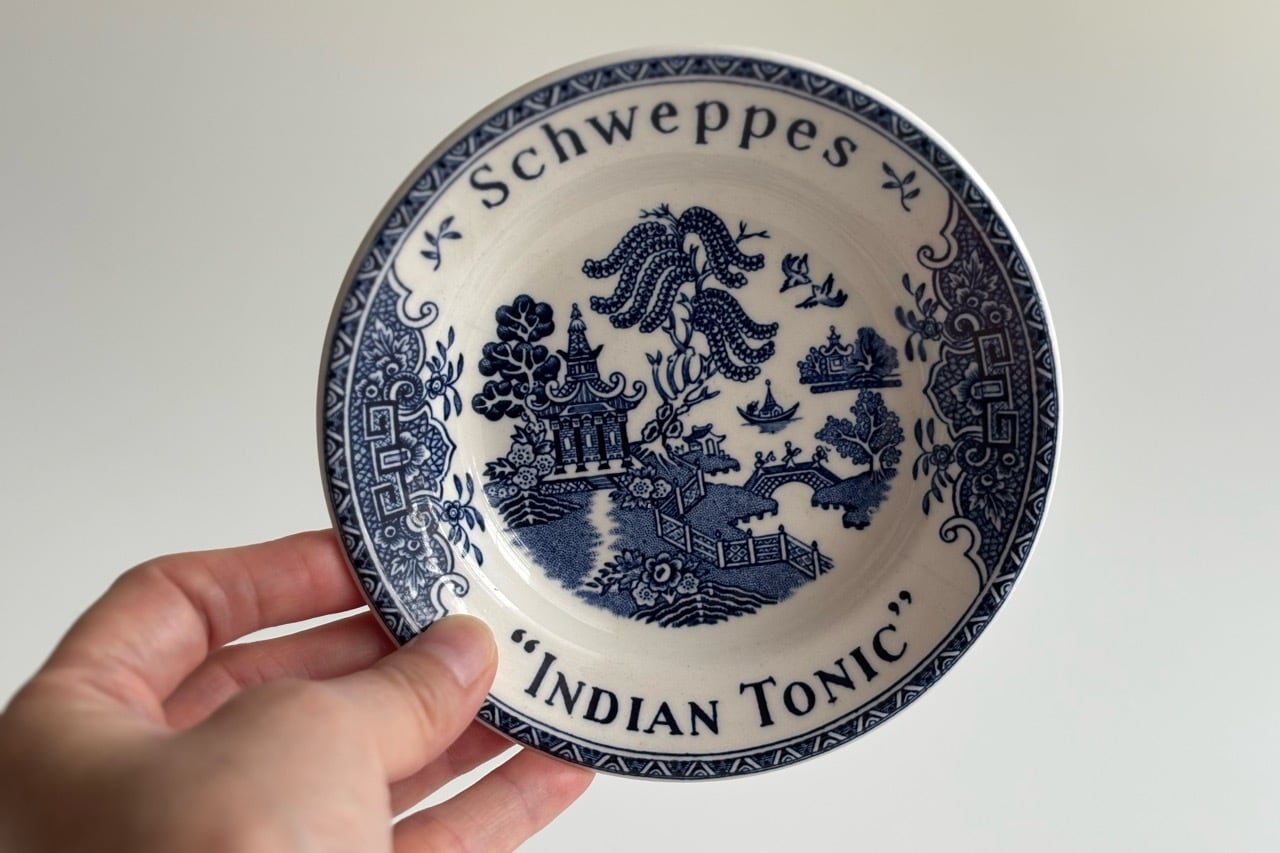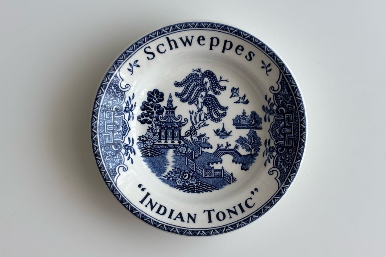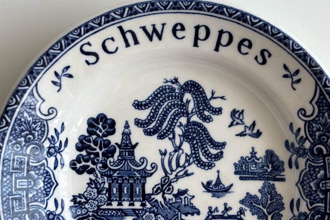 炭酸水のSchweppes 社がノベルティーとして伝統的なWillow Patternを用いて制作したもので、陶器制作はユニコーンマークのEnoch Wedgwood社。