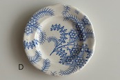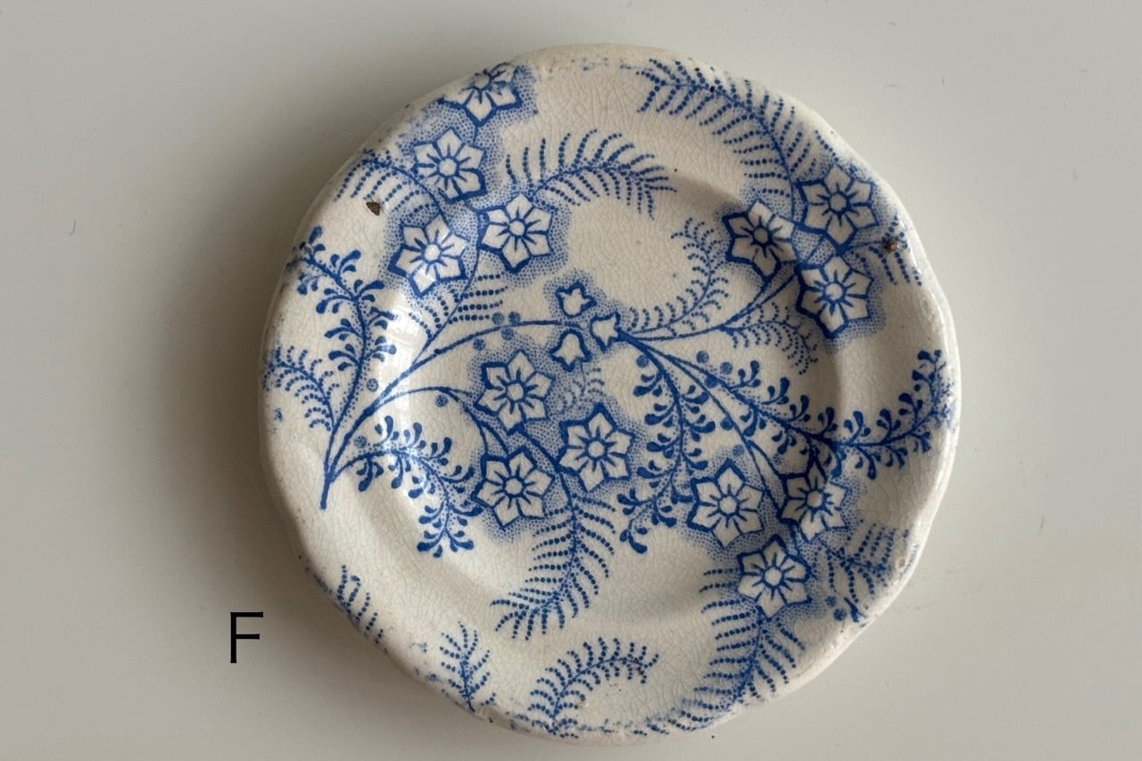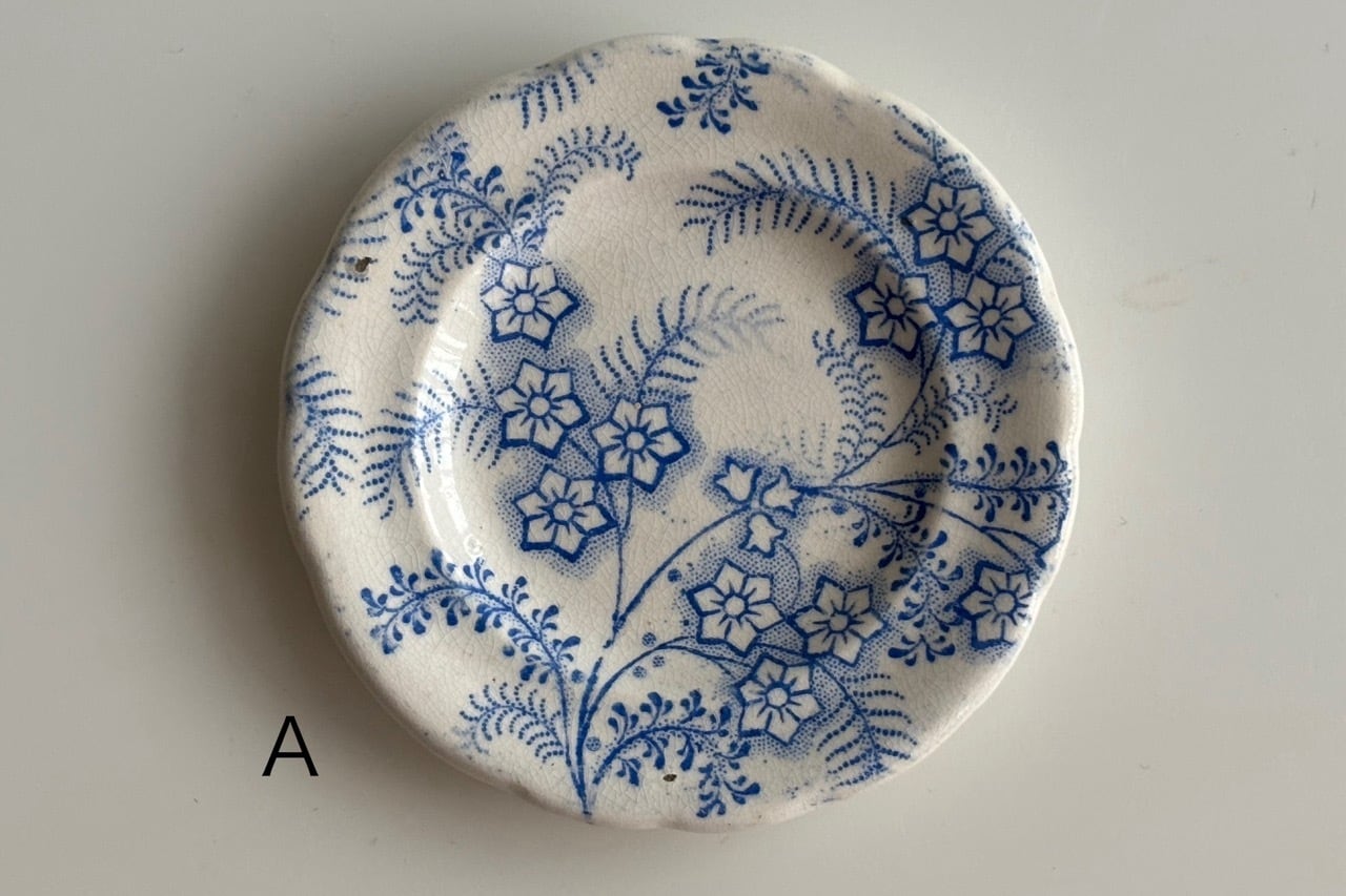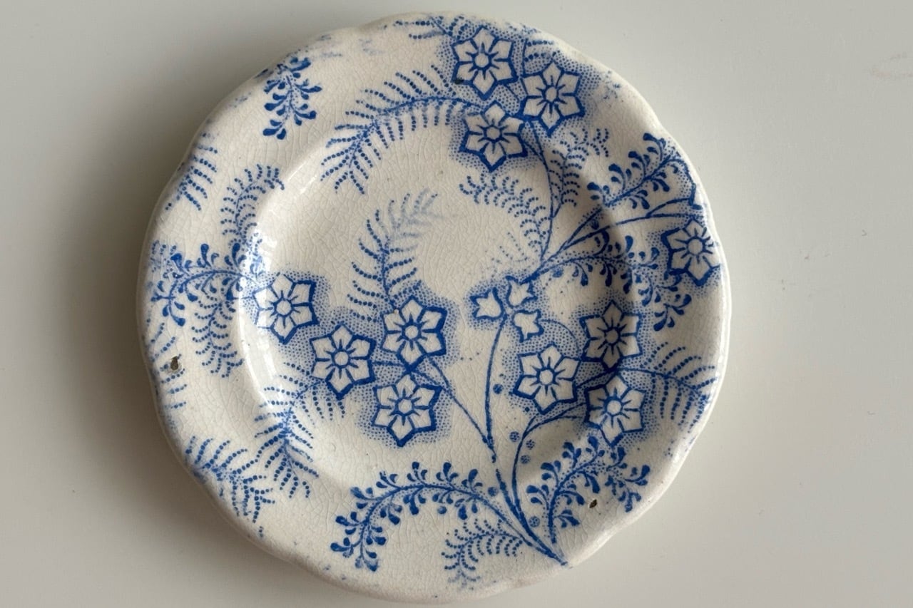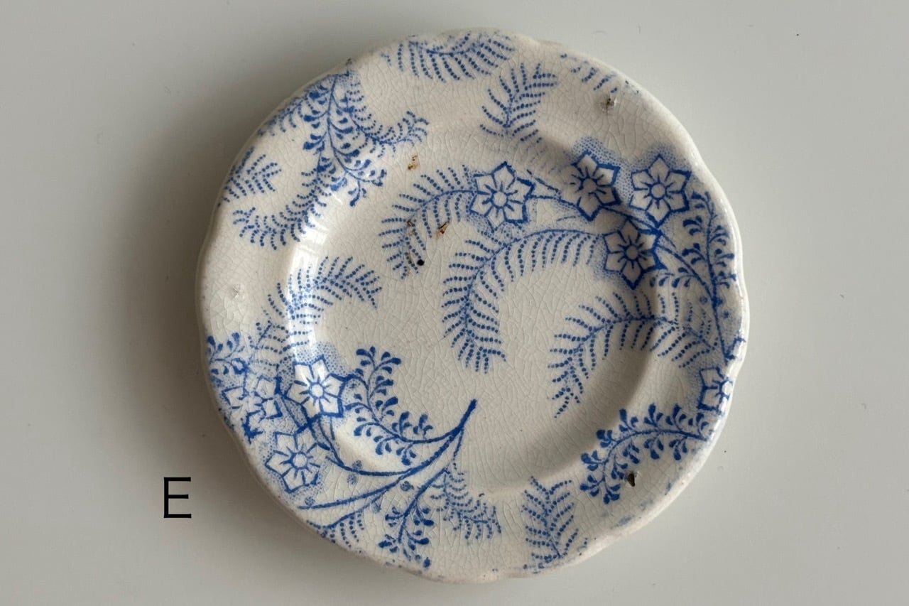 白地に薄水色のナズナとシダのような草木と小さなお花柄がとてもチャーミングなデザイン。かなり古いもので白地の陶器には細かな貫入が見られ、年代を感じさせます。