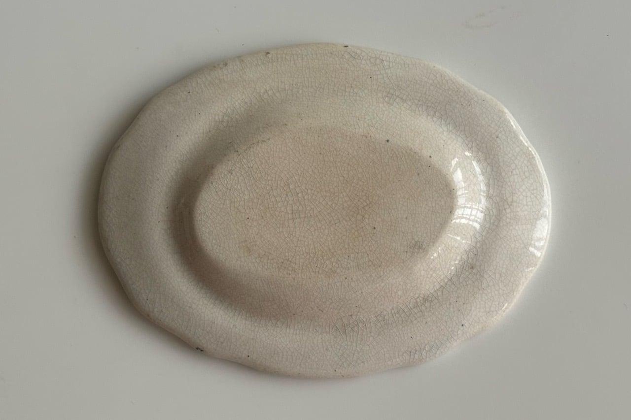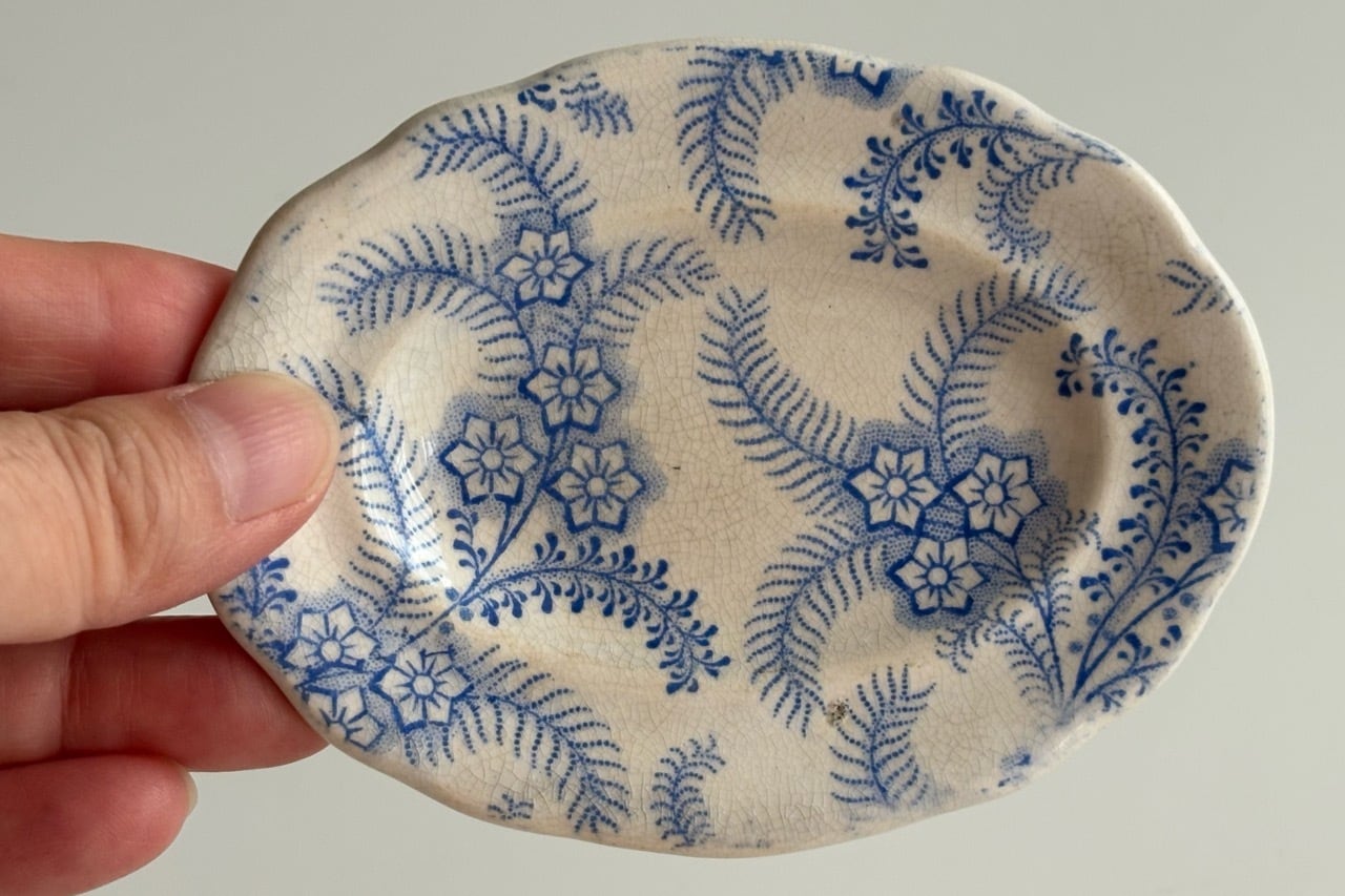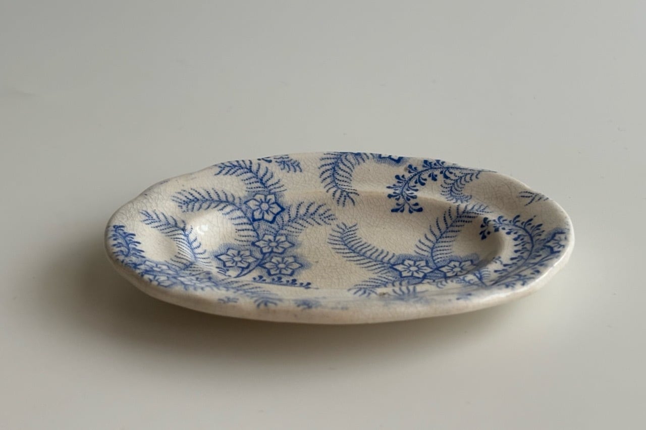 白地に薄水色のナズナとシダのような草木と小さなお花柄がとてもチャーミングなデザイン。かなり古いもので白地の陶器には細かな貫入が見られ、年代を感じさせます。