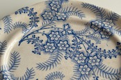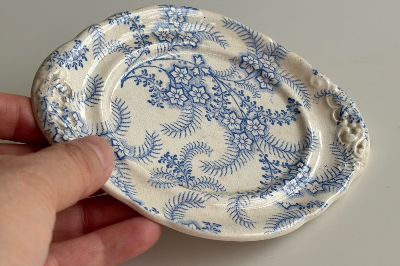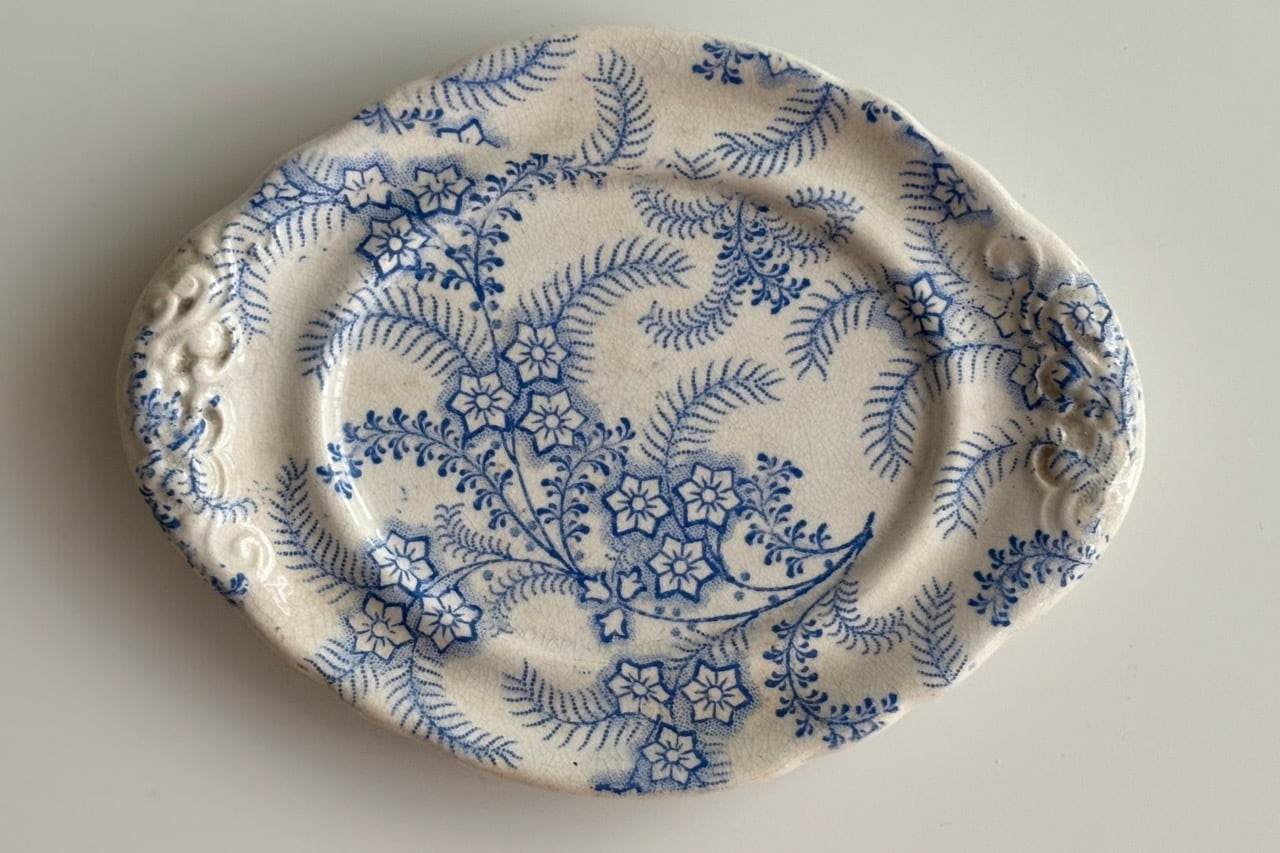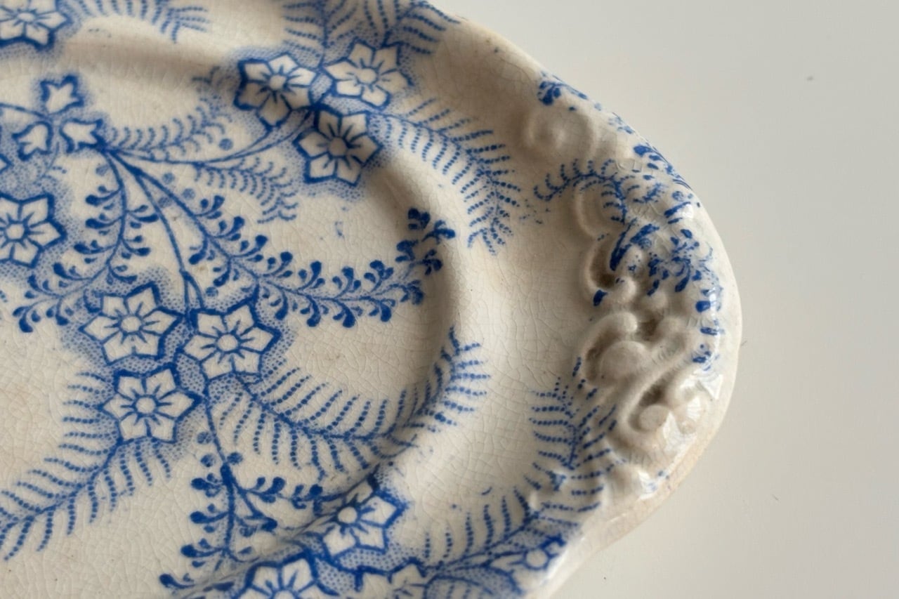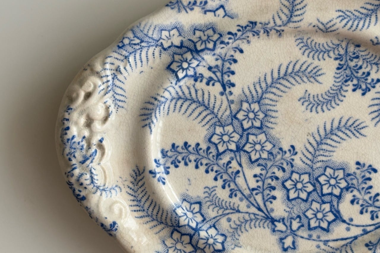 白地に薄水色のナズナとシダのような草木と小さなお花柄がとてもチャーミングなデザイン。かなり古いもので白地の陶器には細かな貫入が見られ、年代を感じさせます。
