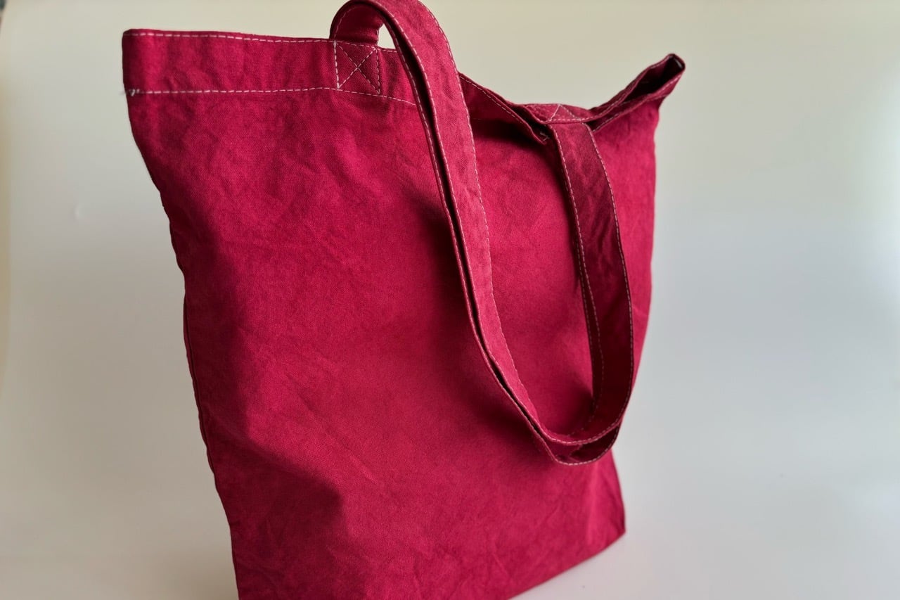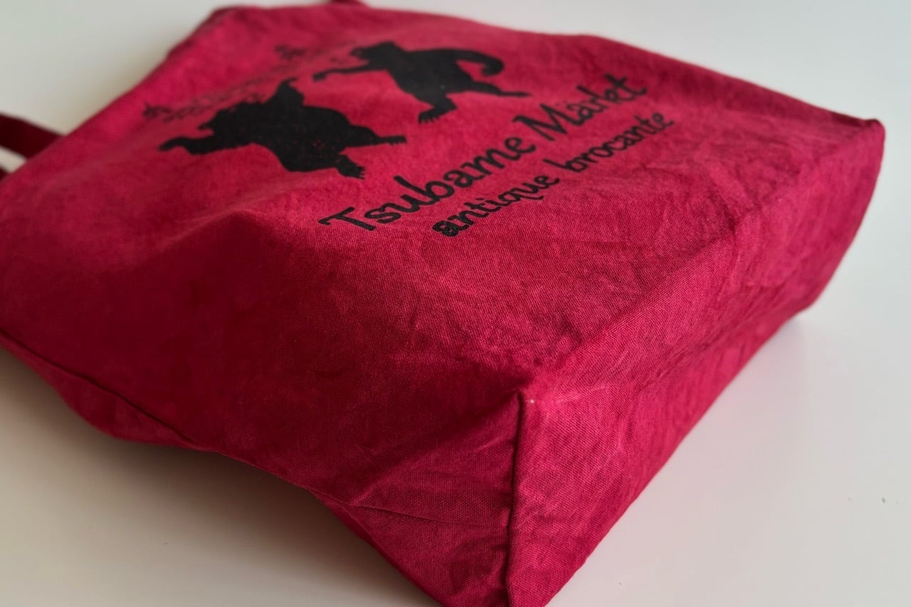 当店のトートバッグはミドルサイズで持ち手が長めでゆったりと肩から掛けられます。底面のマチが10cm程あり、A4サイズが横向きに入れられるのも大変使いやすいです。