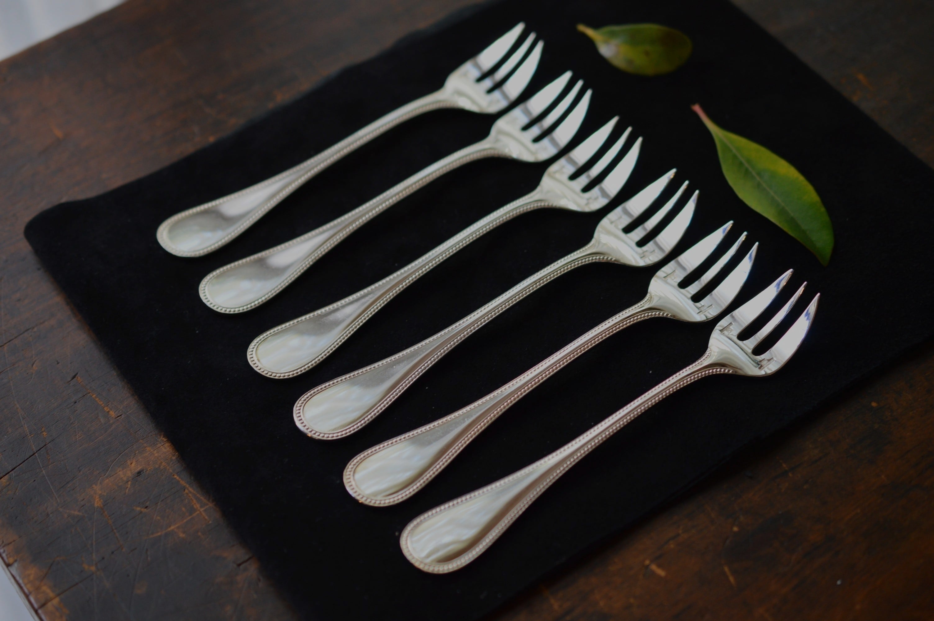 そして、クリストフルのモデルパールのオイスターフォークは特別で中々出会えないアイテムのひとつです。現在のクリストフルのラインアップにも、オイスターフォークは無くなってしまったので、益々希少になっています。