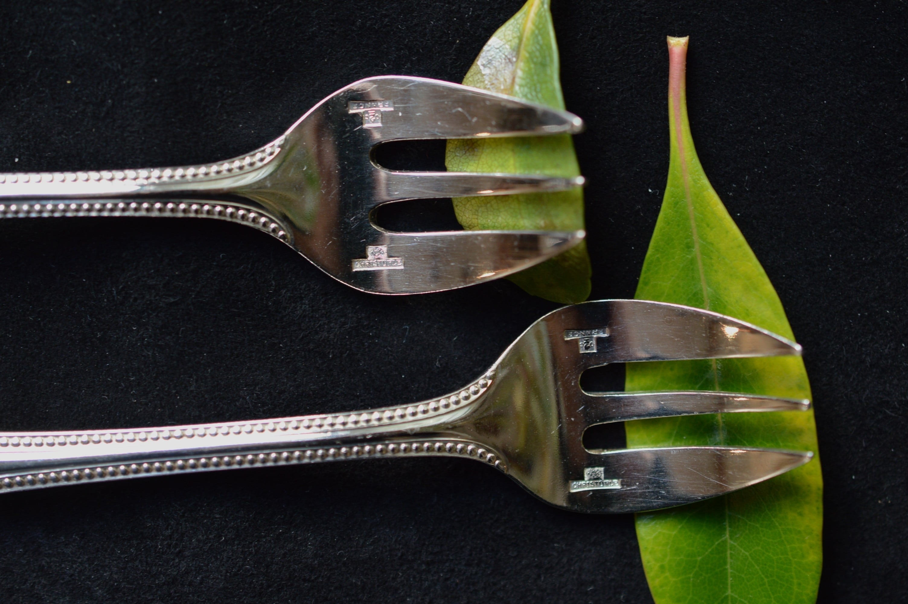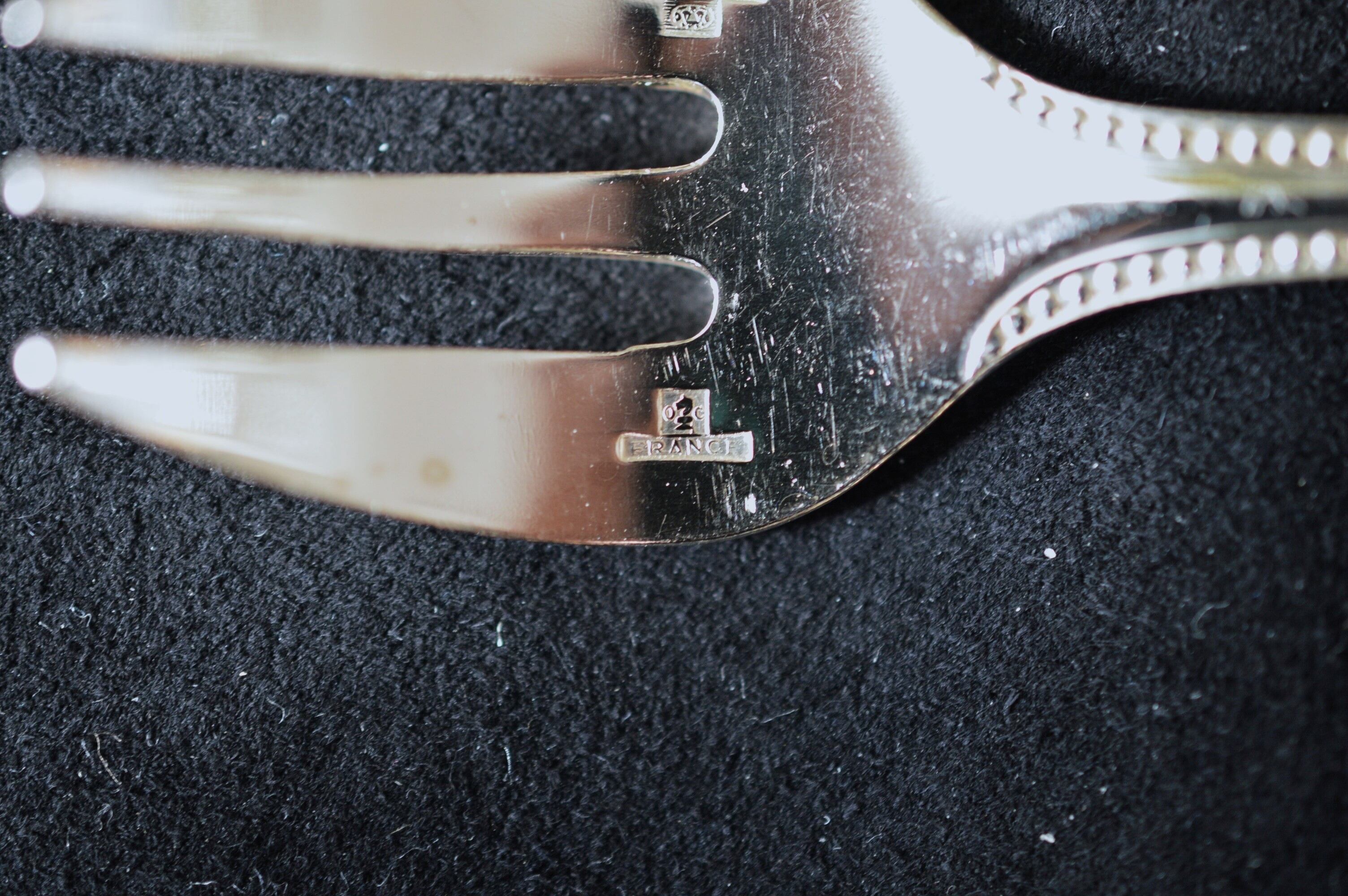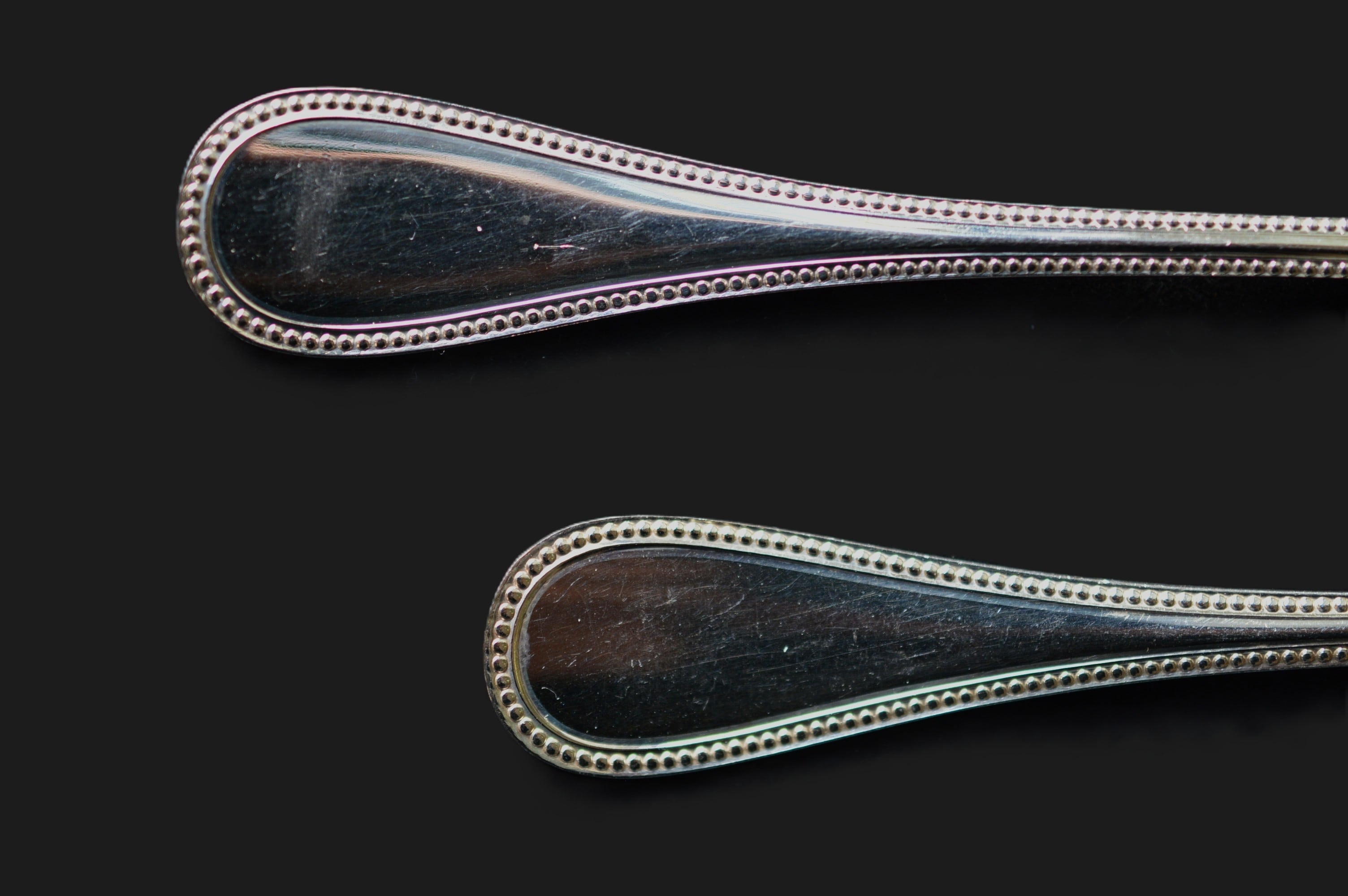 パールドットのオールドスタイルなデザインにとても魅かれます。特にクリストフルのモデル・パールは気品があり、上質なシルバーコーティングが施されているためいつまでもシルバーの光沢があって美しいです。