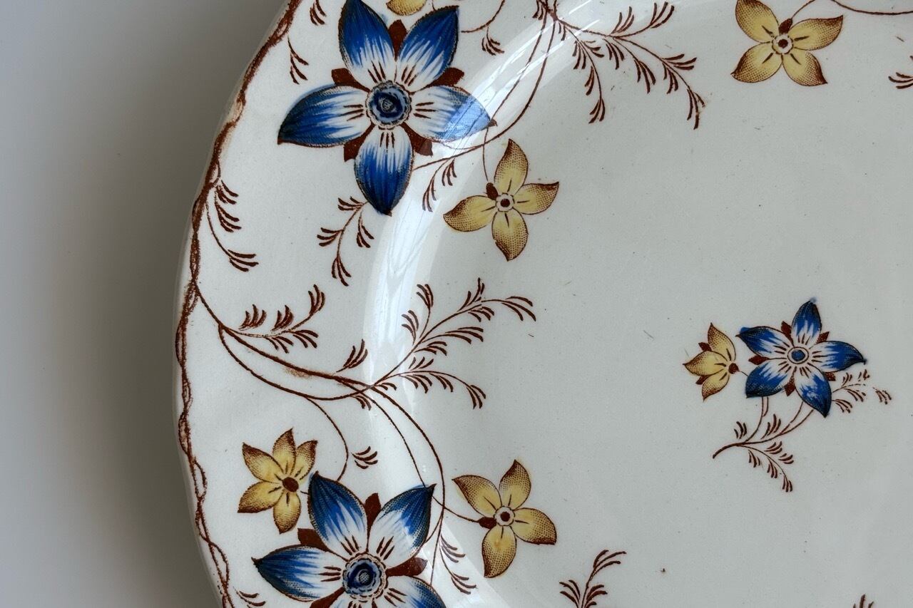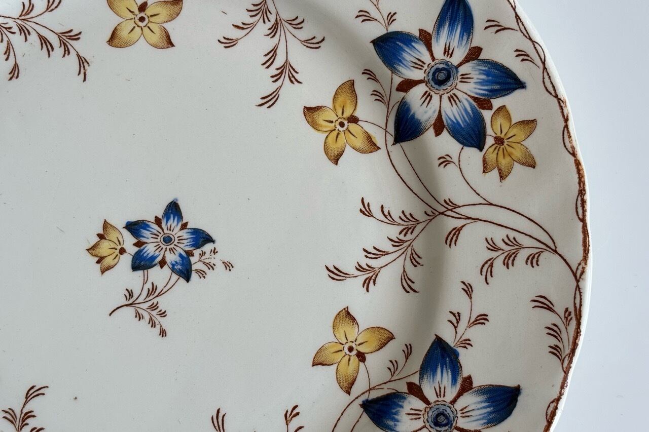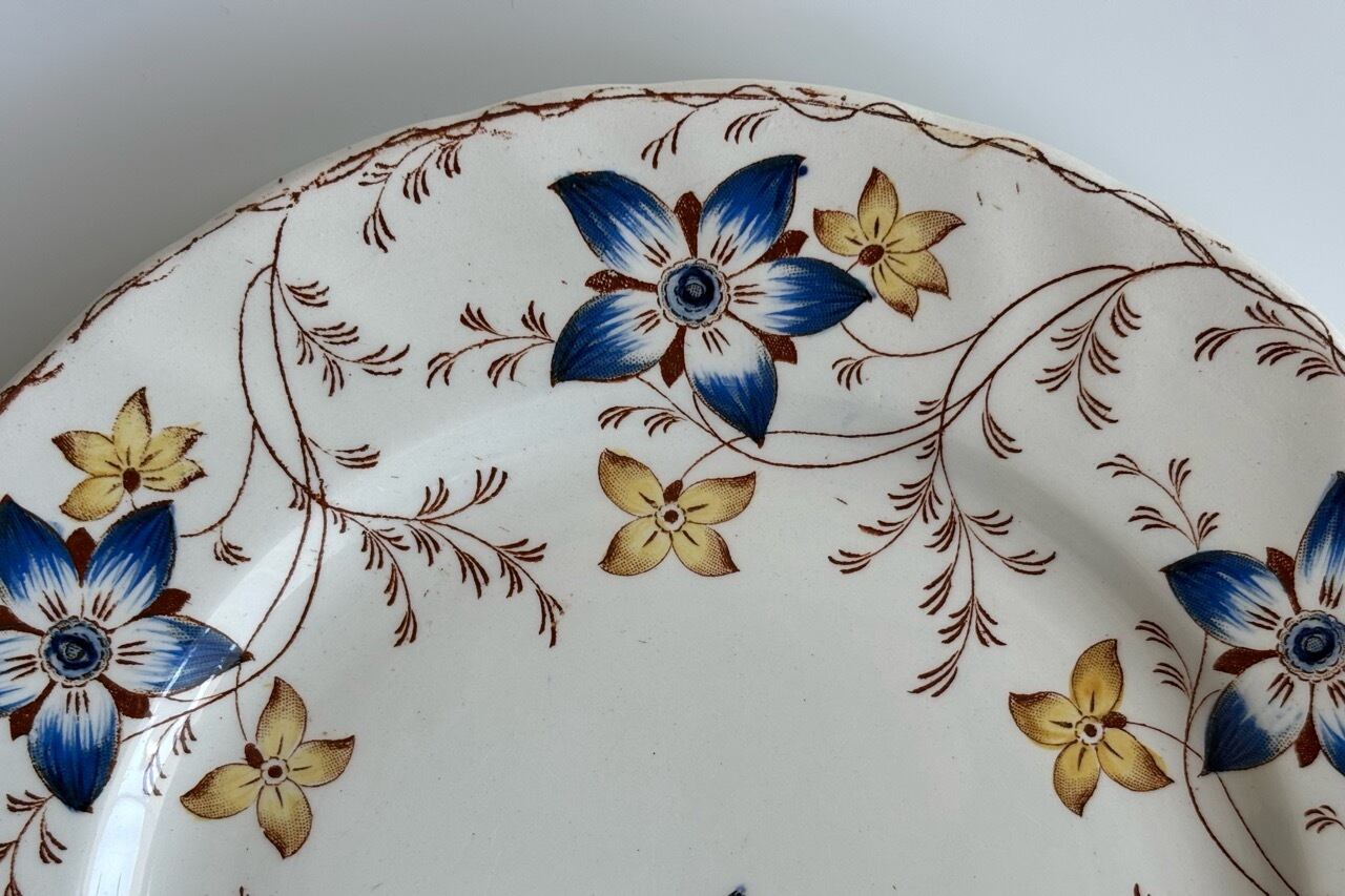 青と黄色の大小のお花がプレートいっぱいに飾られています。美しく多色彩で描かれていて、セピア色の絵付けが施されています。状態は非常に良好です。