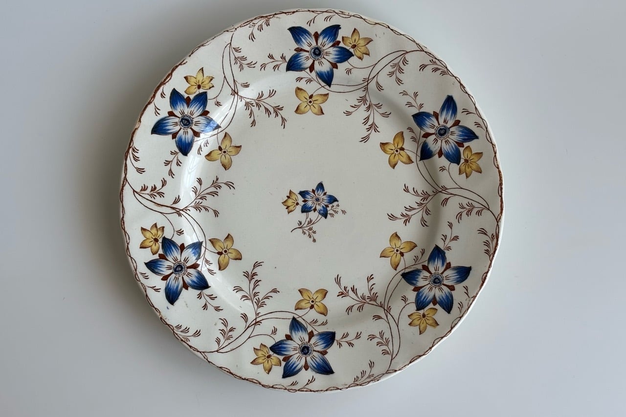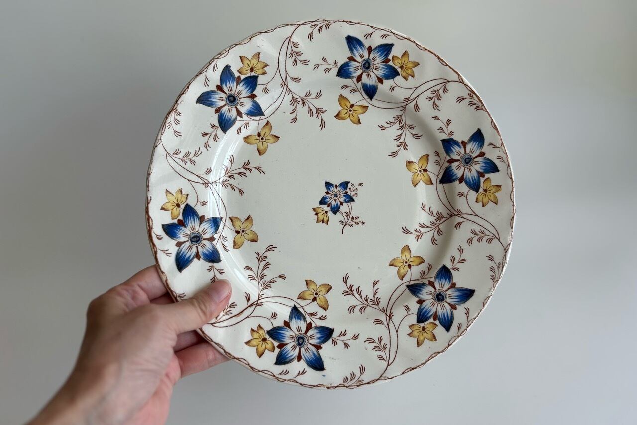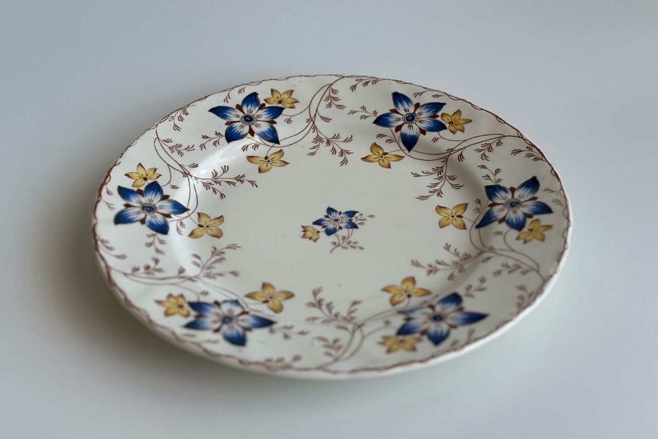 青と黄色の大小のお花がプレートいっぱいに飾られています。美しく多色彩で描かれていて、セピア色の絵付けが施されています。状態は非常に良好です。