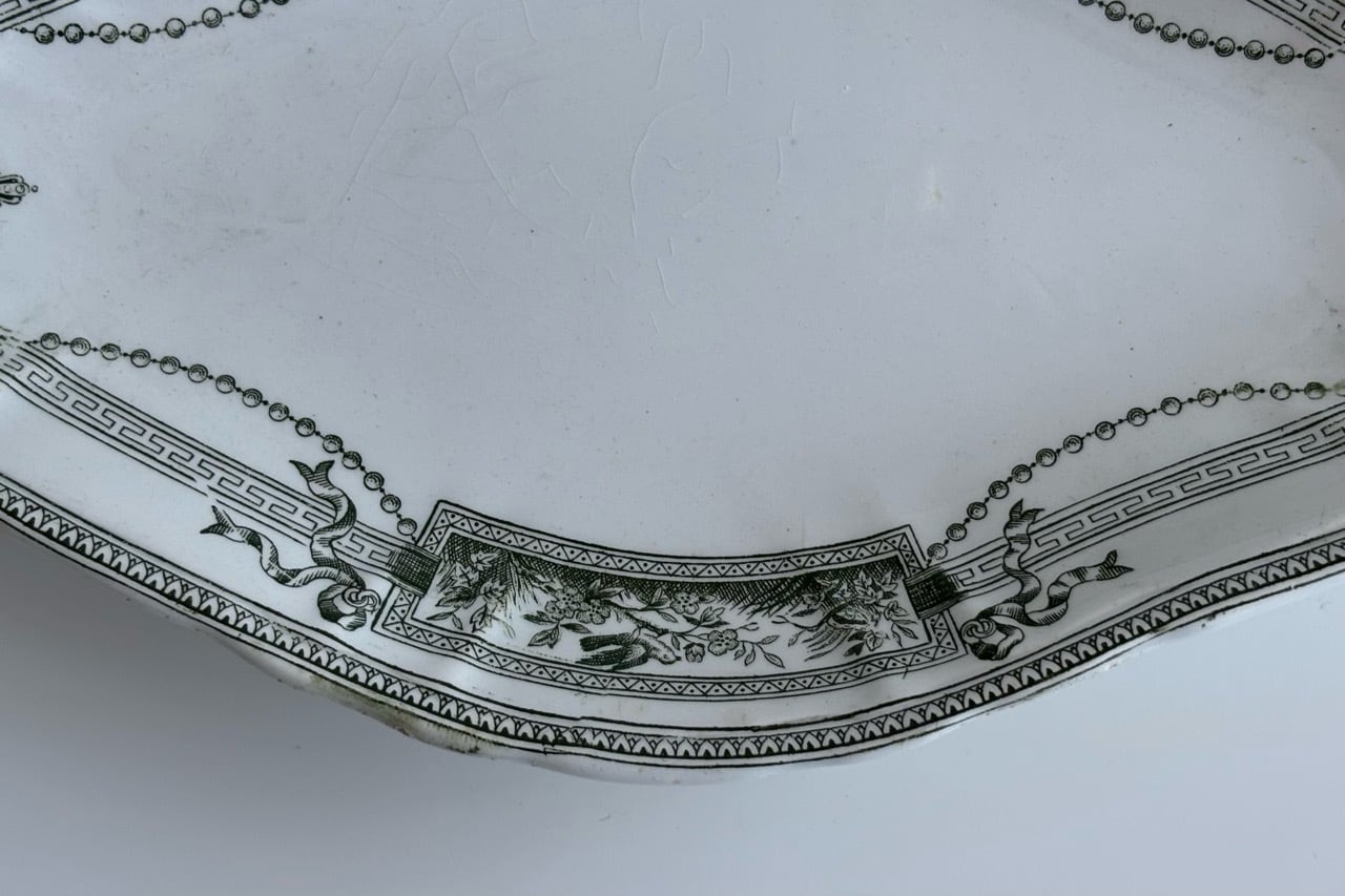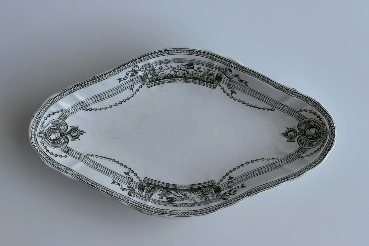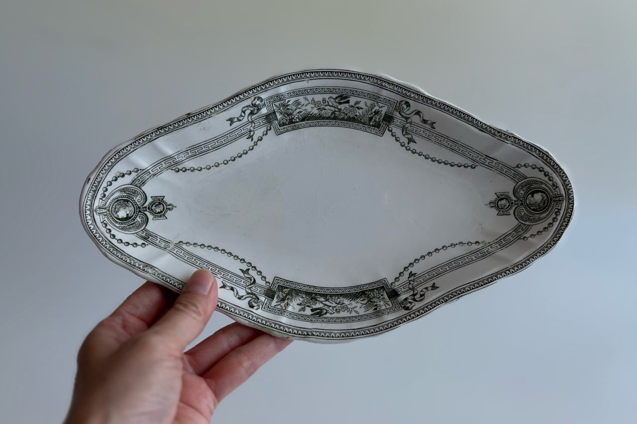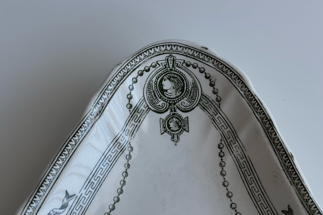 サン・タマンのメダイヨン(MEDAILLON)の terre de fer のラヴィエ。18世紀後半から19世紀初頭にヨーロッパで流行した新古典主義を意識したデザインが特徴です。淡い緑色の装飾に小さな挿絵入りのカルトゥーシュが施されています。