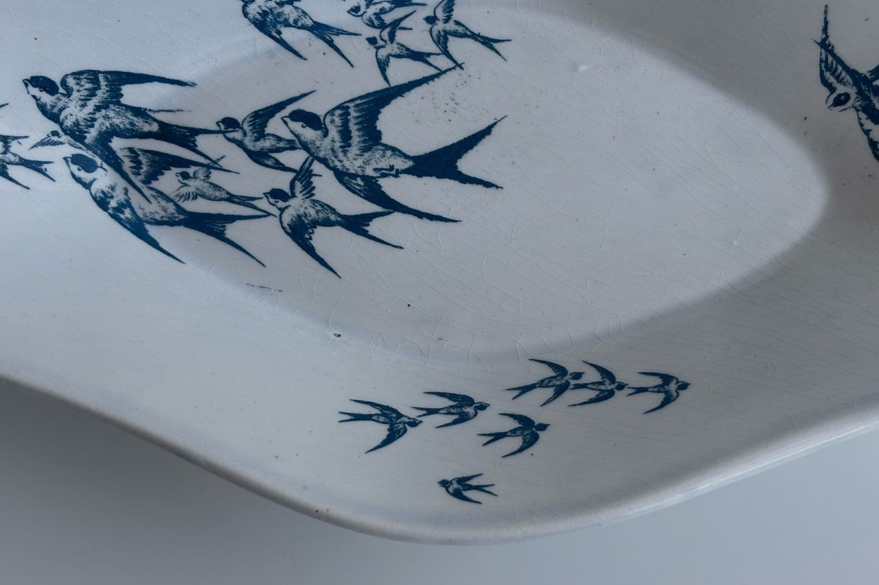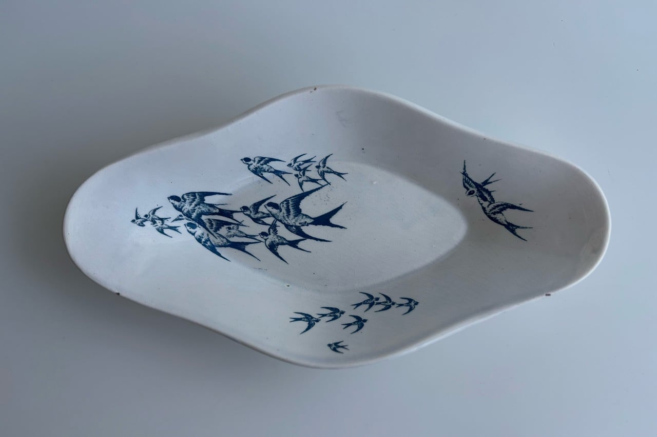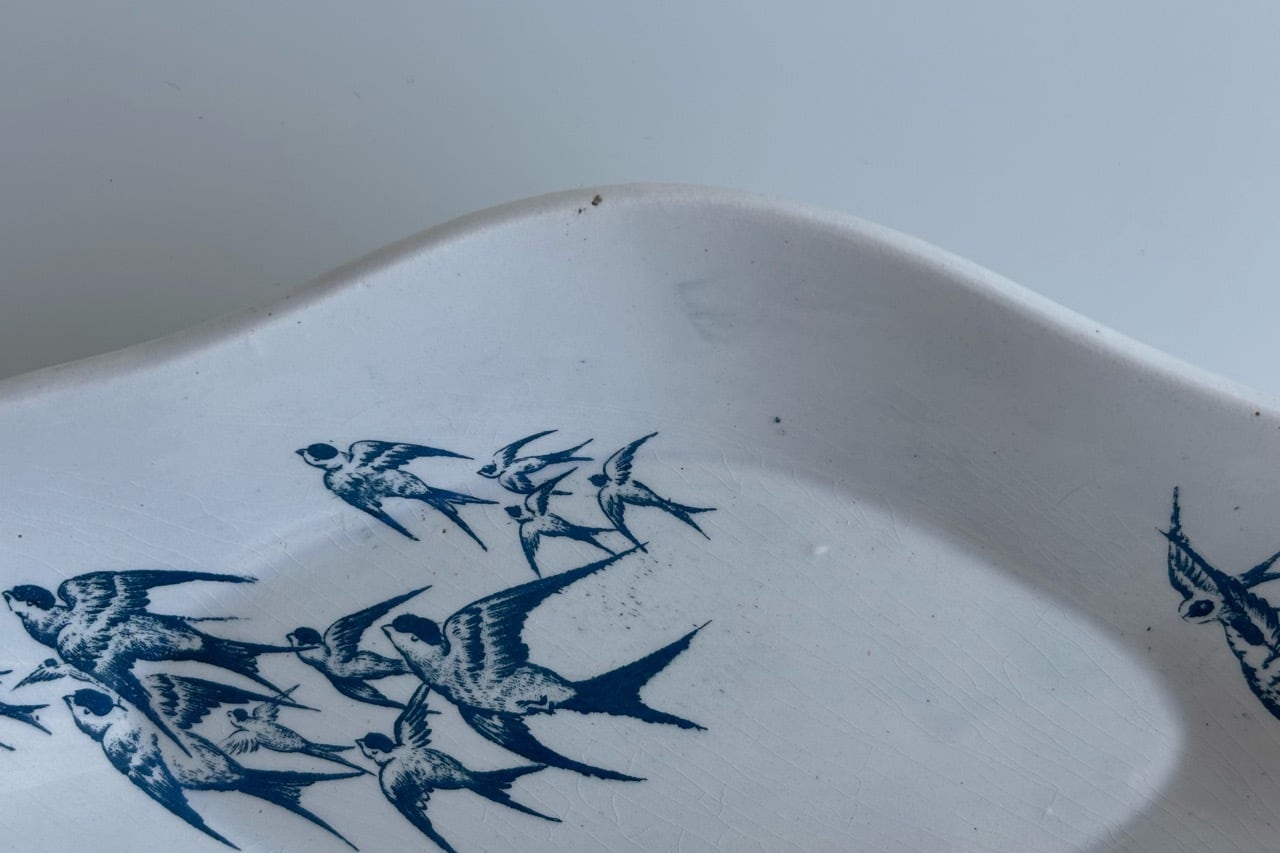 青緑色で描かれたツバメの群れは、湖面の上を飛んでいるのでしょうか。その風景がそのまま陶版の上に飛び交うツバメたちとして描かれています。