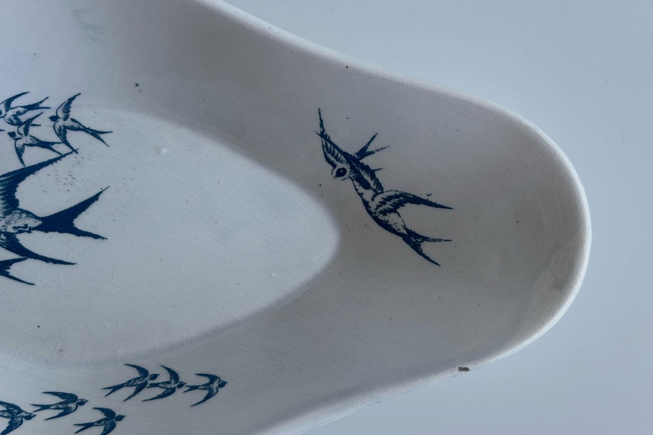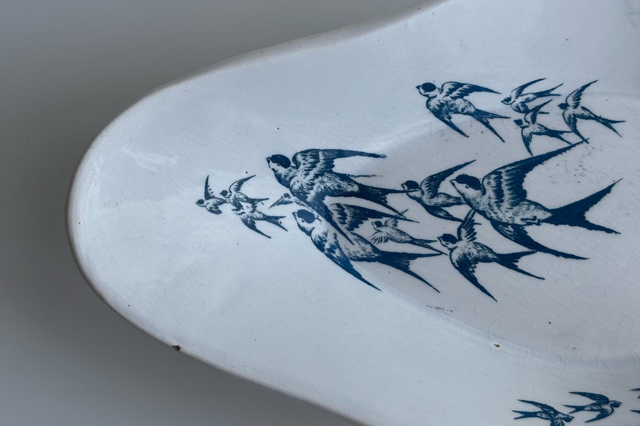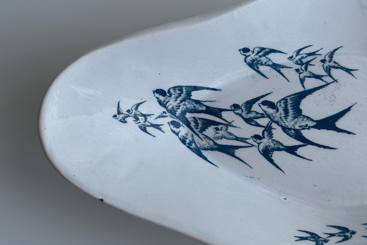 青緑色で描かれたツバメの群れは、湖面の上を飛んでいるのでしょうか。その風景がそのまま陶版の上に飛び交うツバメたちとして描かれています。