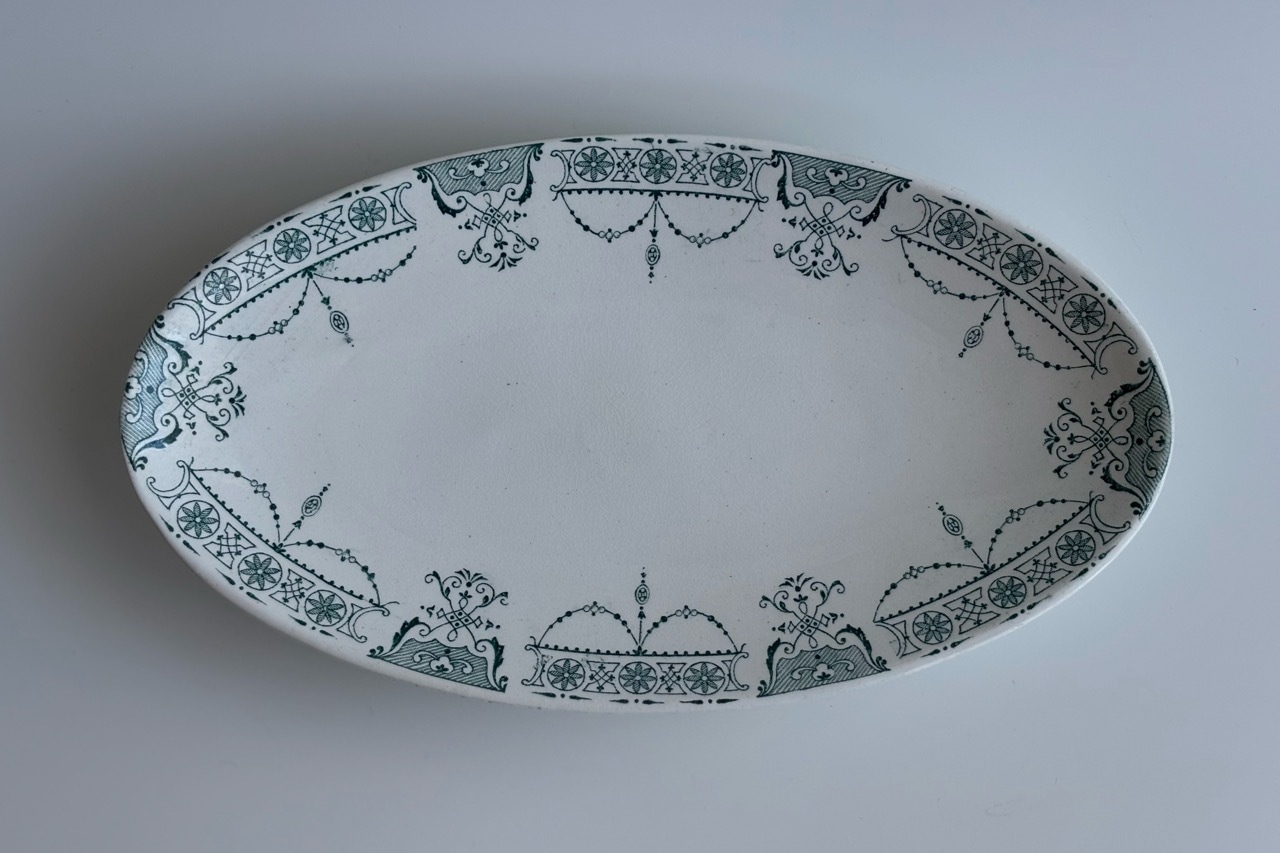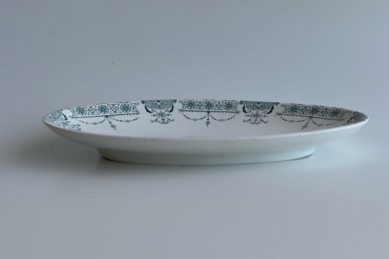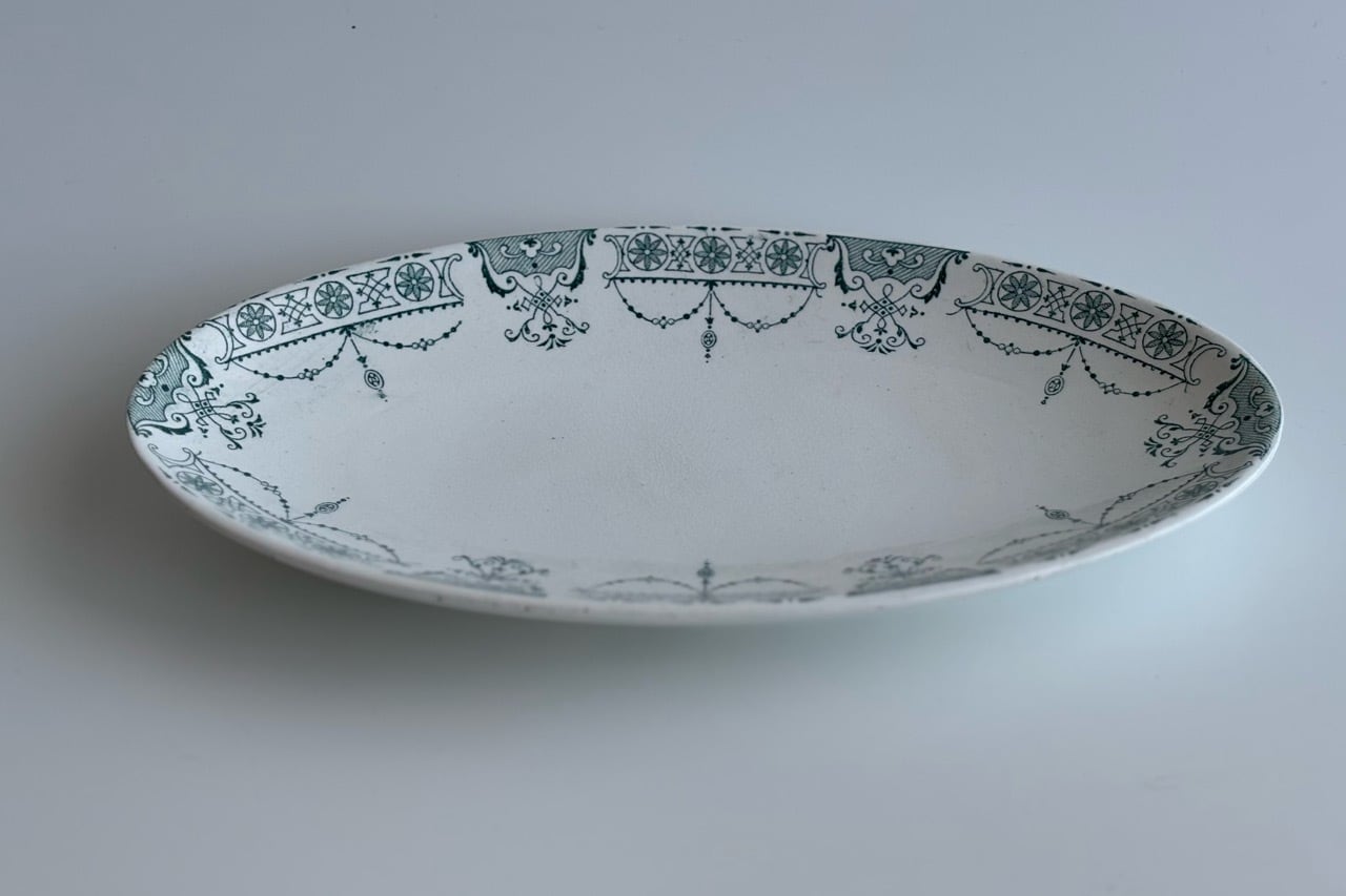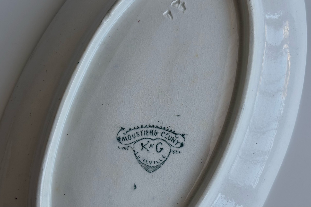 フランスの古窯、Lunéville KG による楕円形のラヴィエ。ムスティエ・クリュニーモデル。terre de fer(半陶器半磁器)で作られてます。花リボンと幾何学的なモチーフを組み合わせた古典的なガーランド模様が緑まわりを飾っています。1900年前後の作陶品と思われます。