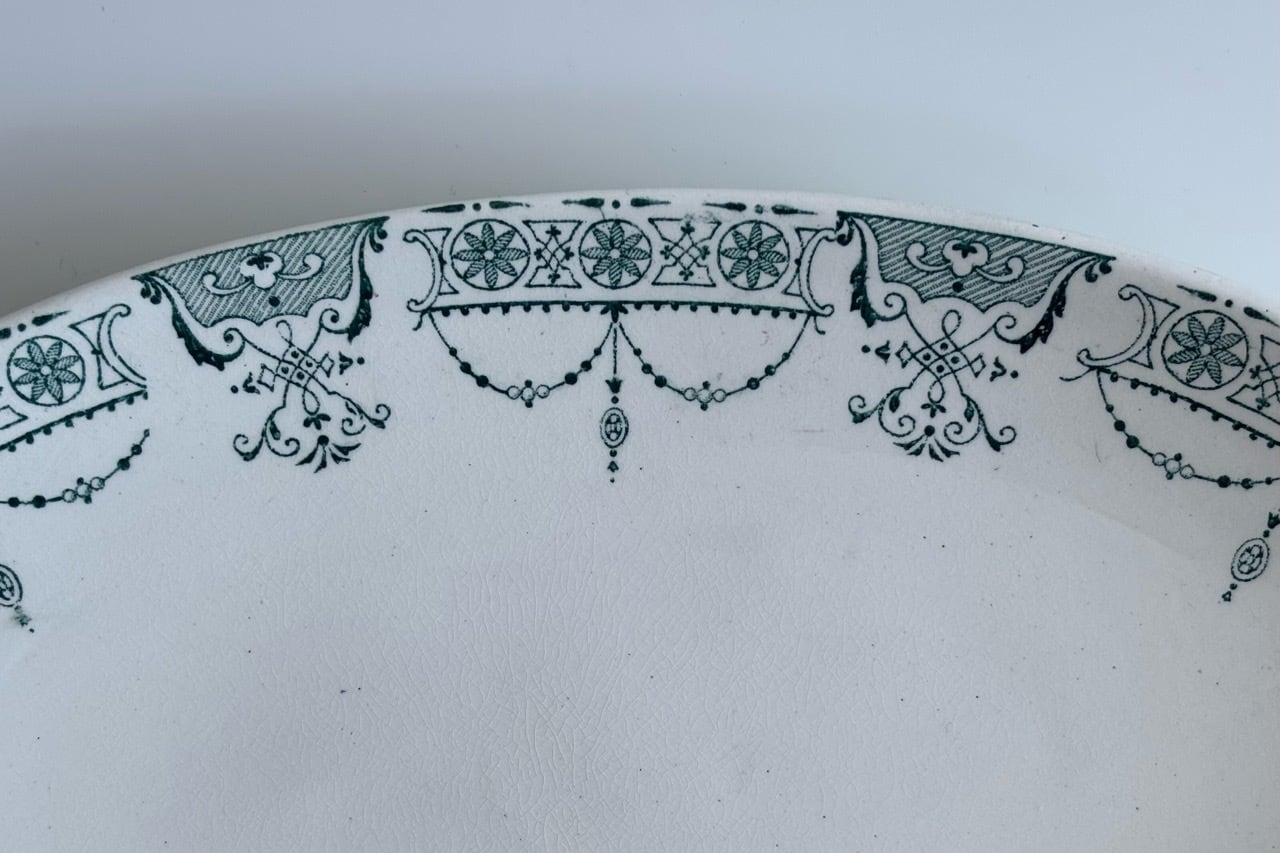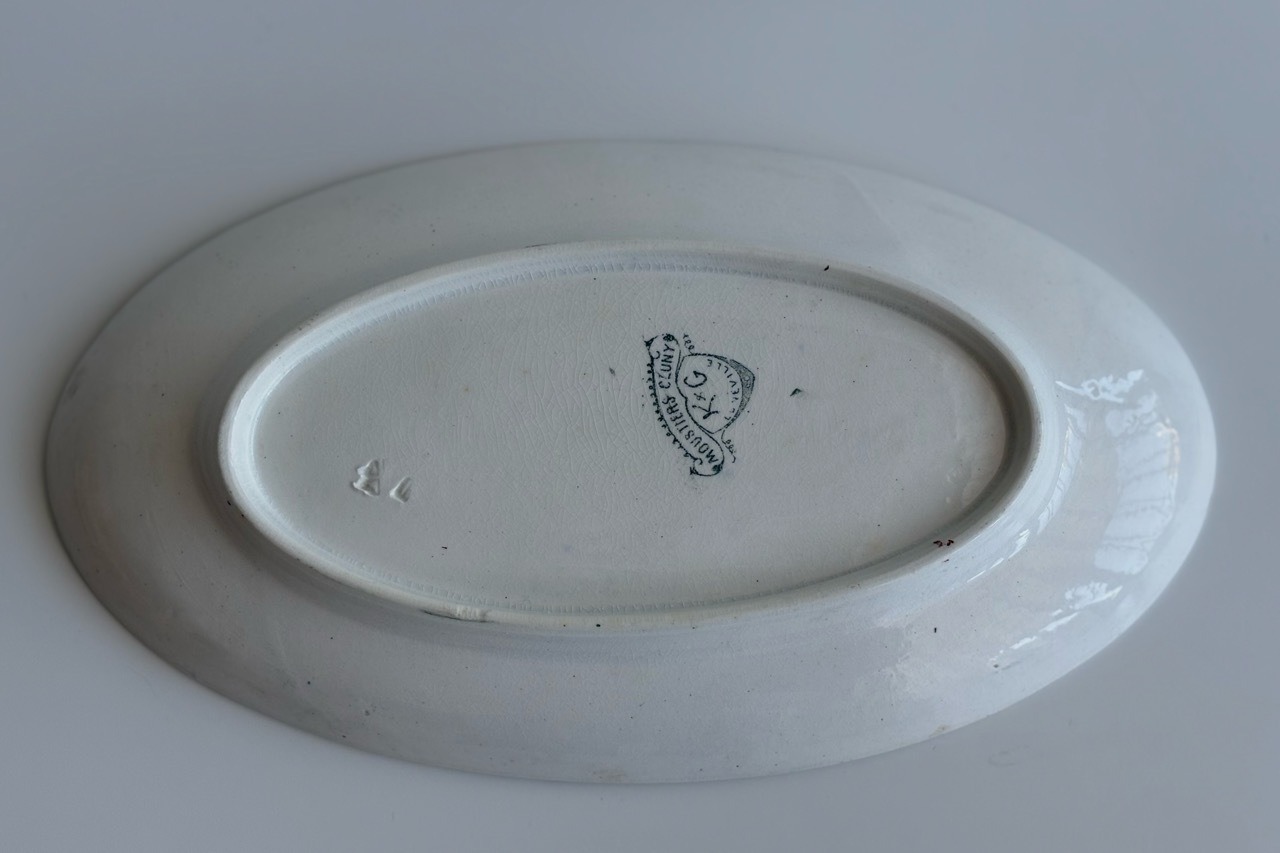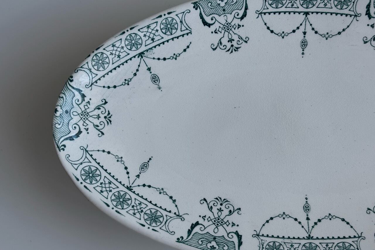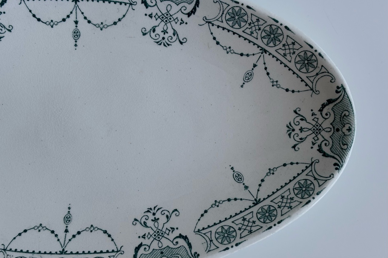 フランスの古窯、Lunéville KG による楕円形のラヴィエ。ムスティエ・クリュニーモデル。terre de fer(半陶器半磁器)で作られてます。花リボンと幾何学的なモチーフを組み合わせた古典的なガーランド模様が緑まわりを飾っています。1900年前後の作陶品と思われます。