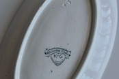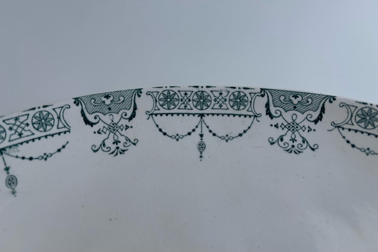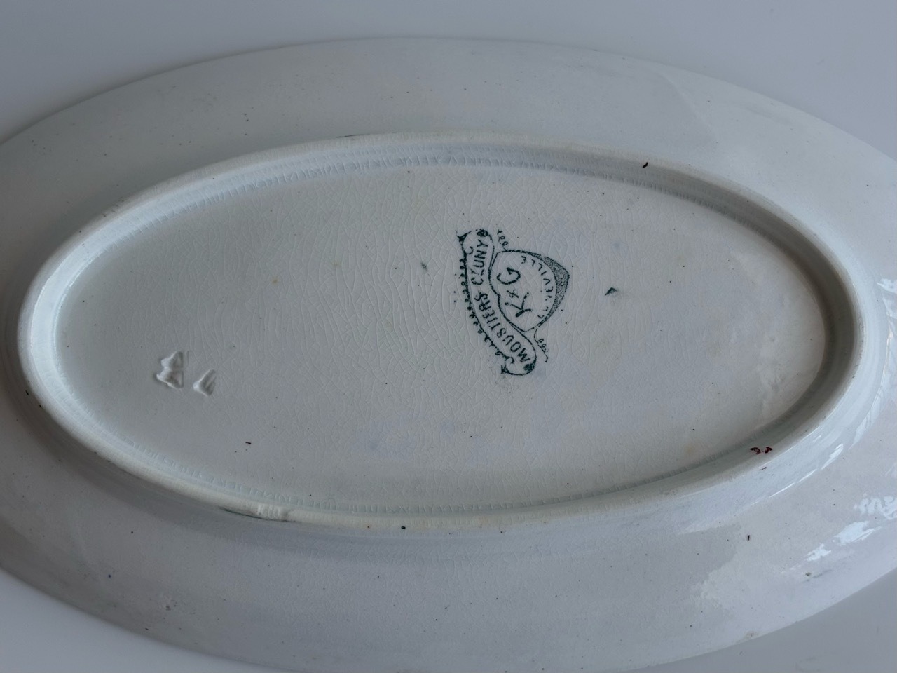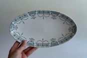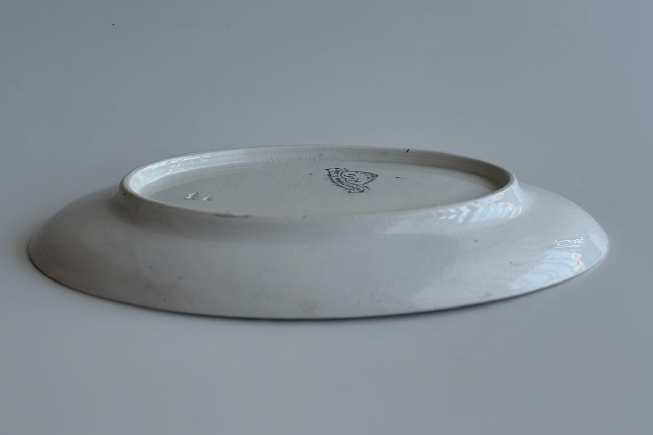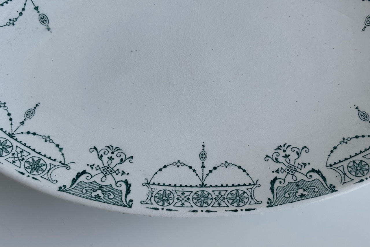 フランスの古窯、Lunéville KG による楕円形のラヴィエ。ムスティエ・クリュニーモデル。terre de fer(半陶器半磁器)で作られてます。花リボンと幾何学的なモチーフを組み合わせた古典的なガーランド模様が緑まわりを飾っています。1900年前後の作陶品と思われます。