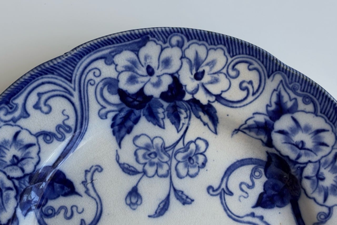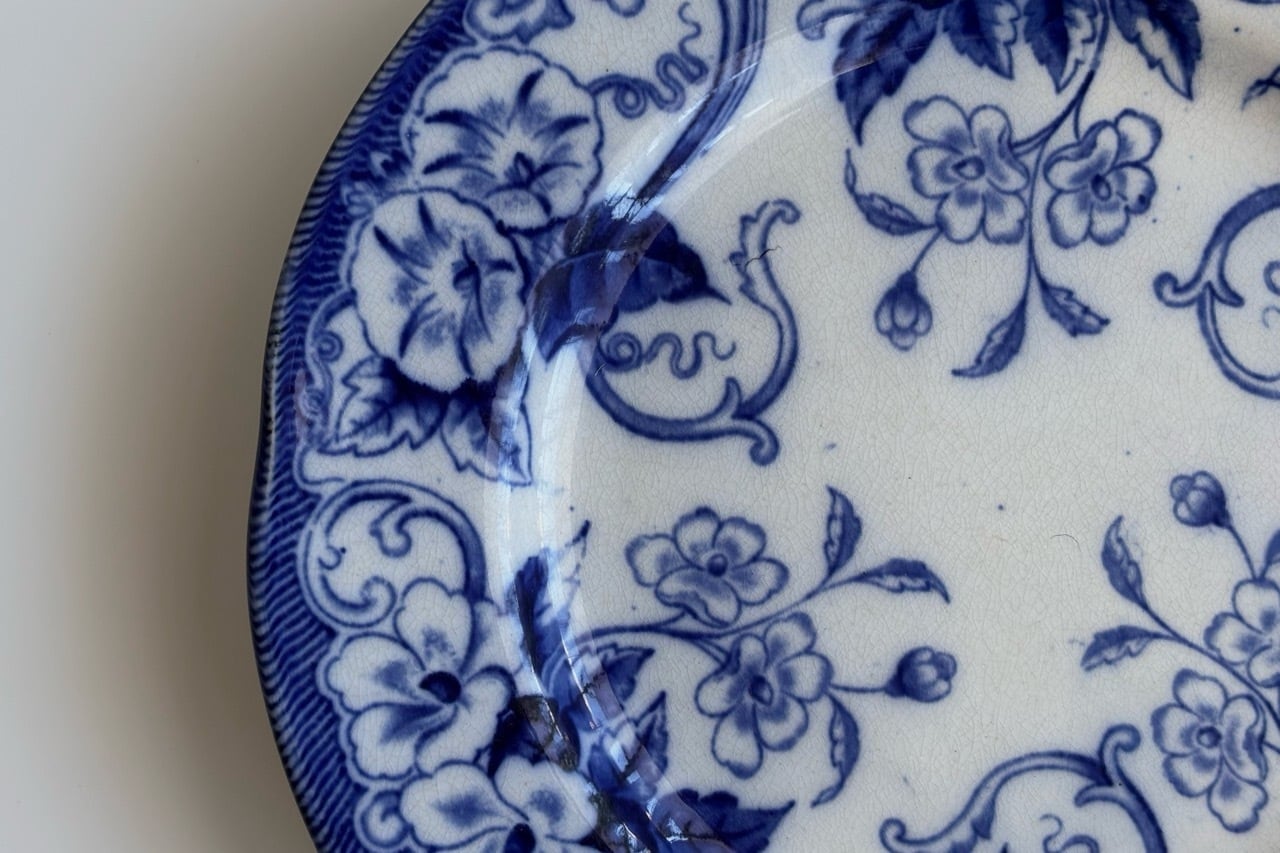 カマイユブルーで絵付けされた昼顔の花は縁の深い青の縞模様で強調され、より強い印象をもたらしています。フローラシリーズは1855年のパリ万国博覧会で発表されて以来、クレイユ&モントローが世界の名陶と呼ばれるようになった代表作のひとつです。ベル・エポックの名作としてその美しさは長く愛され続けています。