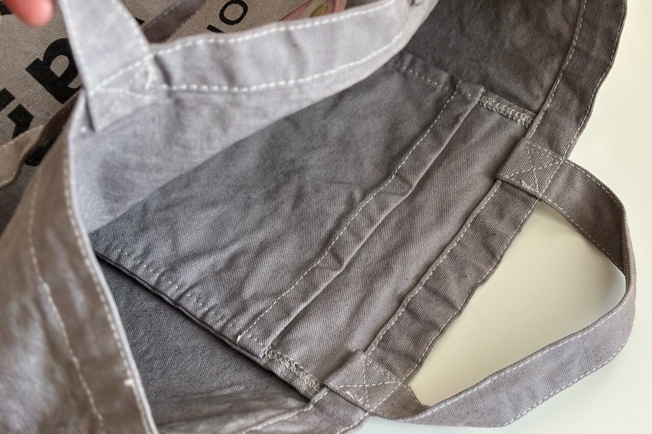 素材は厚めのコットンでハリ感のある生地を採用しています。内側にひとつポケットが付いていて、ハンカチ、鍵、スマホ、リップなどこまかいものを入れるのに便利です。