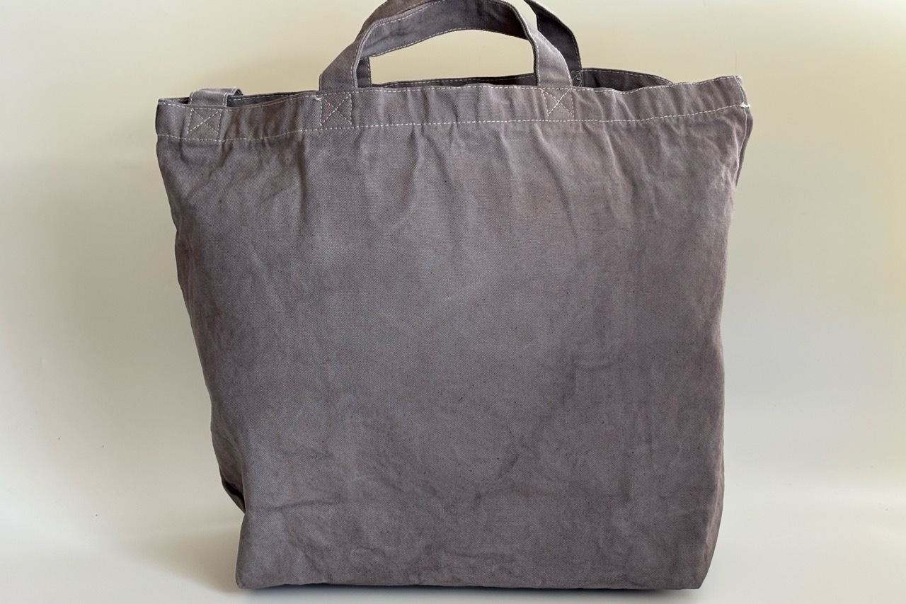 染め色は、ブラウン、グレージュ、パールグレー、バイオレットグレーの4色で、プレートが引き立つ落ち着いた色にしました。プレートを全部違うデザインのものを使っているので、今回のトートバッグはすべて同じ物の無い一点ものになります。