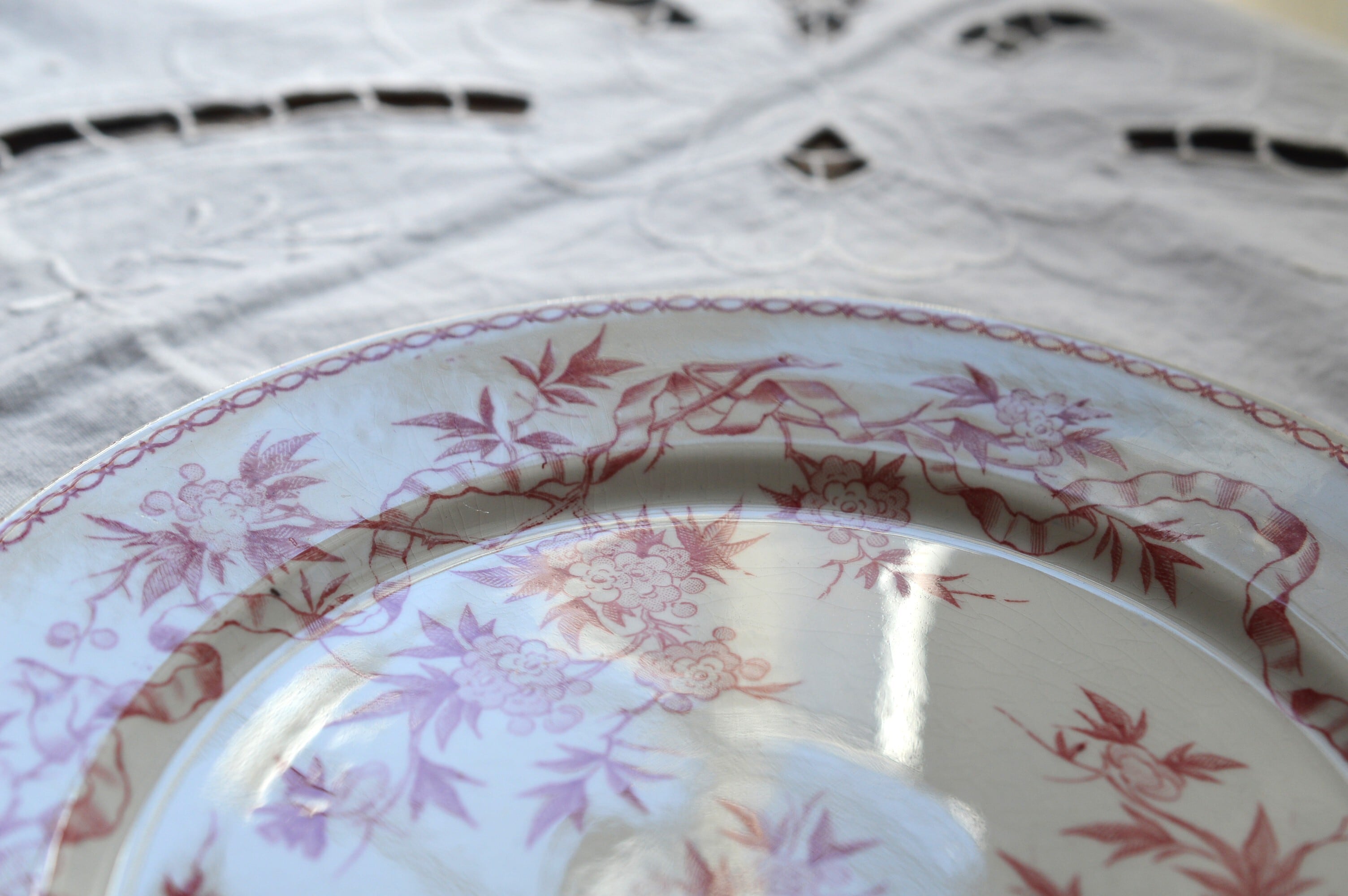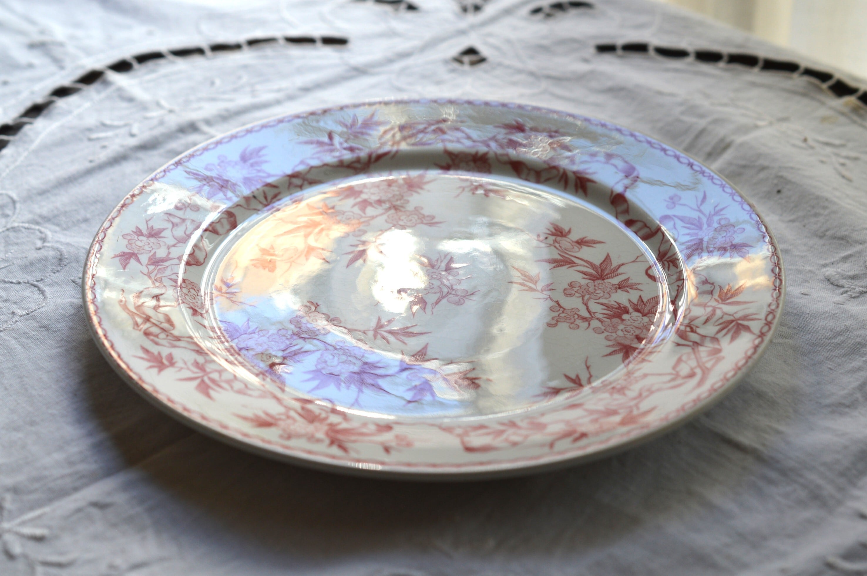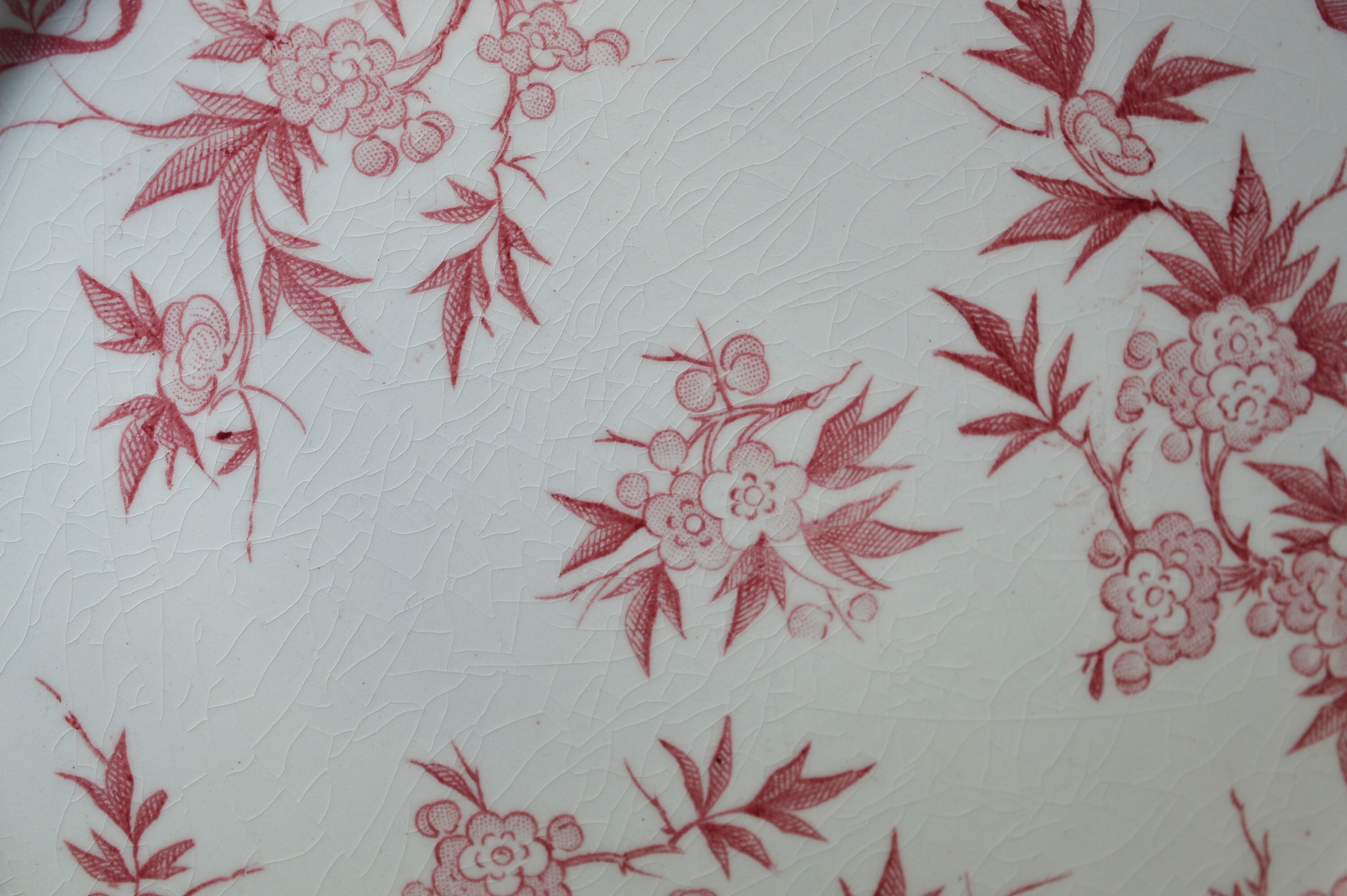 淡いピンクの転写プレートです。個体によって経年変化による僅かな染みや貫入が所々に見られますが、ヒビやクラックなども無く大変良好な状態です。詳細は写真でご確認ください。