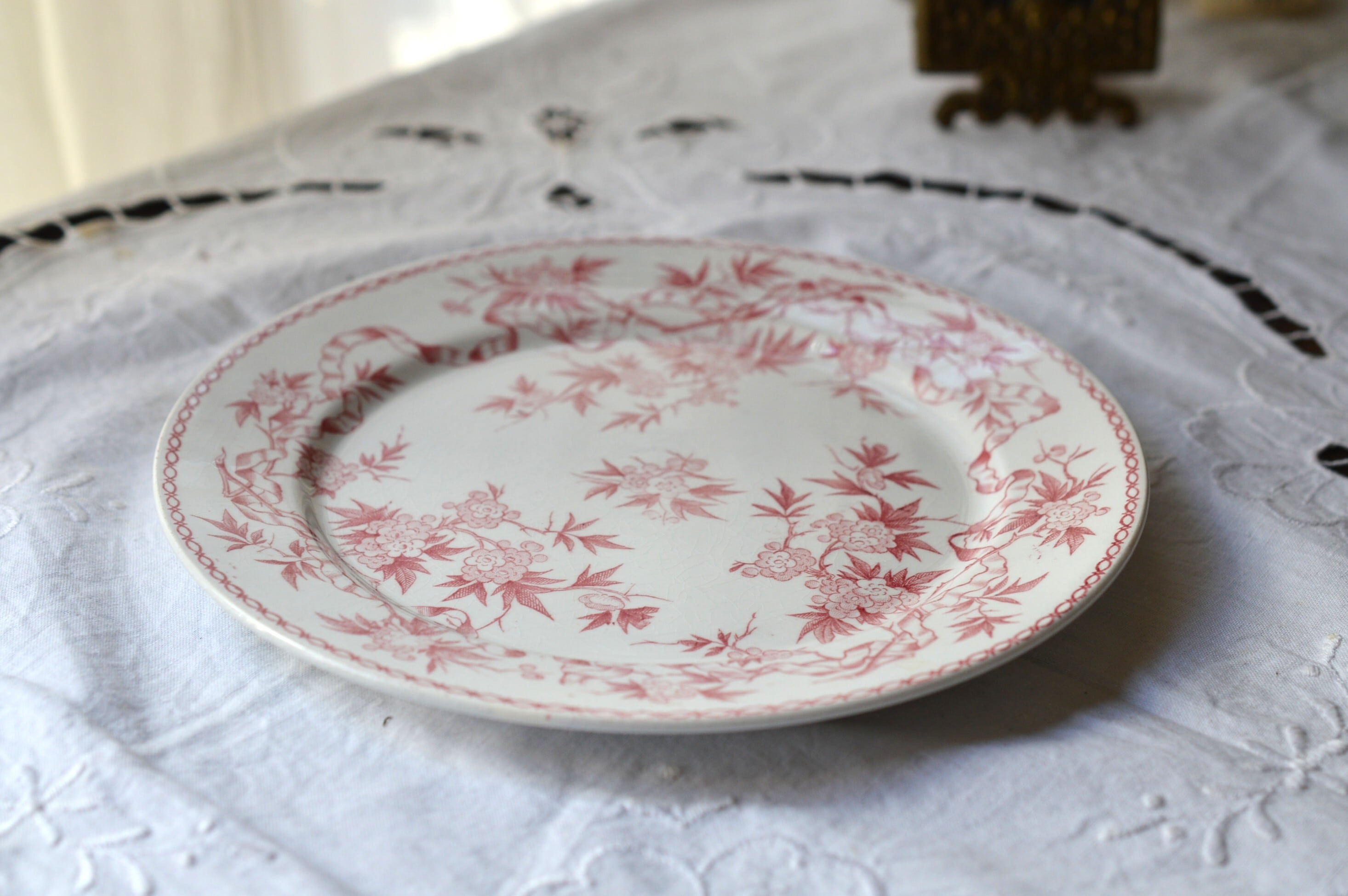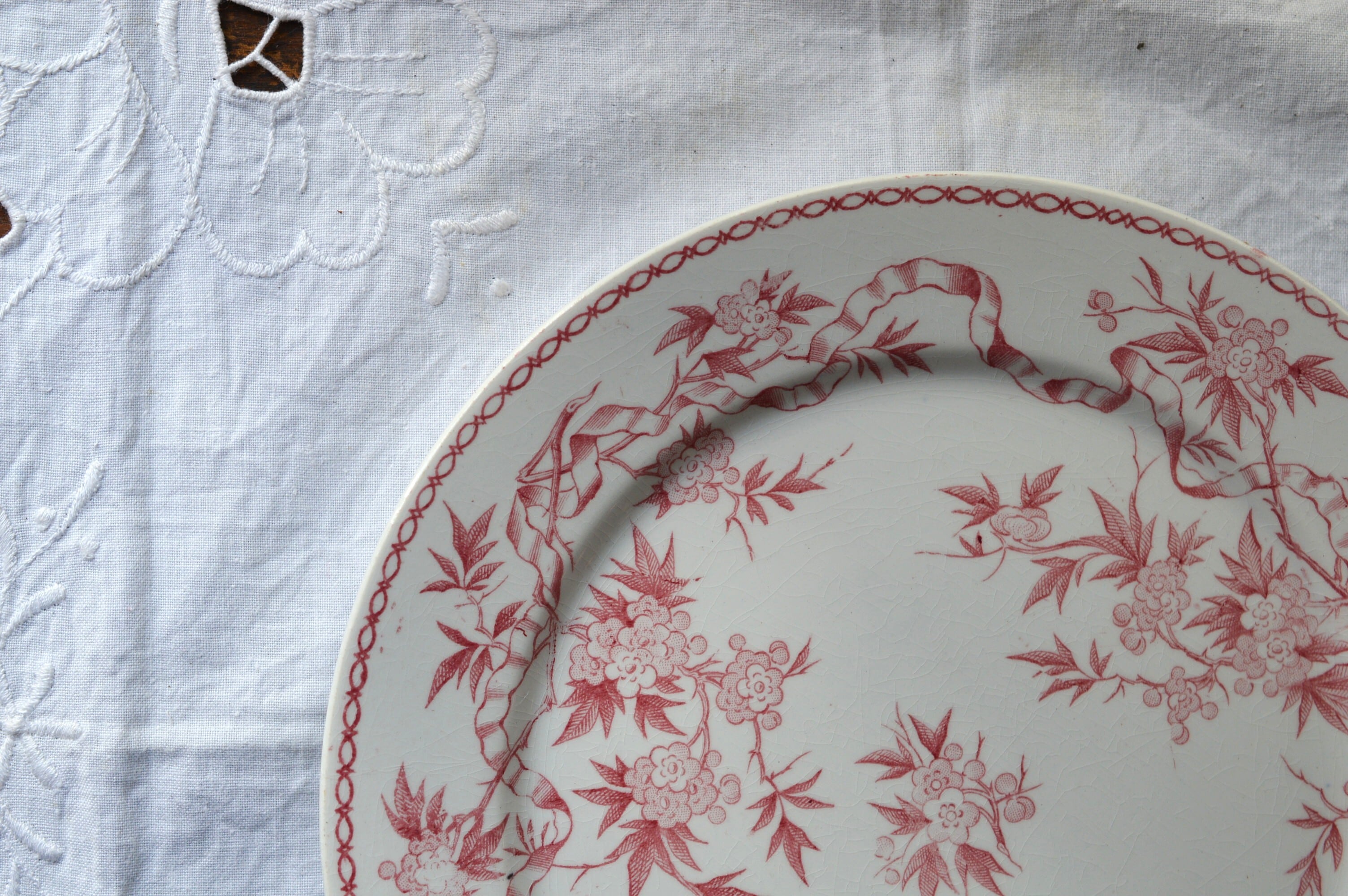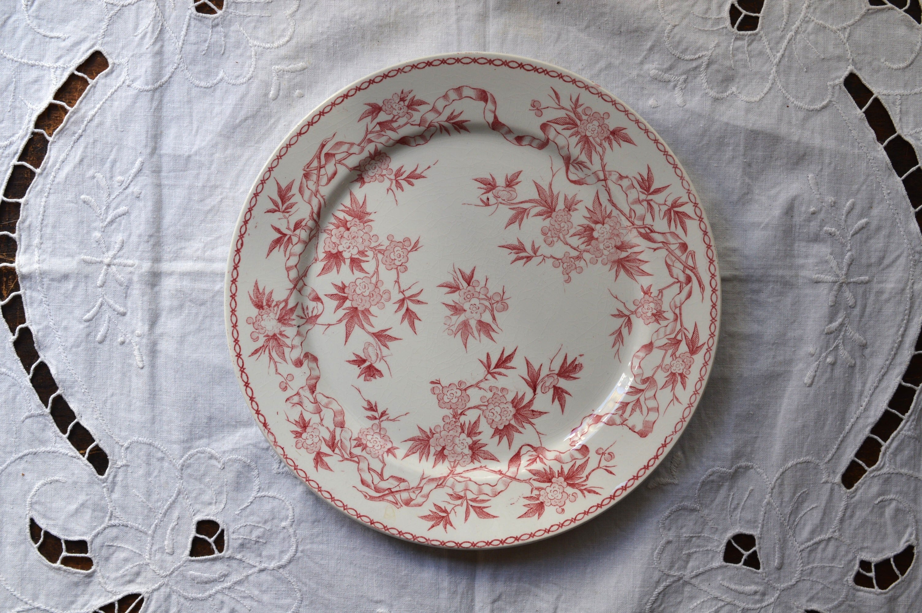 淡いピンクの転写プレートです。個体によって経年変化による僅かな染みや貫入が所々に見られますが、ヒビやクラックなども無く大変良好な状態です。詳細は写真でご確認ください。