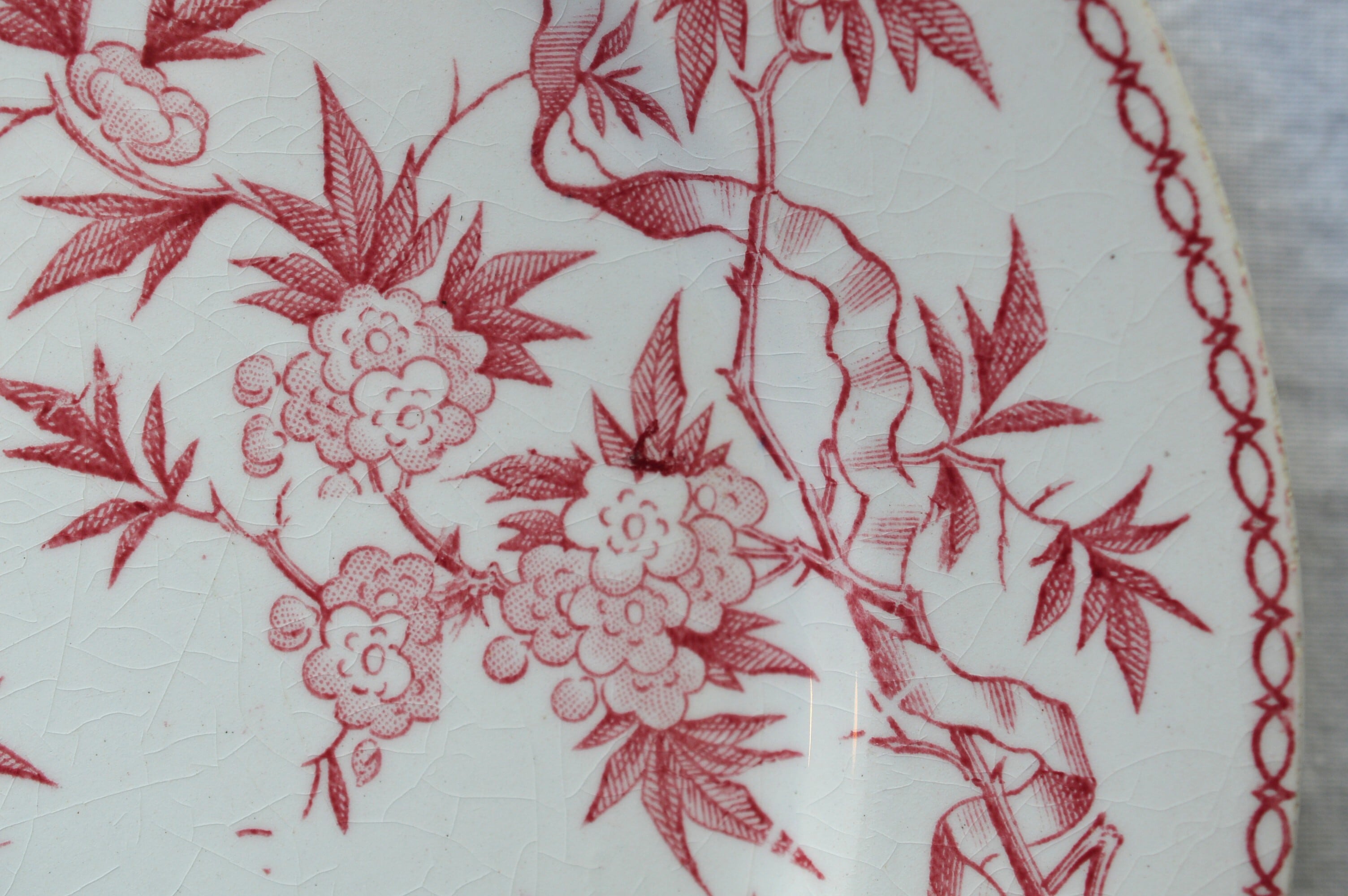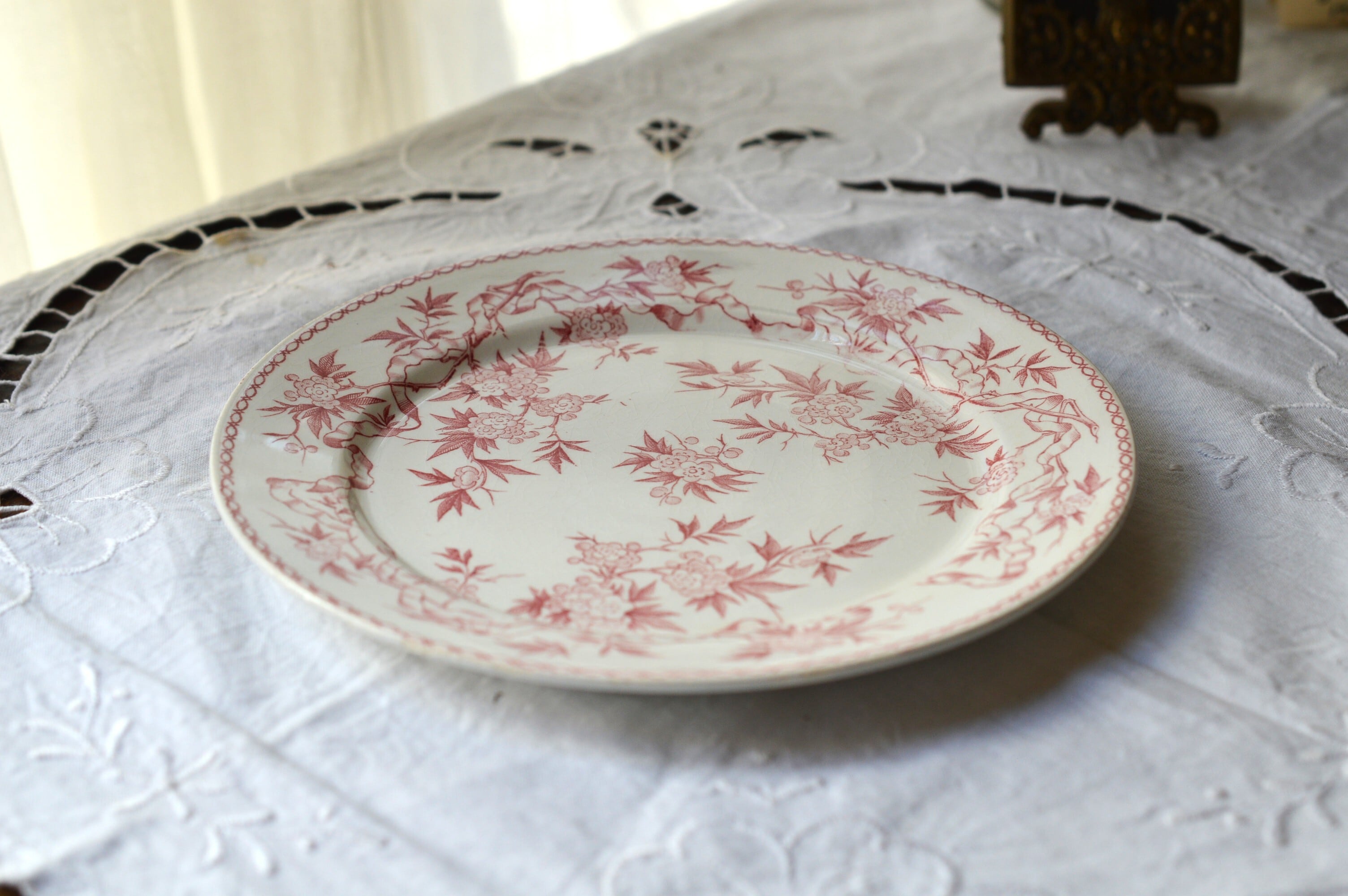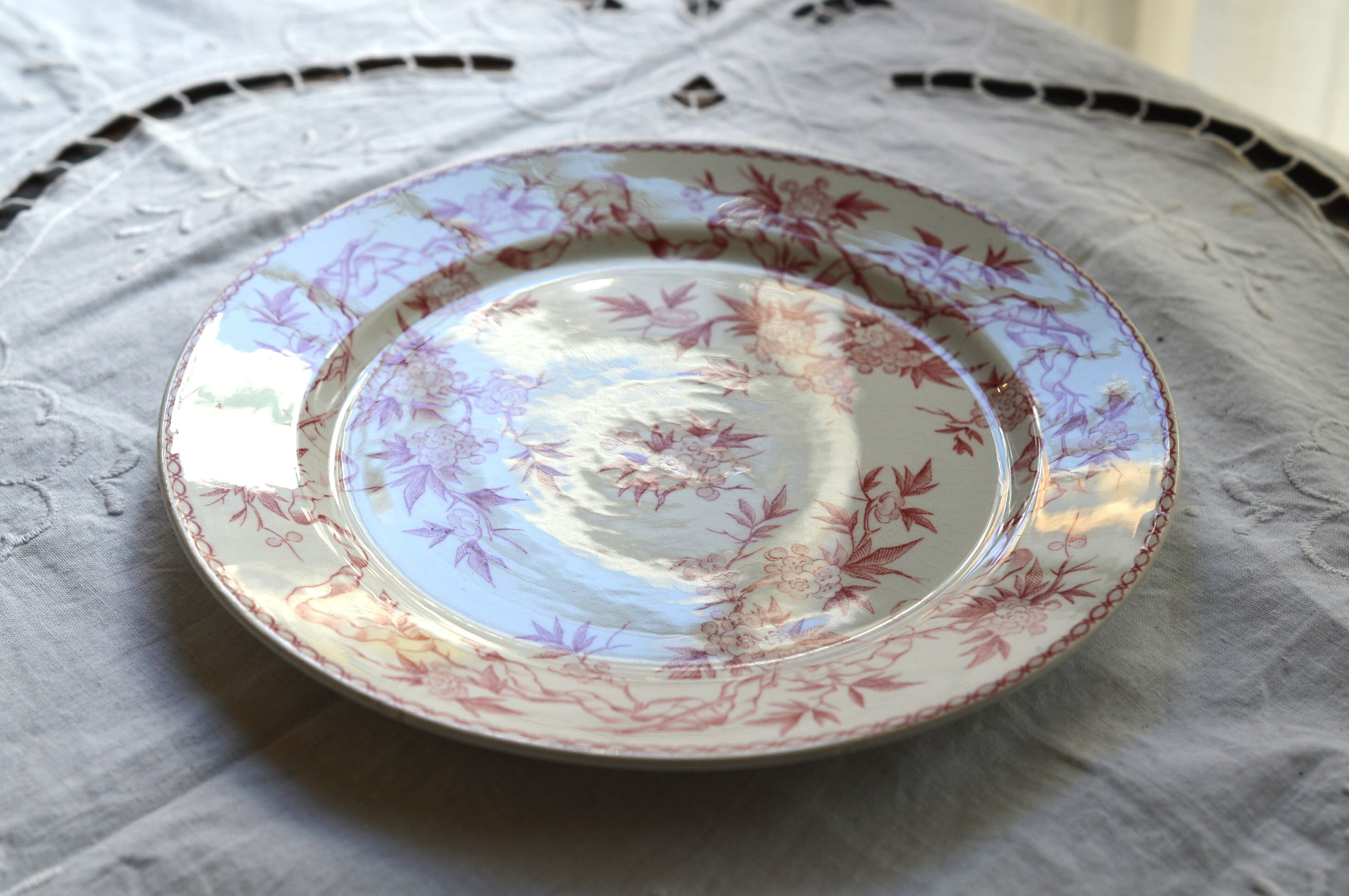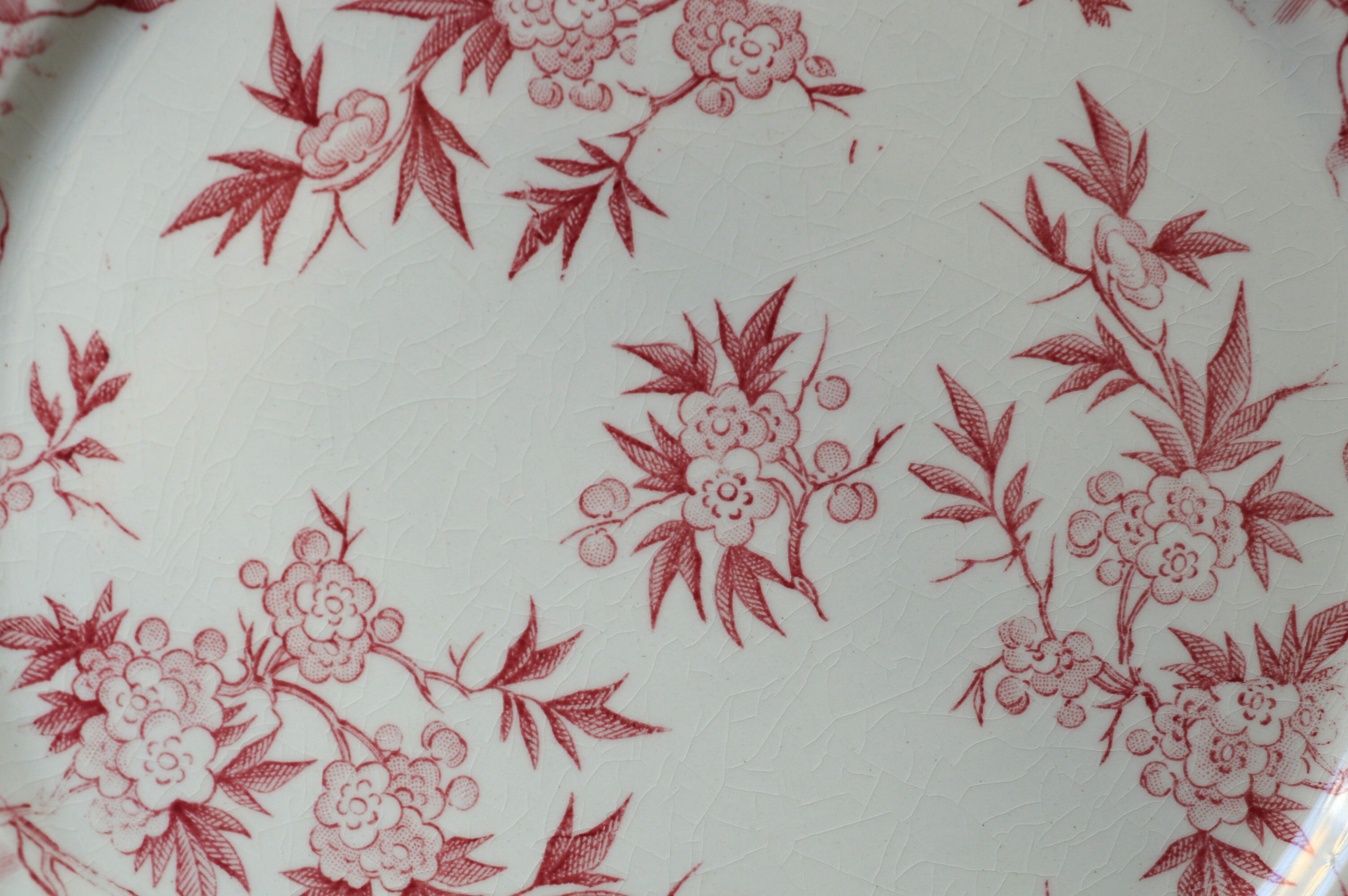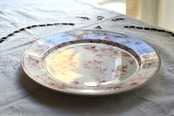 淡いピンクの転写プレートです。個体によって経年変化による僅かな染みや貫入が所々に見られますが、ヒビやクラックなども無く大変良好な状態です。詳細は写真でご確認ください。