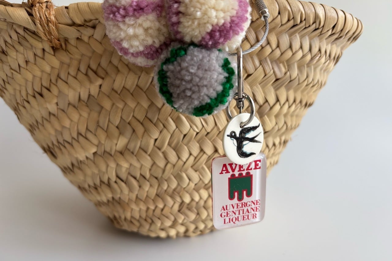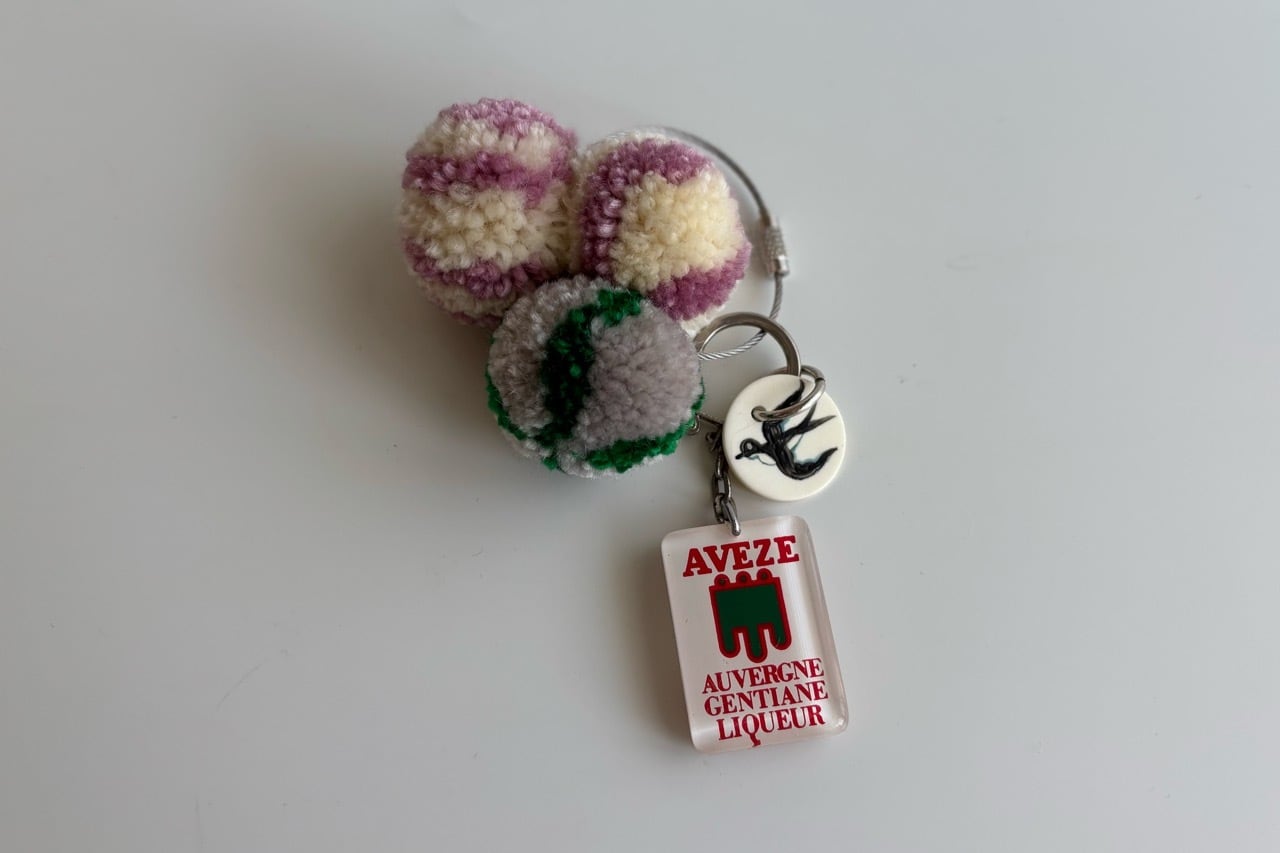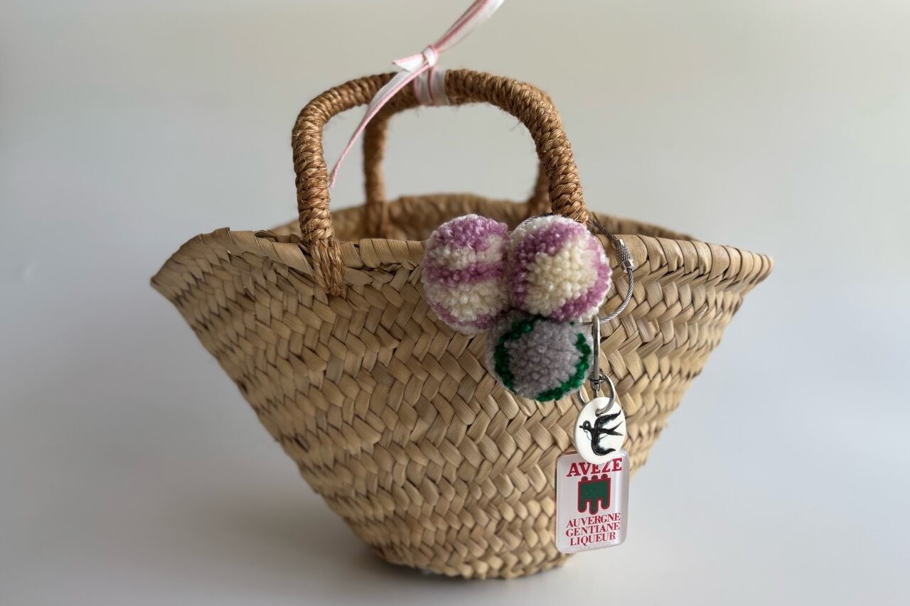 当店ではキーホルダーの他にヴィンテージのボーンチップにツバメを描き、アクセントにストライプのぼんぼんを付けました。(別名ウニぼんぼんと呼んでいます)