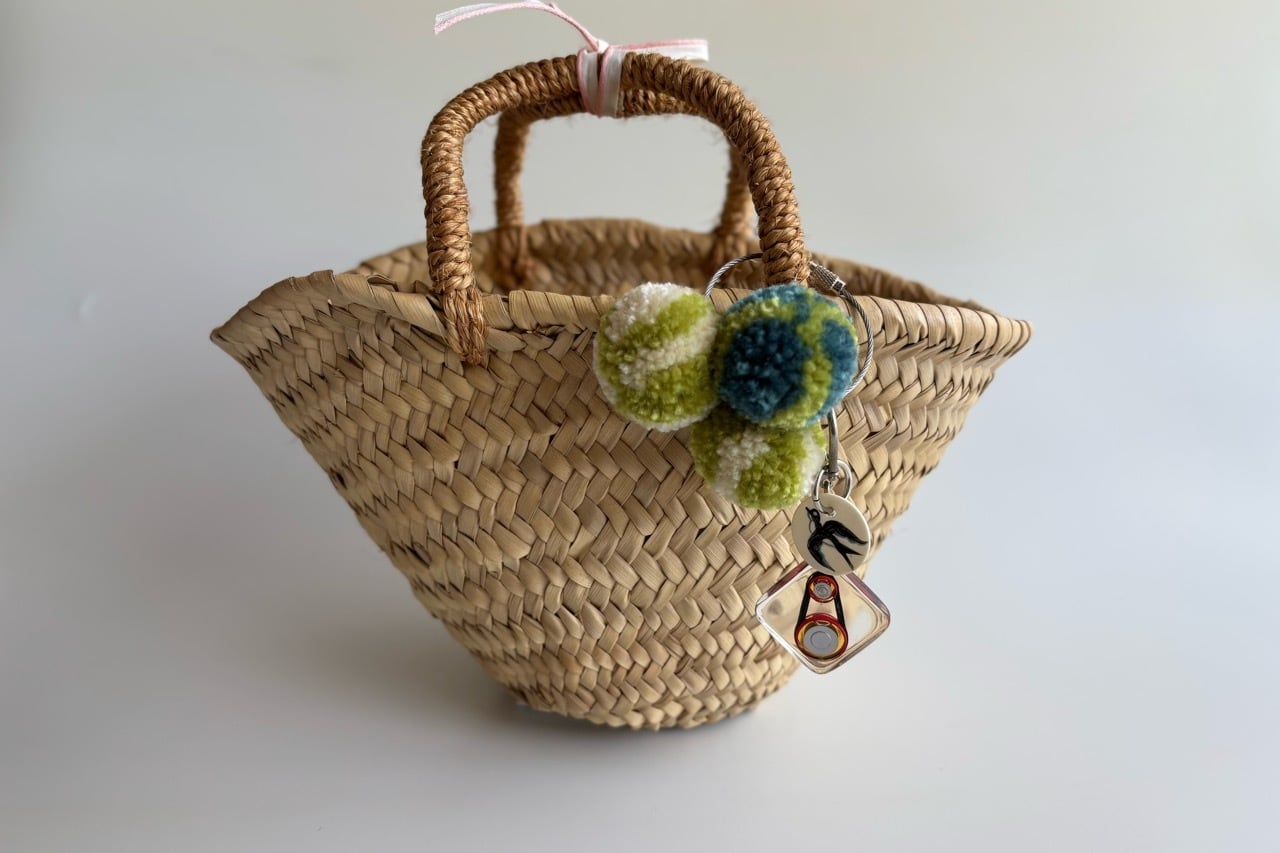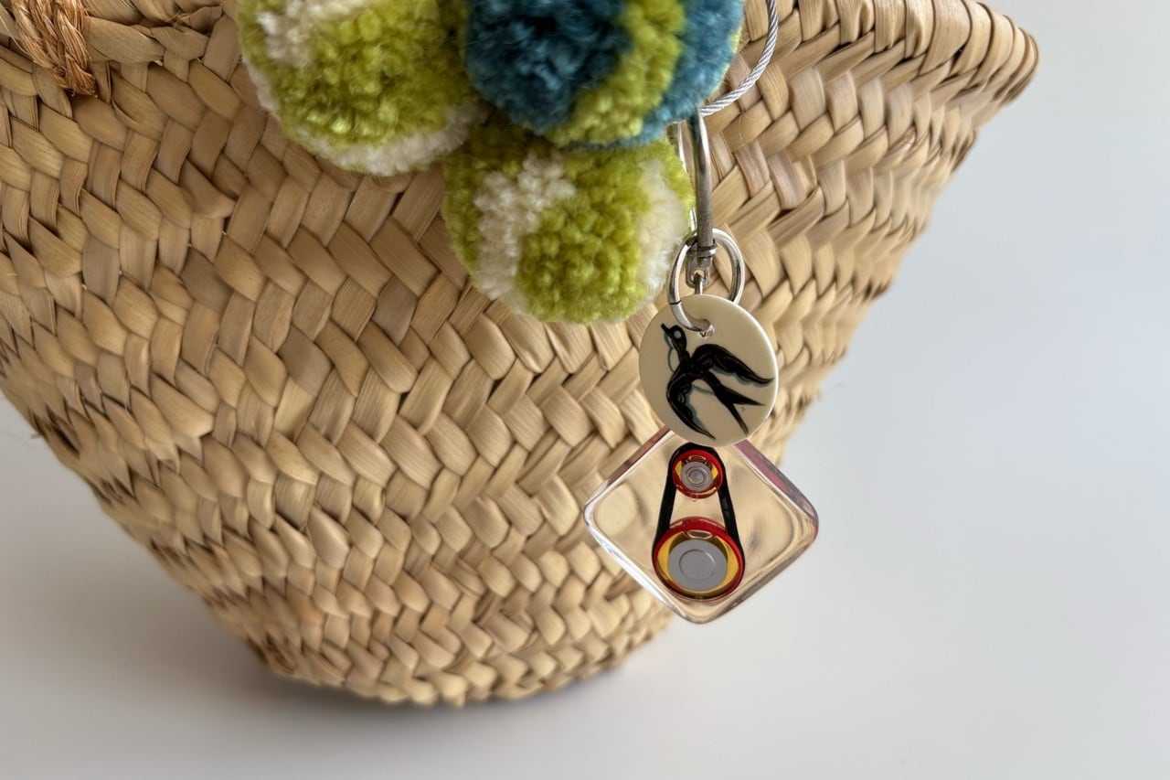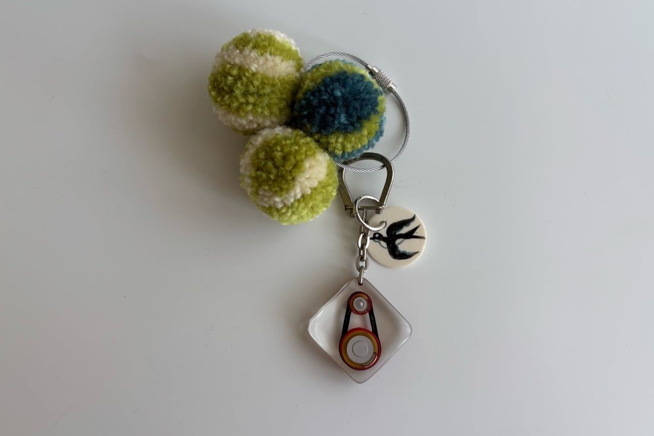 当店ではキーホルダーの他にヴィンテージのボーンチップにツバメを描き、アクセントにストライプのぼんぼんを付けました。(別名ウニぼんぼんと呼んでいます)