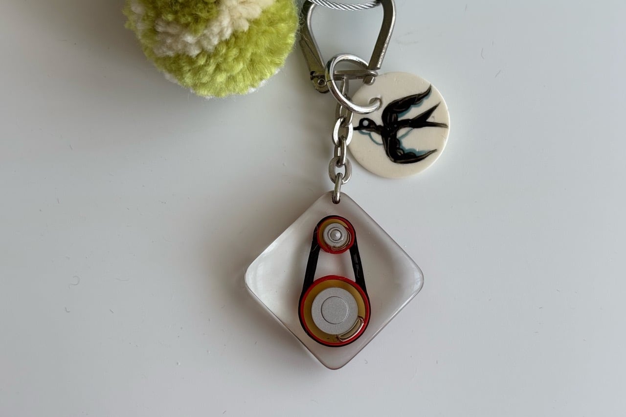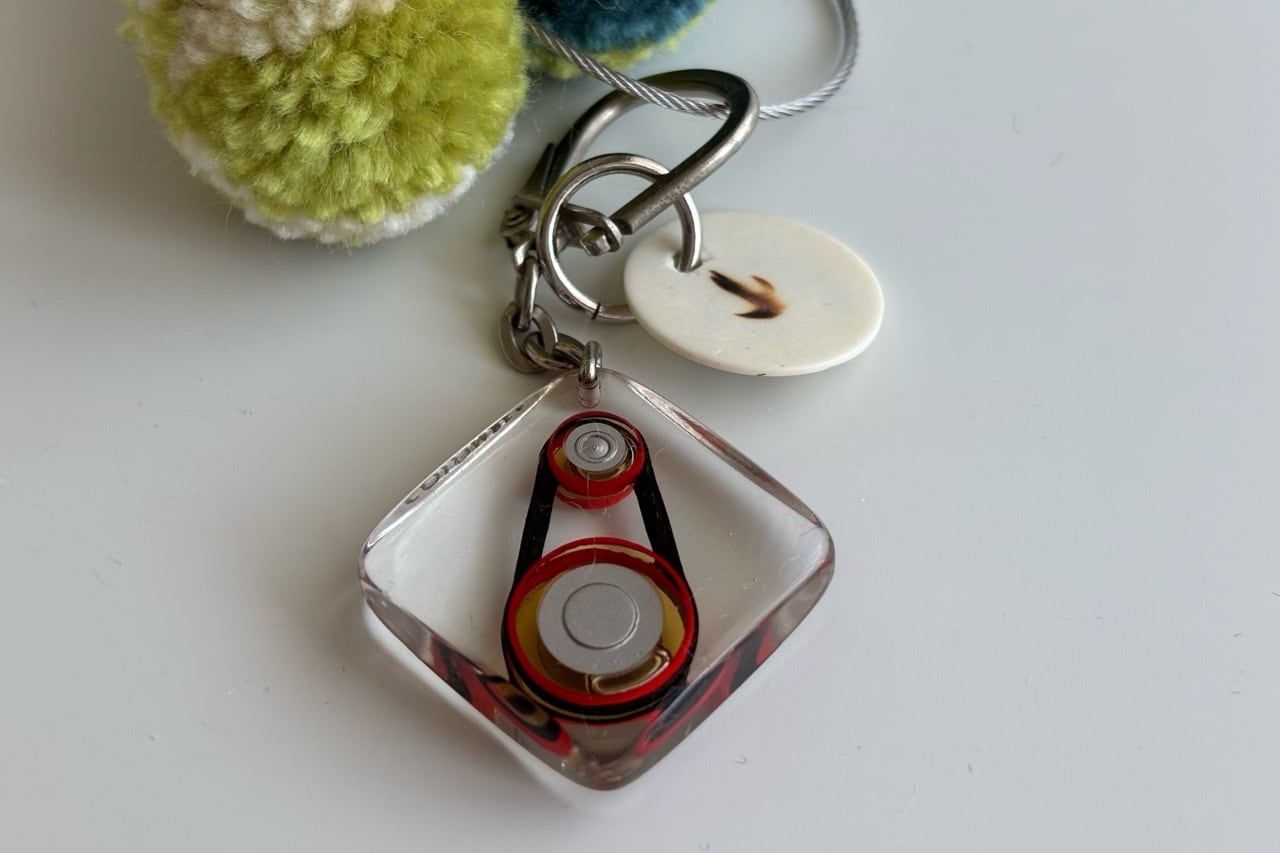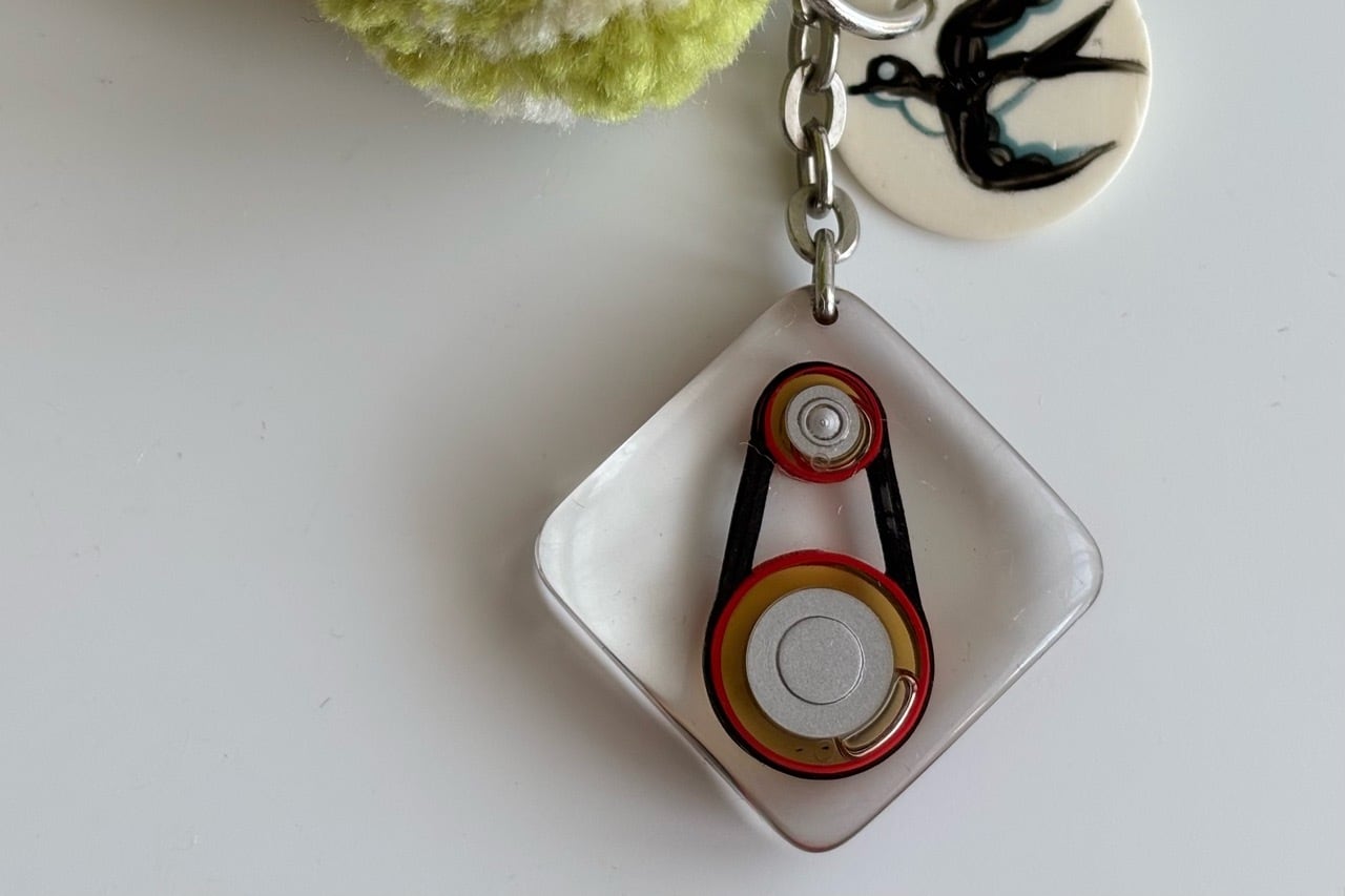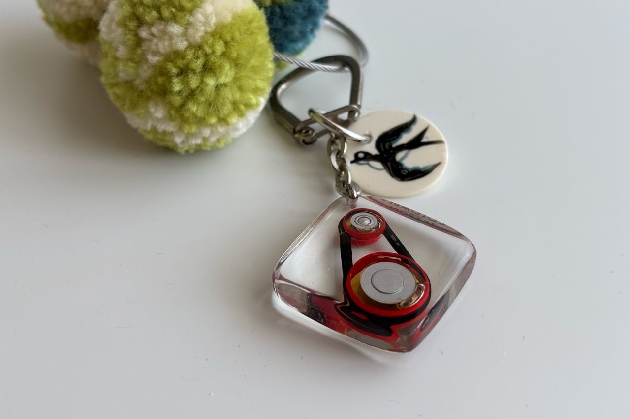 企業や商品名などと共にモチーフが樹脂の中に封じ込められていて、レトロ感とおもちゃ感がなんとも言えない可愛らしさです。