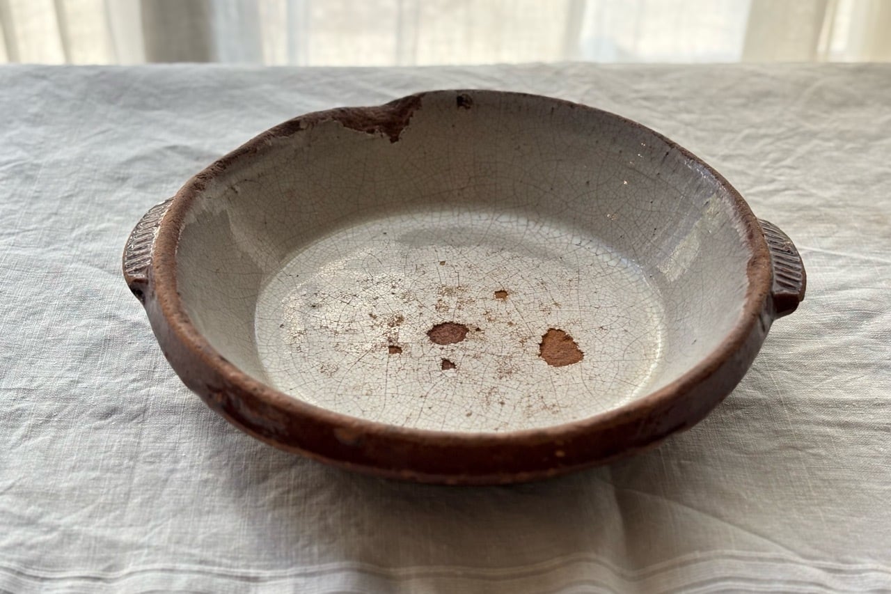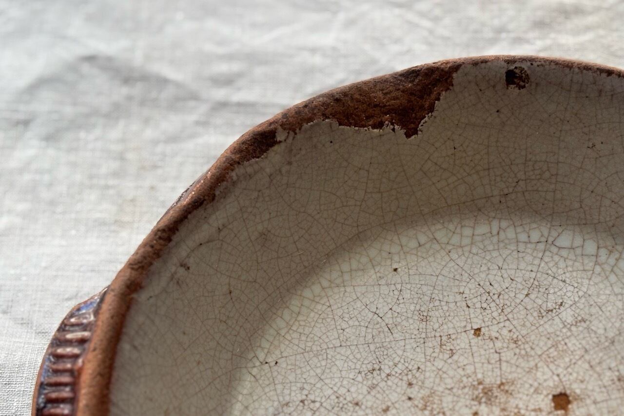 18〜20世紀初頭にフランス北部を中心に作られ、テラコッタ素地に錫釉を用いた実用性の高い調理・日用器として使われました。