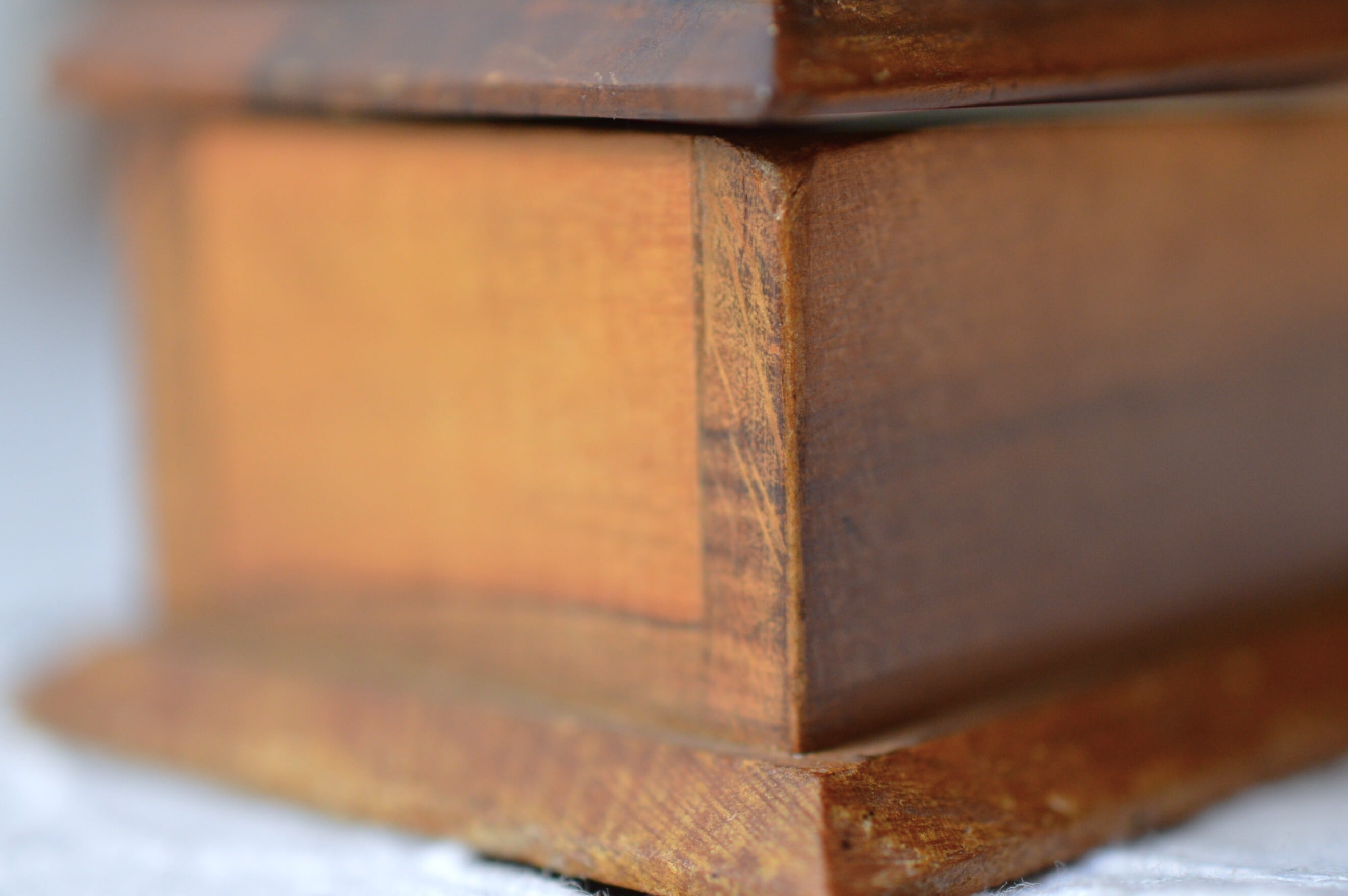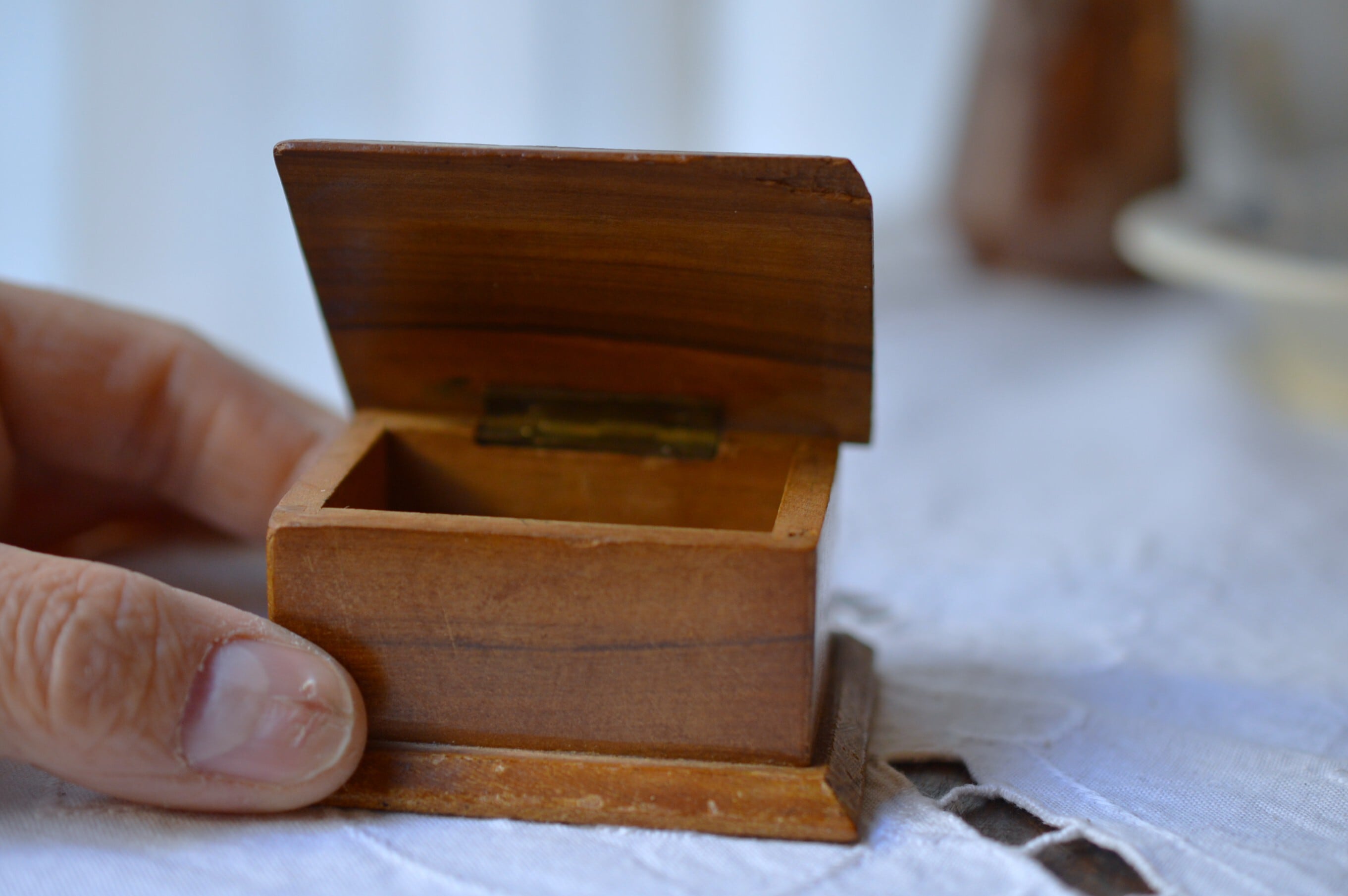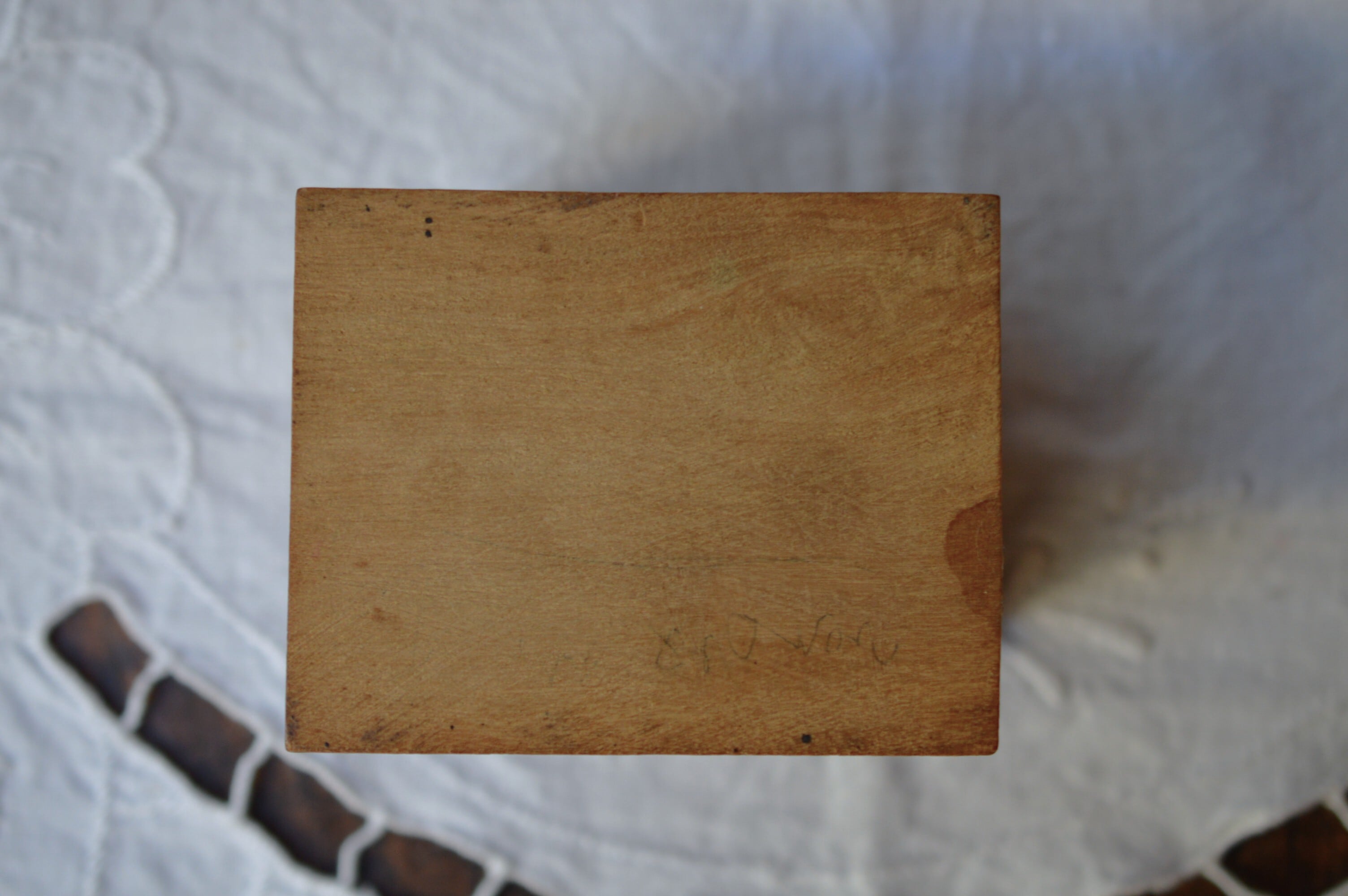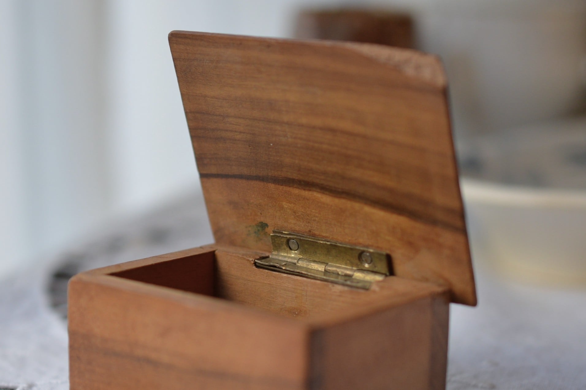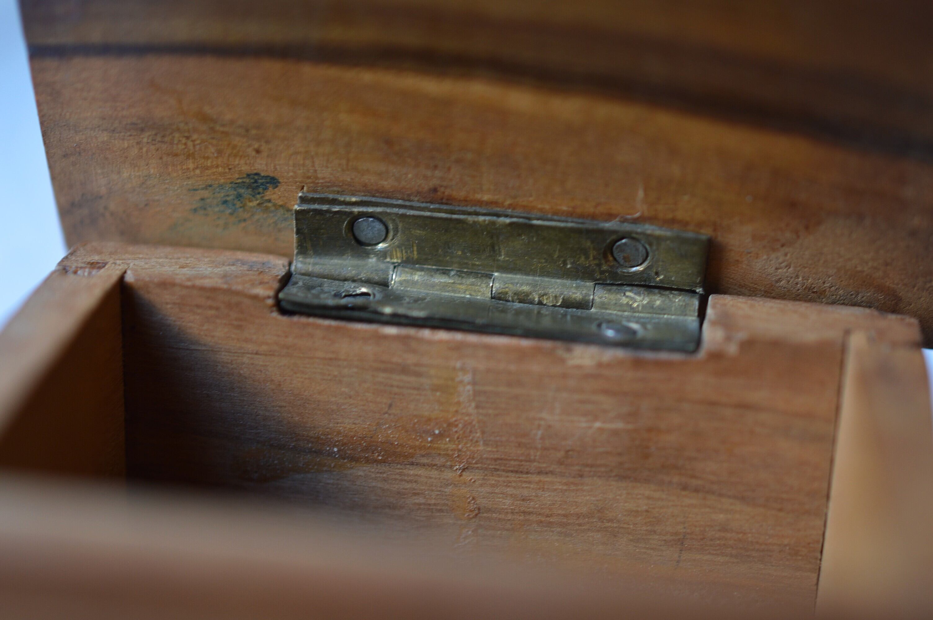 丁番は真鍮製、若干のぐらつきがありますが使用するのに支障はなさそうです。上蓋の右手前が欠けています。経年変化によるオリーブの渋い色合いと木目がとても美しい一品です。