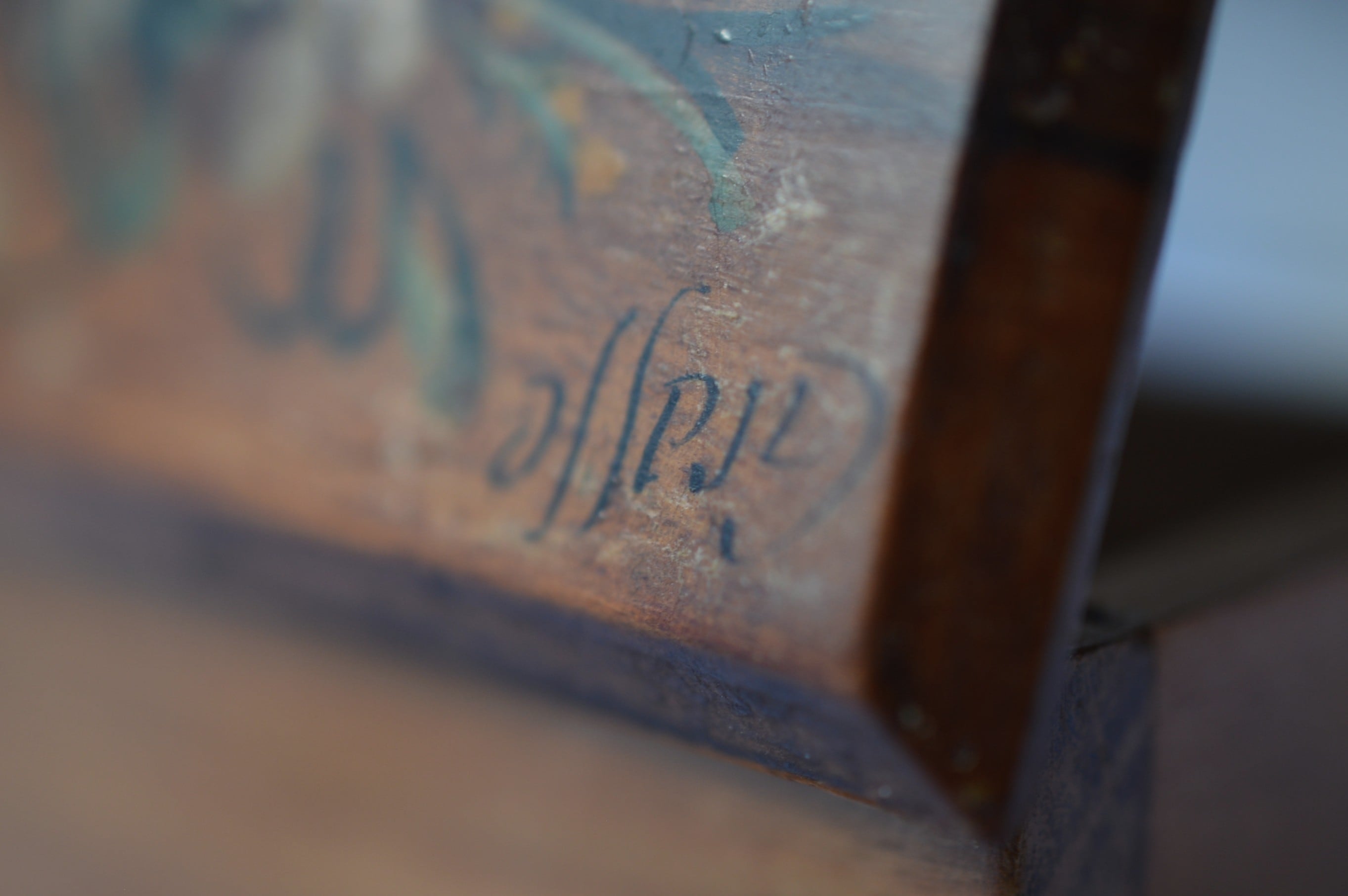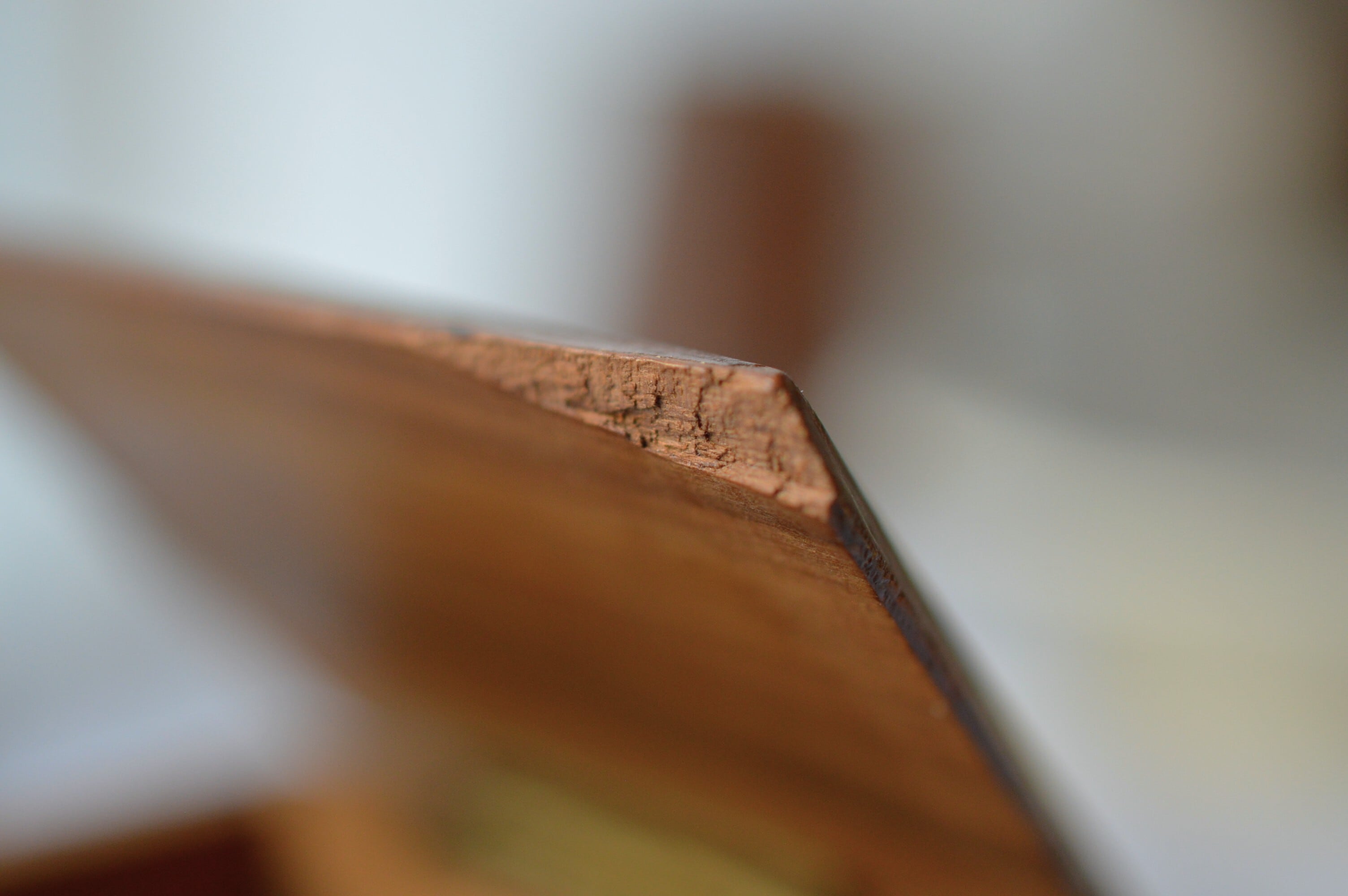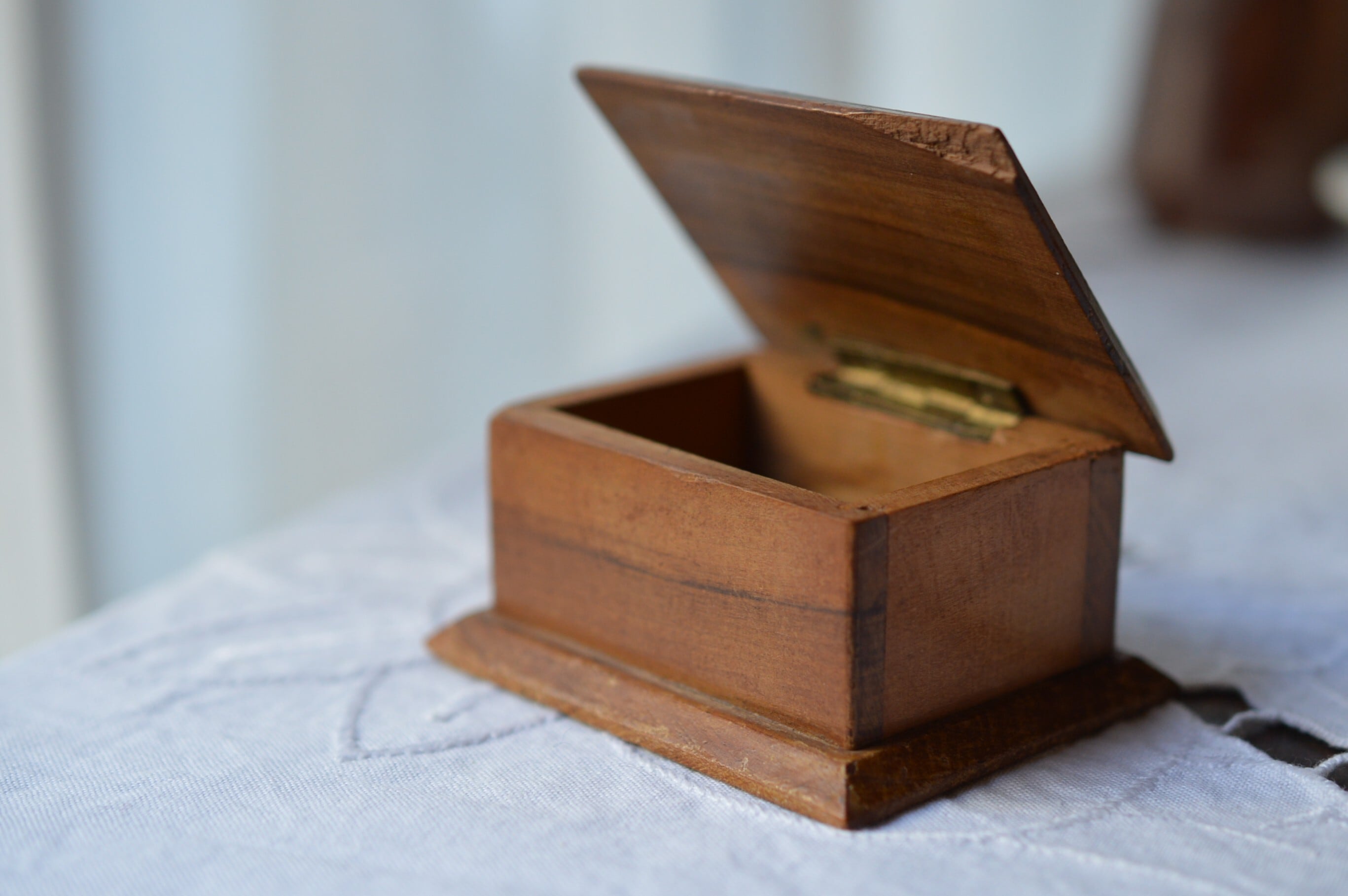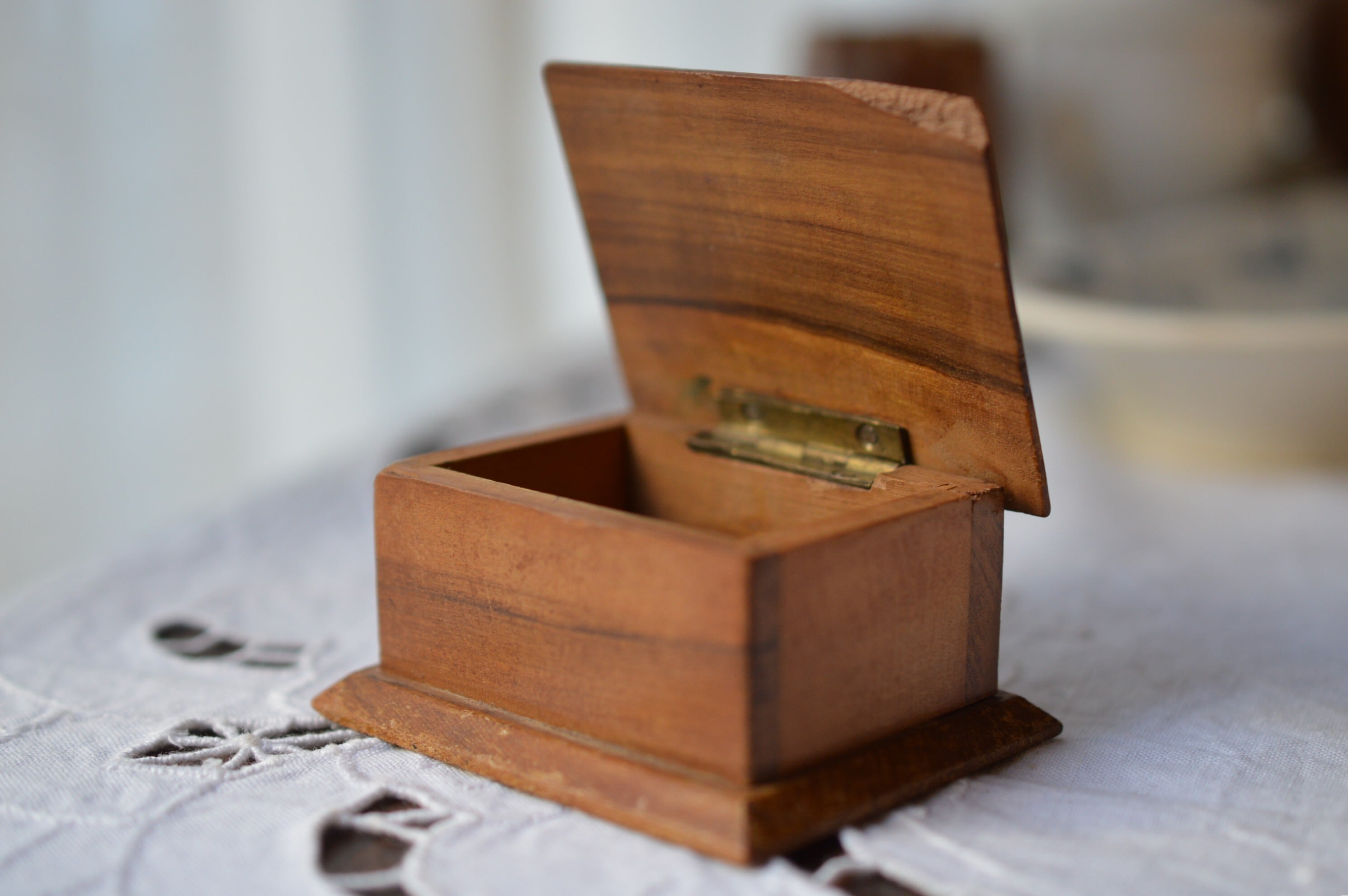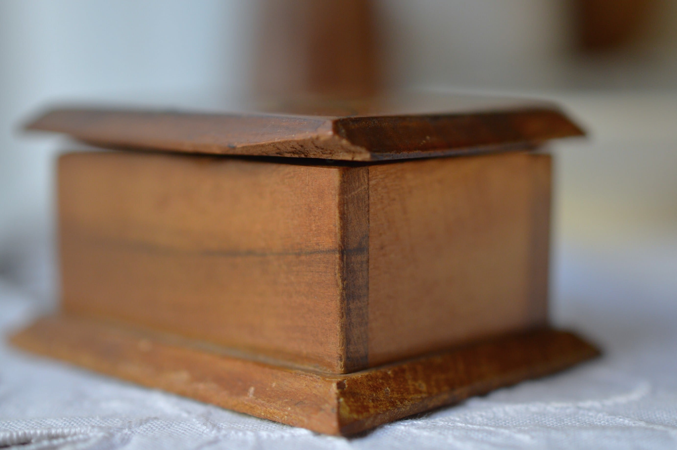 丁番は真鍮製、若干のぐらつきがありますが使用するのに支障はなさそうです。上蓋の右手前が欠けています。経年変化によるオリーブの渋い色合いと木目がとても美しい一品です。
