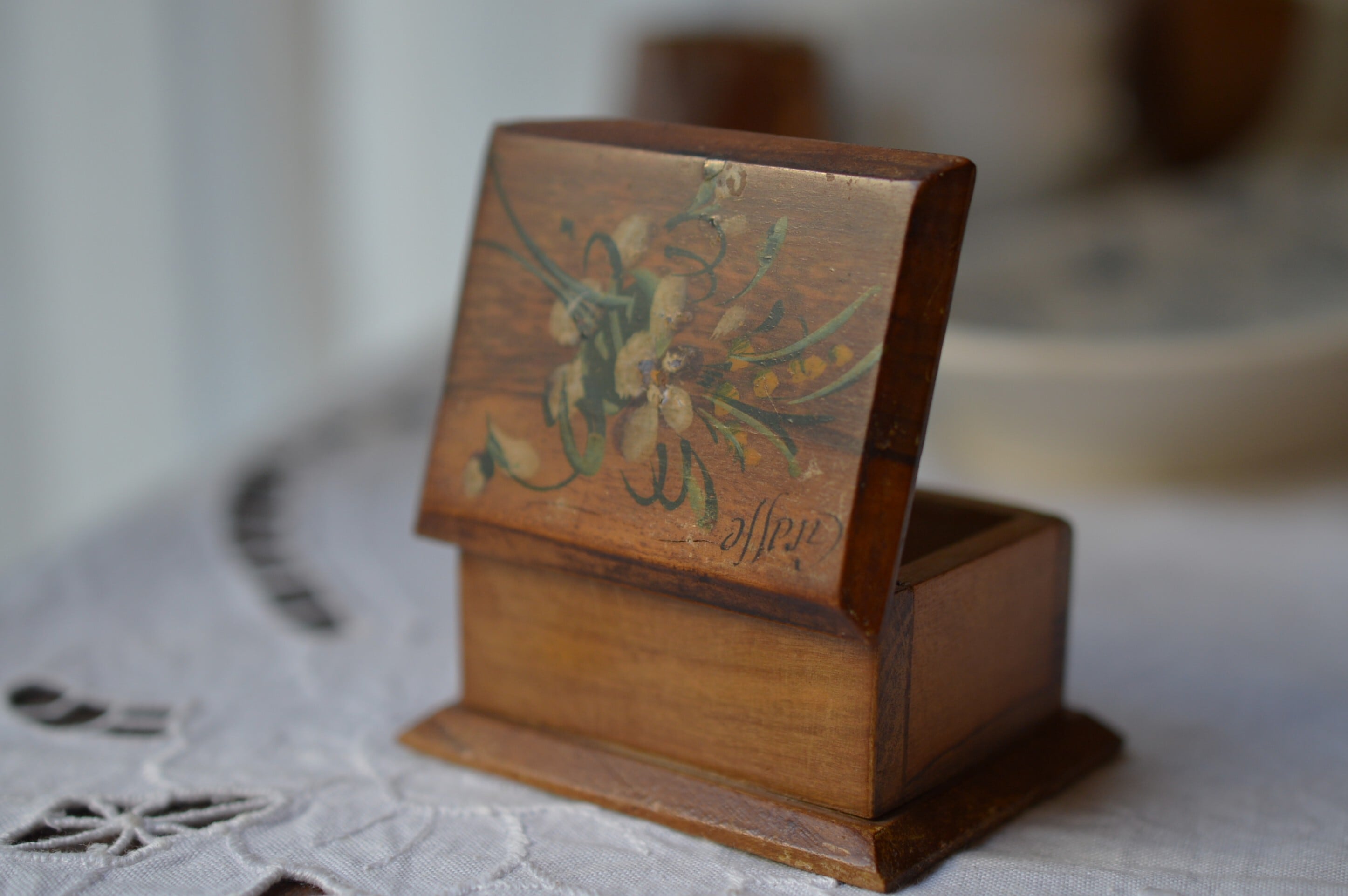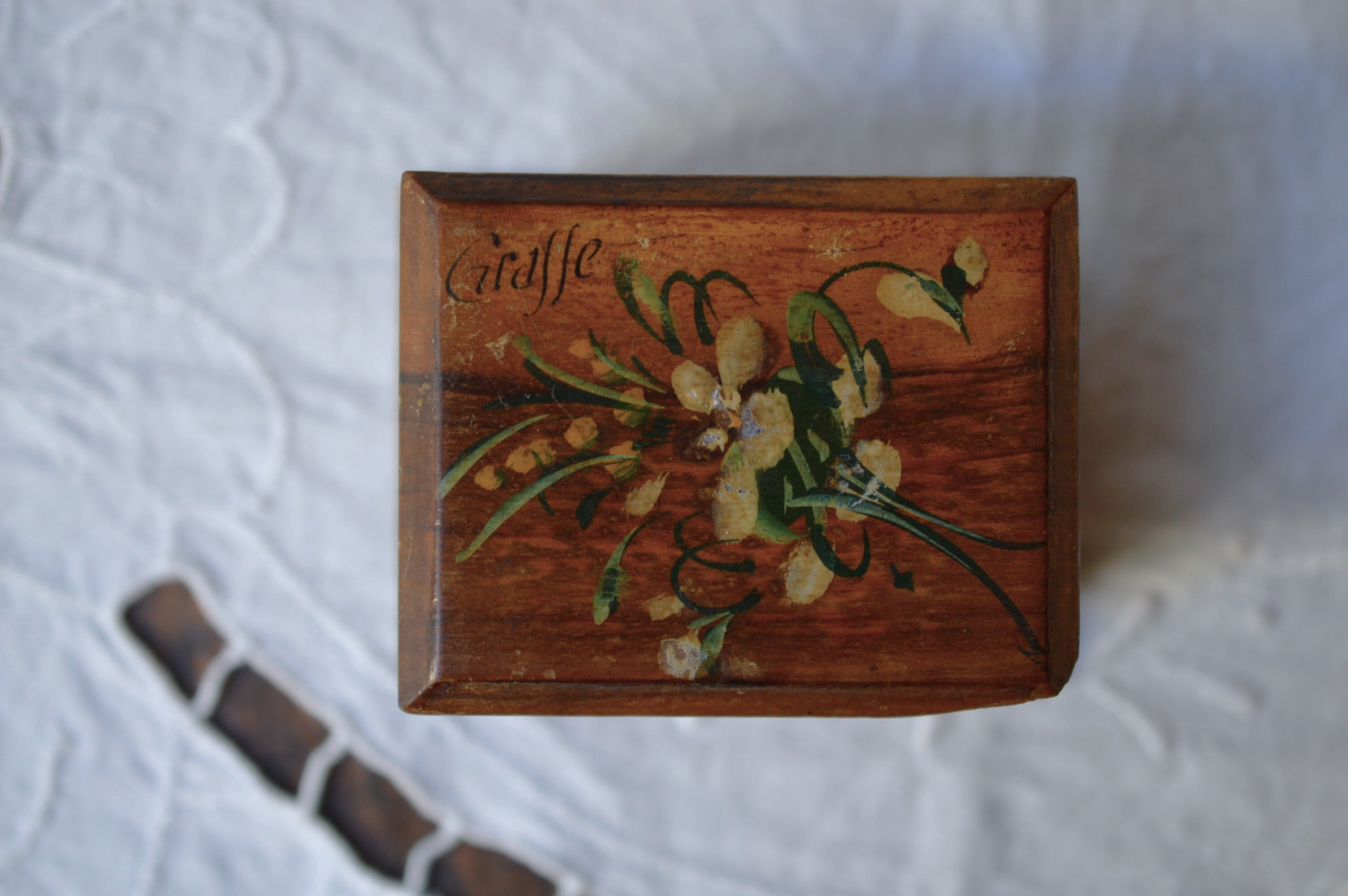 白と黄色の花束が静かに描かれた手のひらに乗るほどの小さな木箱です。小物入れですが、このサイズですと当時はスタンプ(切手や印紙など)入れとしても使われていました。