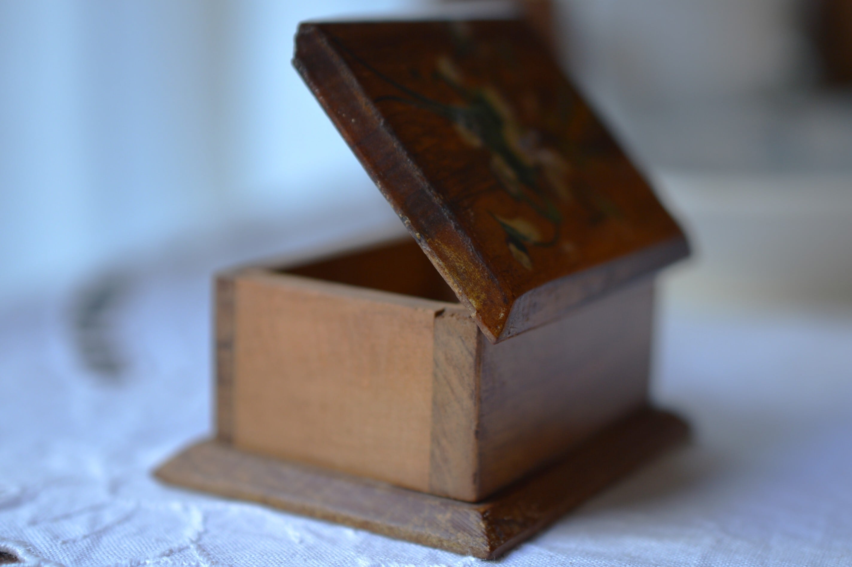 モシュリンヌ・ボックスは1900年代初めにスコットランド南西部の Mauchline で制作されていた木工民芸品。オリーブの木を使ったこの木工品は1930年頃まで作られていました。当時はフランスやスイス等、ヨーロッパ各地の観光地にスーベニールとして輸出されていました。オリーブの美しい木目に蓋には花や鳥など自然をモチーフとした絵が描かれました。