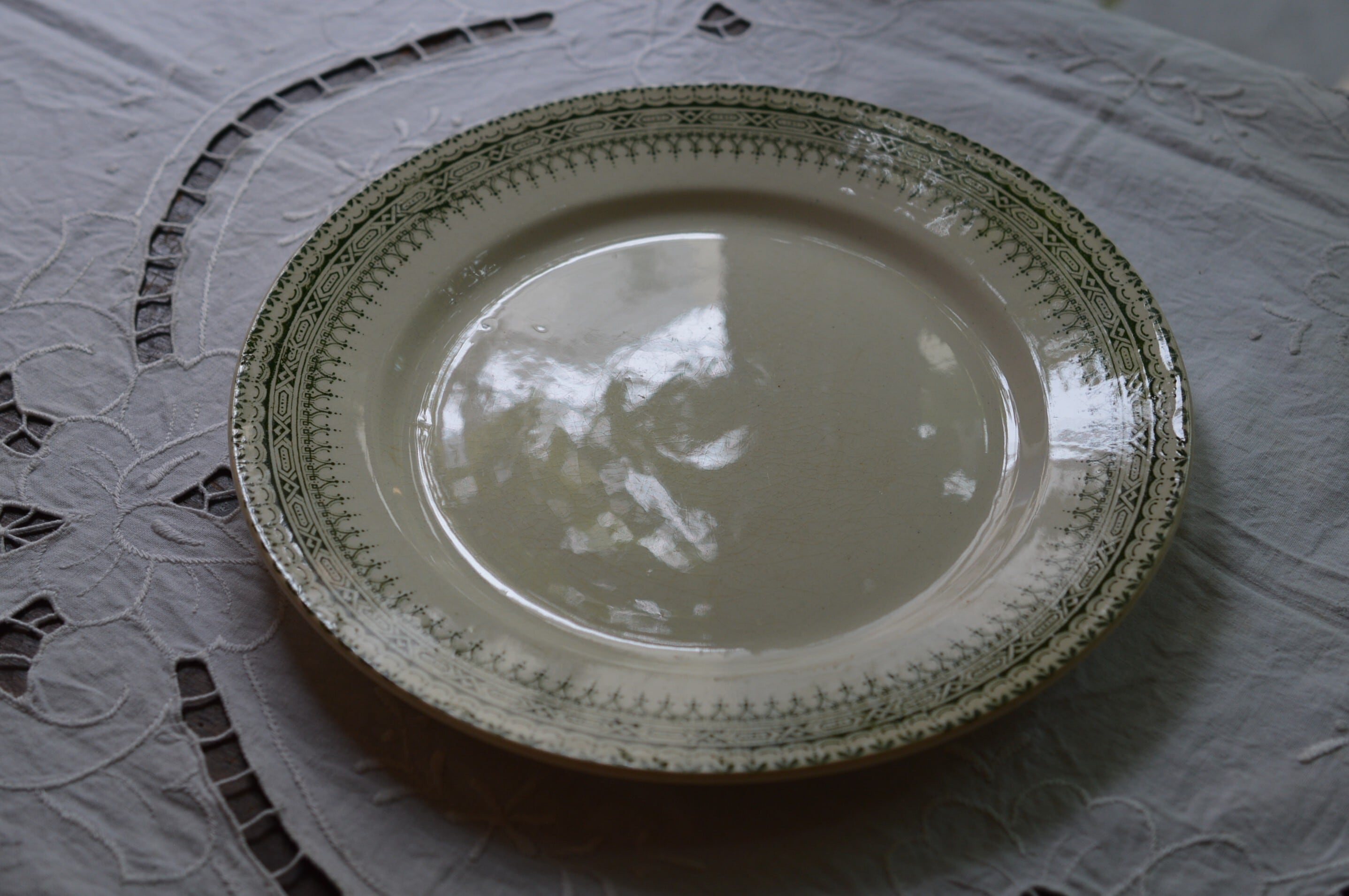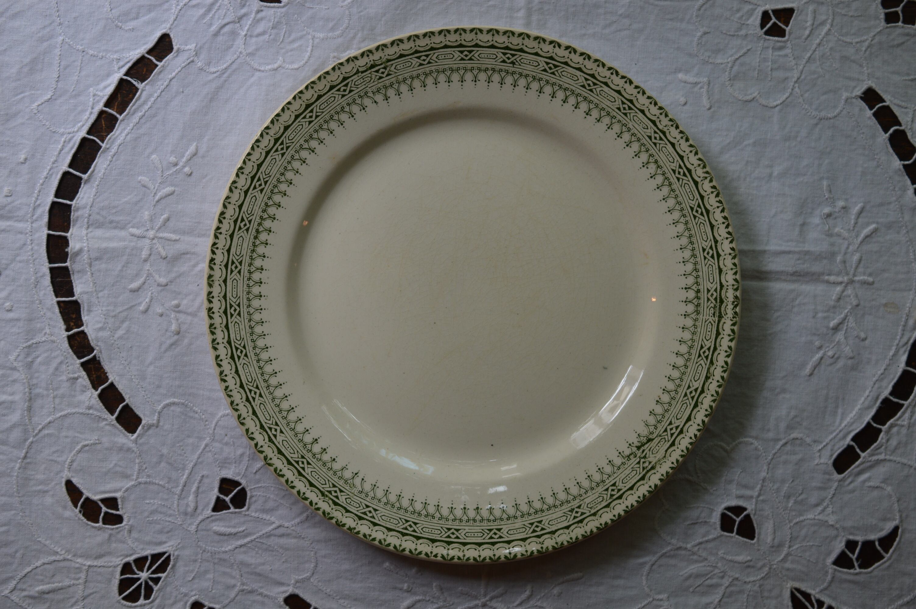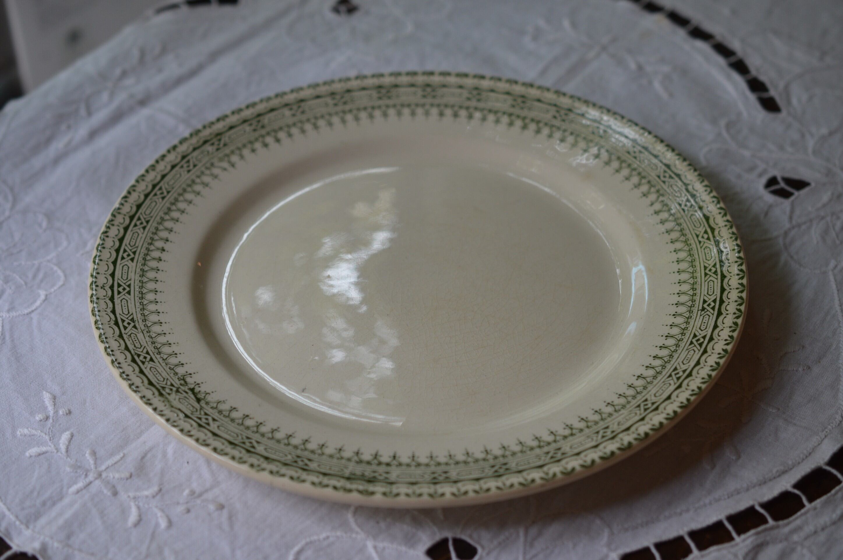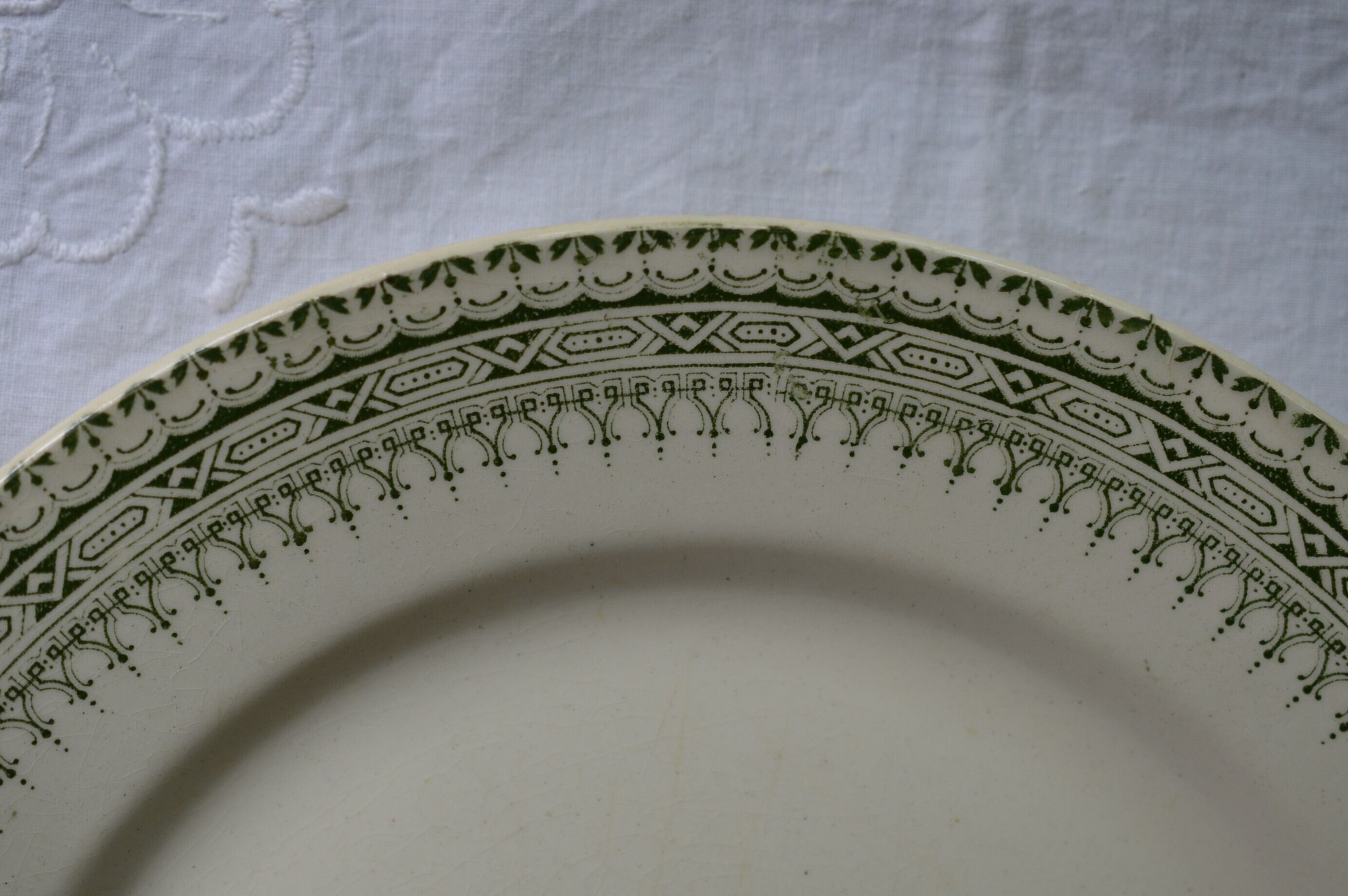本品はショワジー・ル・ロワ窯のイポリット・ブーランジェ時代の平皿。ホワイトアイボリー地に縁周りに、淡いグリーンの転写の美しい装飾が施されています。恐らく古代ローマ建築をイメージした装飾ではないかと思います。シンプルですが非常に品格のあるディナープレートです。