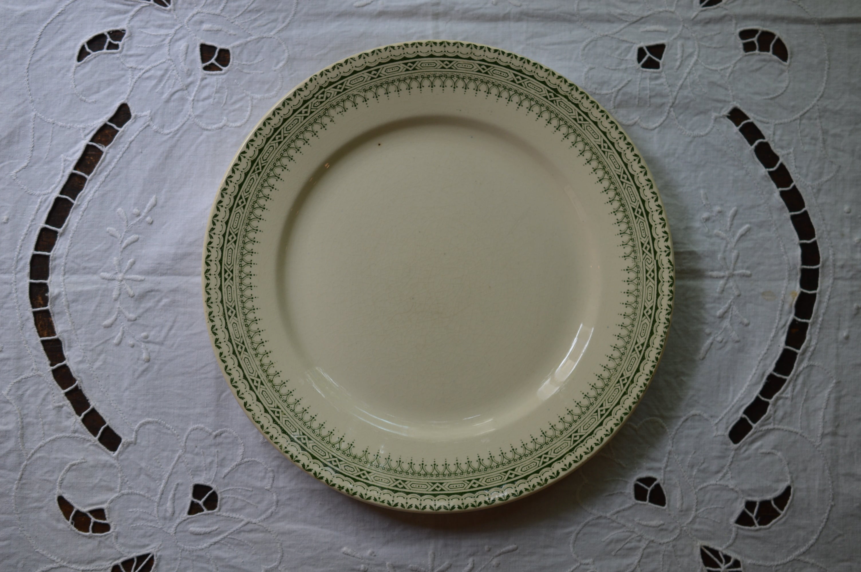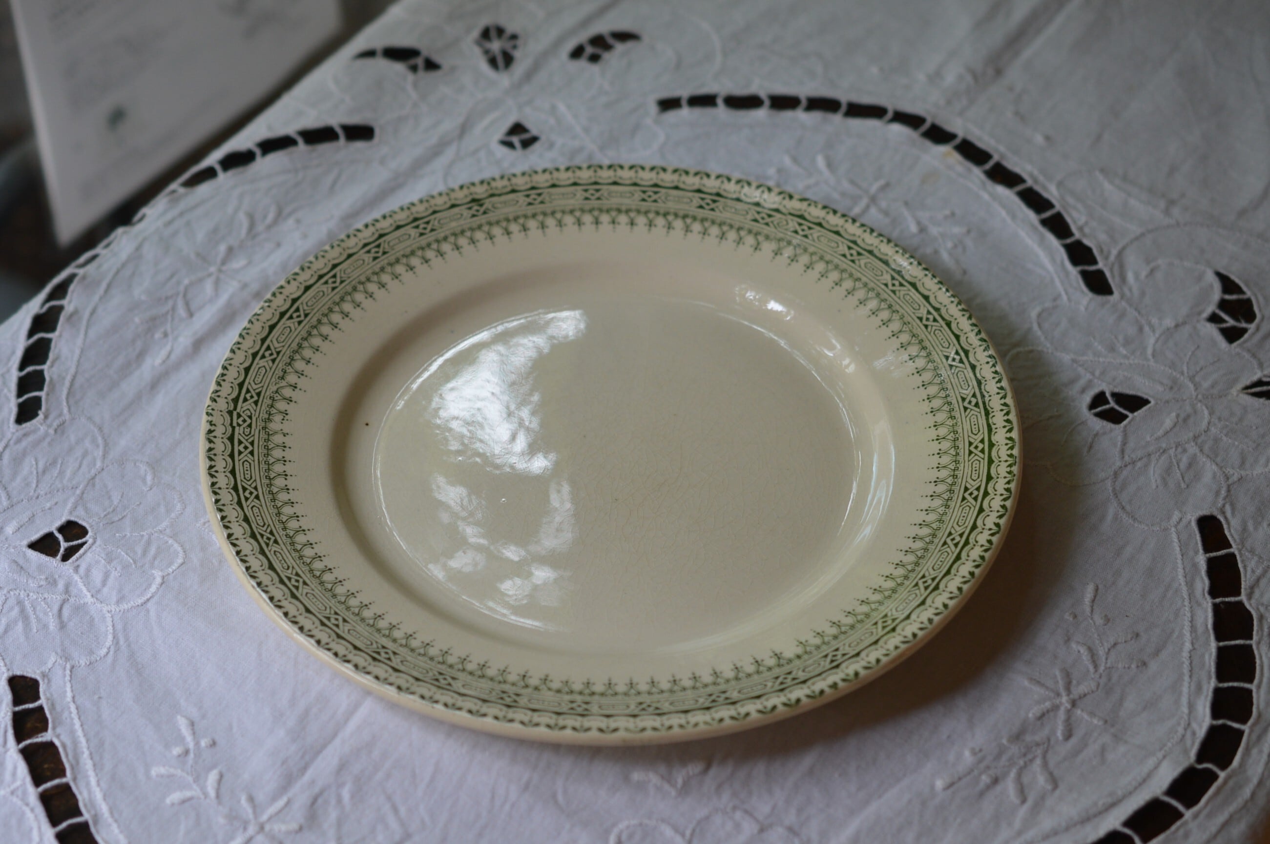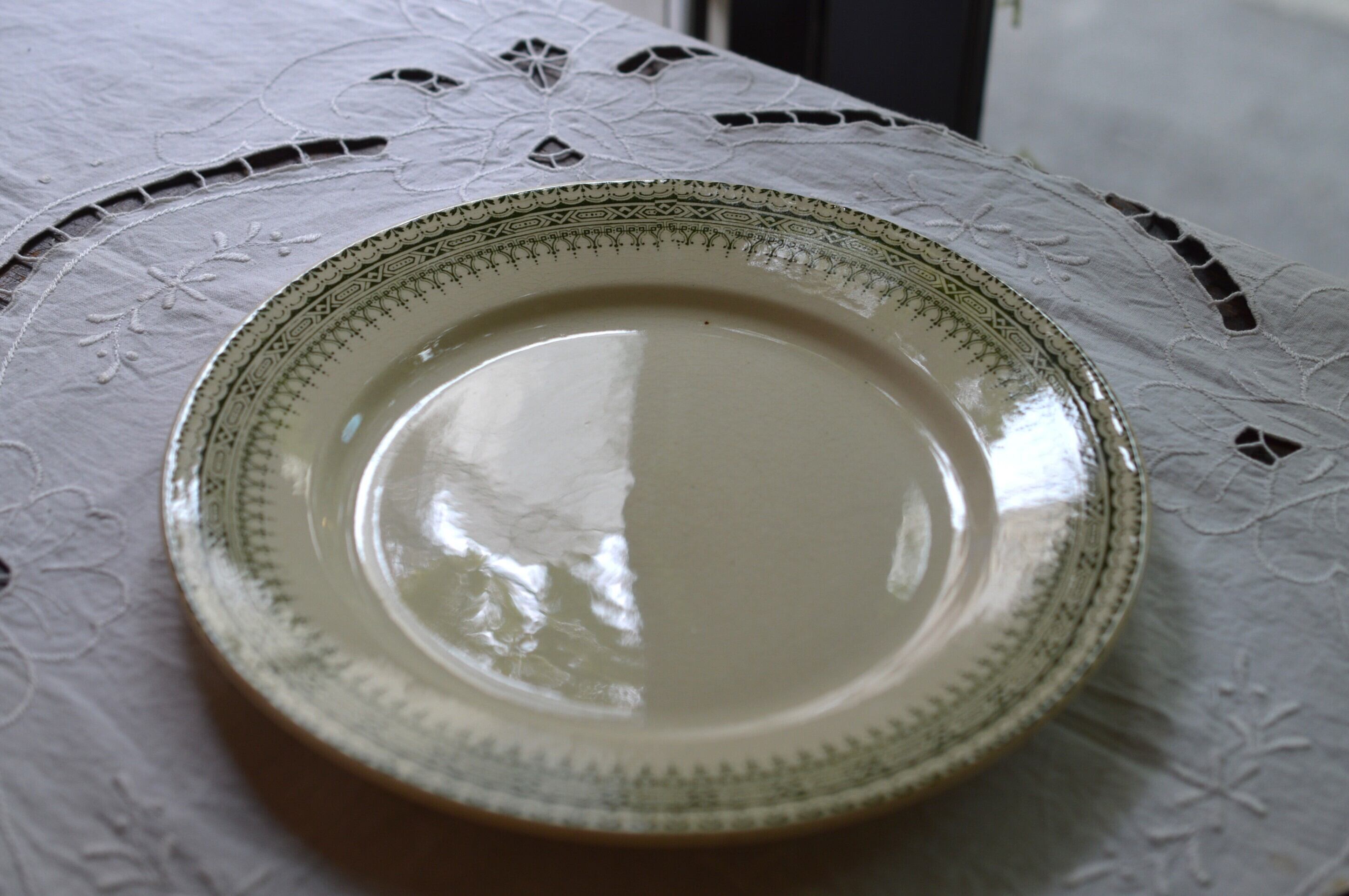 本品はショワジー・ル・ロワ窯のイポリット・ブーランジェ時代の平皿。ホワイトアイボリー地に縁周りに、淡いグリーンの転写の美しい装飾が施されています。恐らく古代ローマ建築をイメージした装飾ではないかと思います。シンプルですが非常に品格のあるディナープレートです。