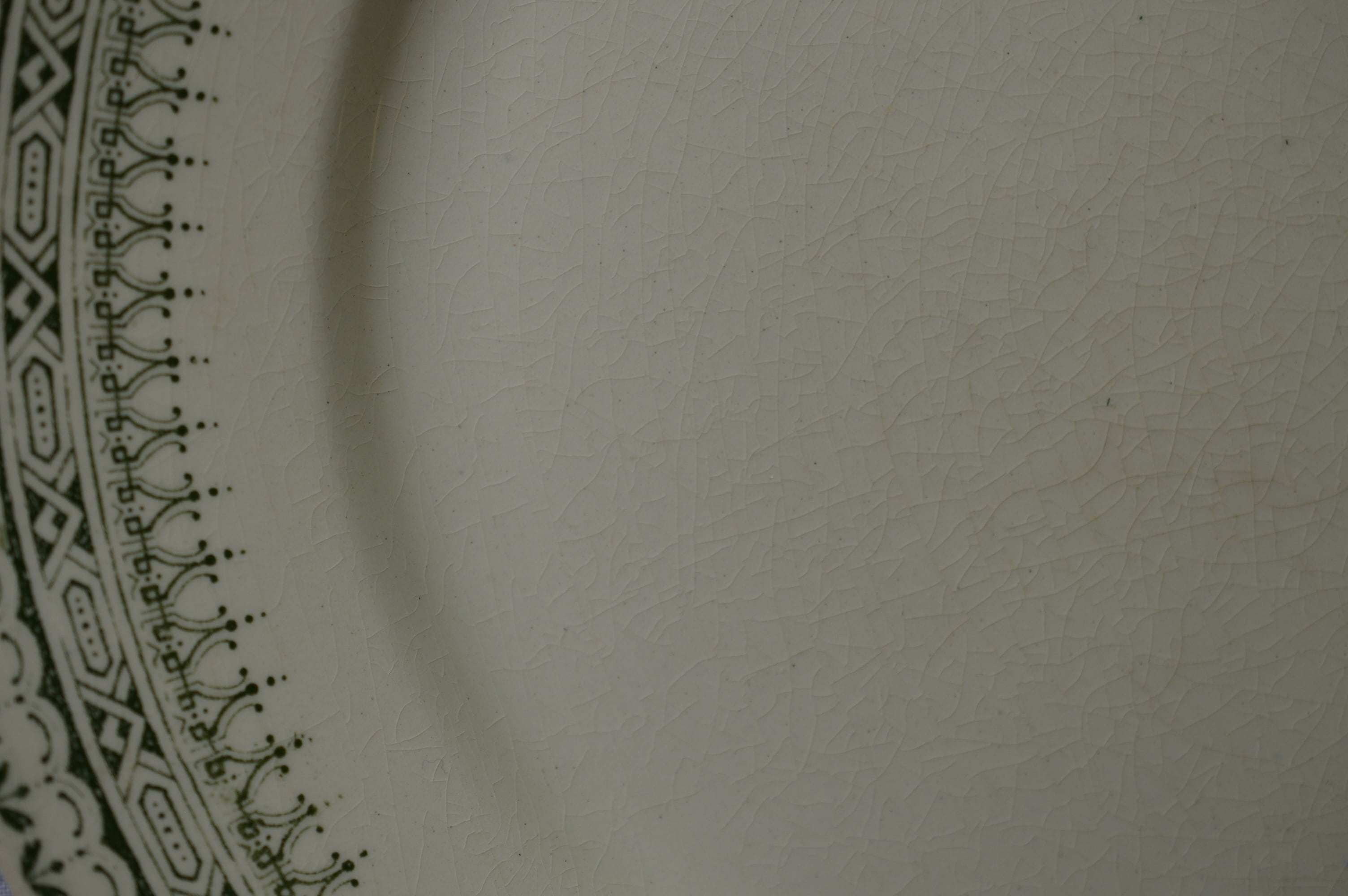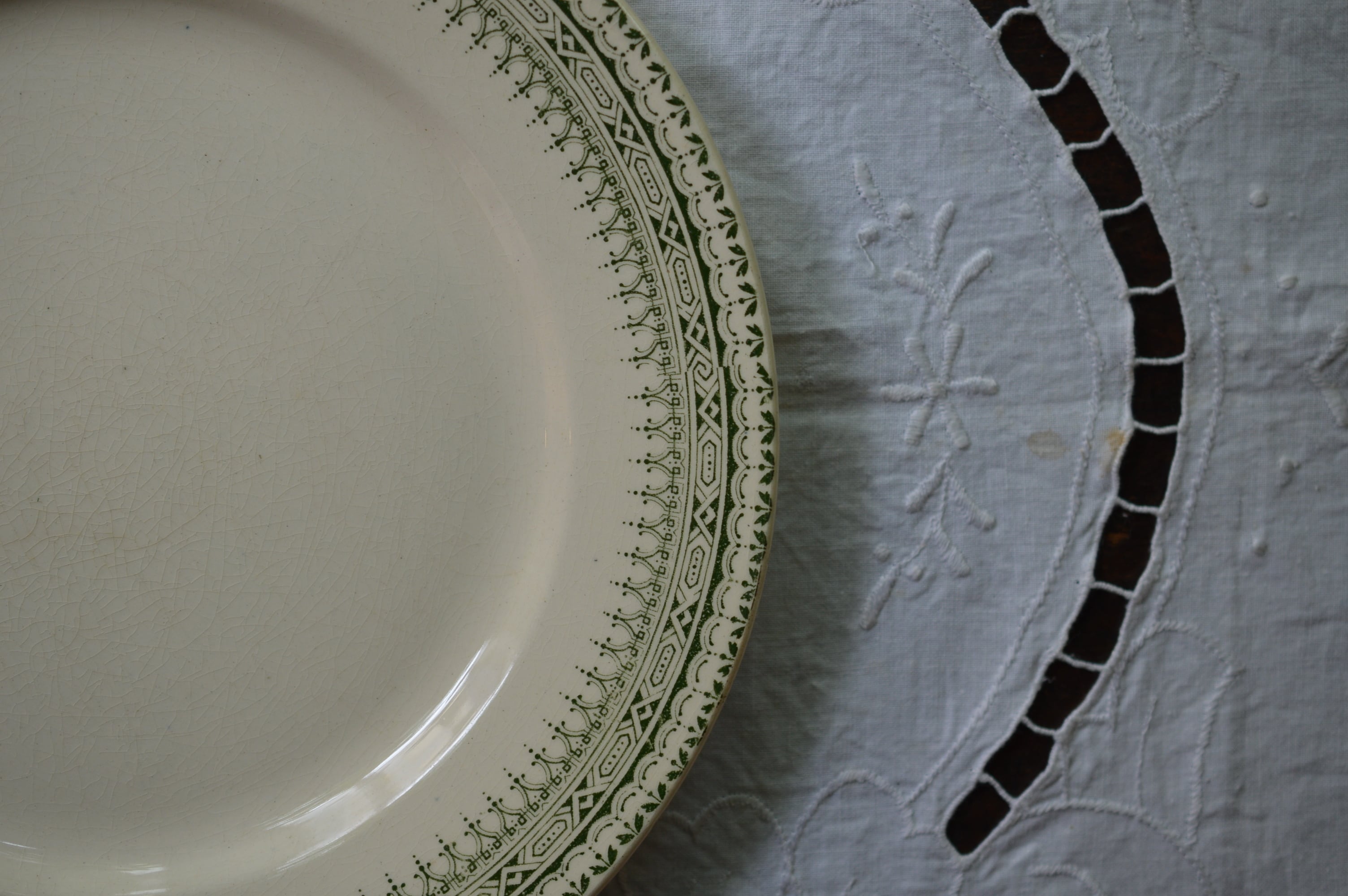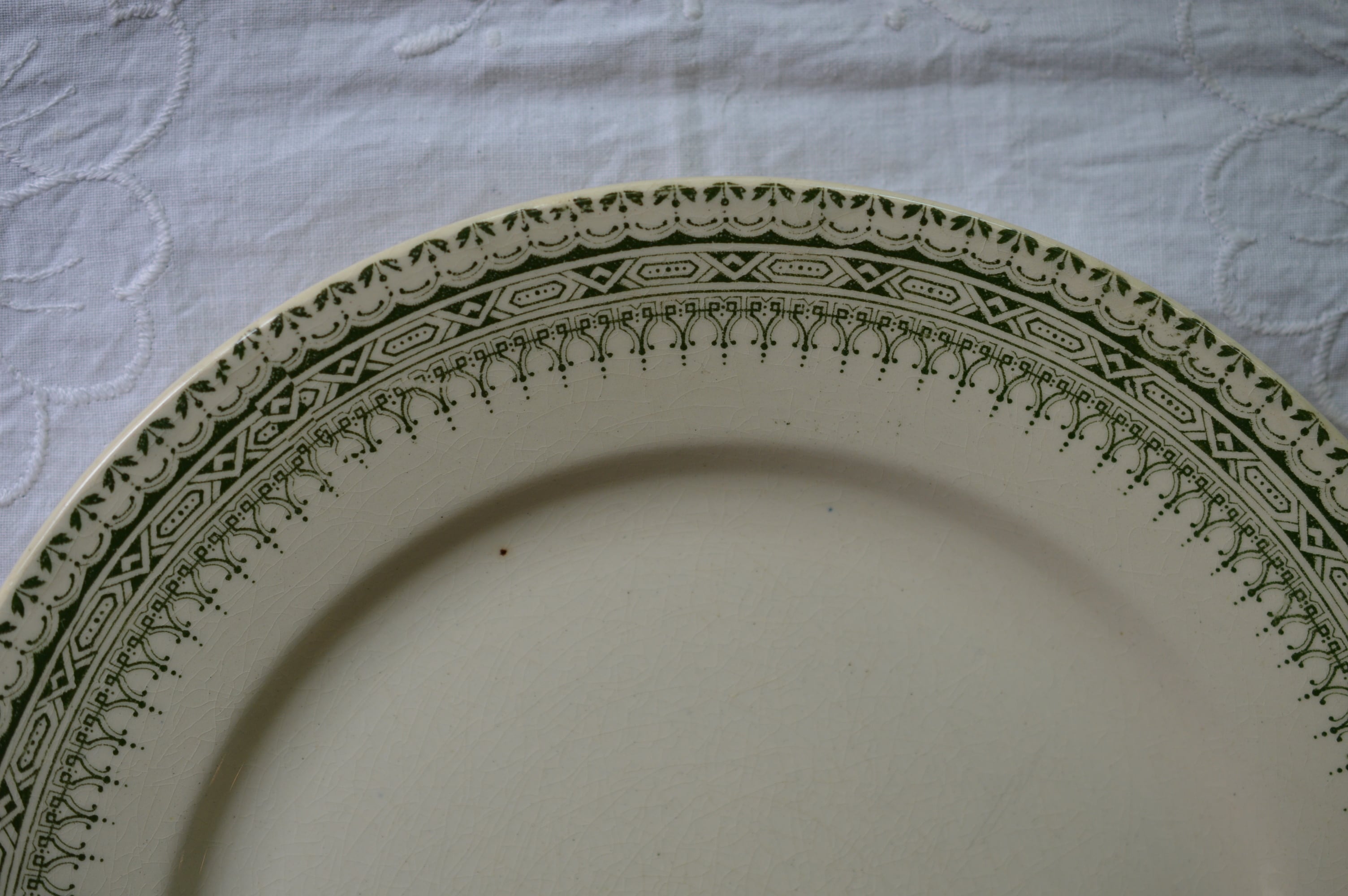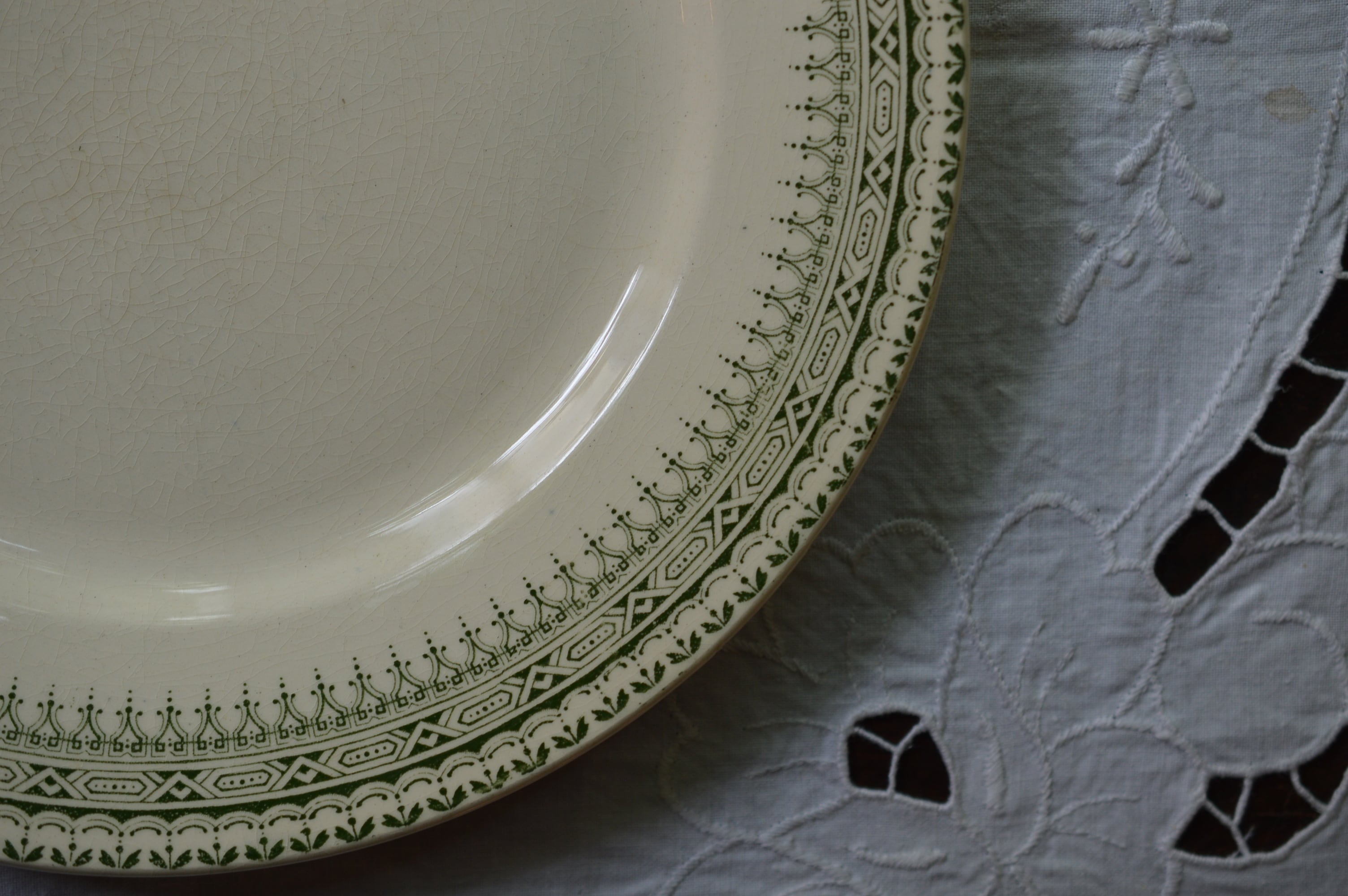 本品はショワジー・ル・ロワ窯のイポリット・ブーランジェ時代の平皿。ホワイトアイボリー地に縁周りに、淡いグリーンの転写の美しい装飾が施されています。恐らく古代ローマ建築をイメージした装飾ではないかと思います。シンプルですが非常に品格のあるディナープレートです。