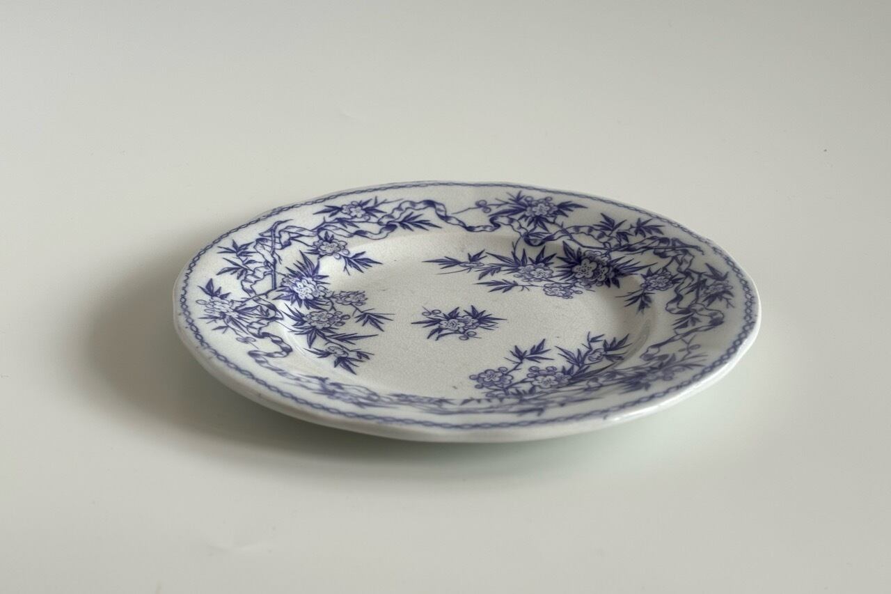 terre de fer に薄めのブルーの転写プレートで、縁まわりはスカラップ状になっています。個体によって経年変化による僅かな染みや貫入が所々に見られますが、ヒビやクラックなどは無く大変良好な状態です。詳細は各ABCDのお写真でご確認ください。