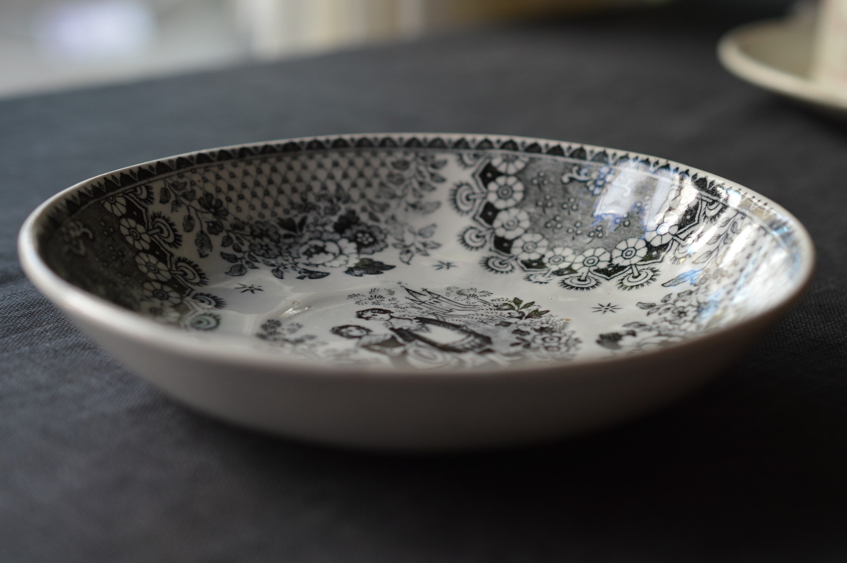 グリサイユは白黒で焼かれた陶器のことで、このシリーズにはブルーのものもあります。元は恐らくティーカップ(あるいはボウル)が付いていましたが、本品はソーサのみです。装飾用小皿として飾って頂ければと思います。