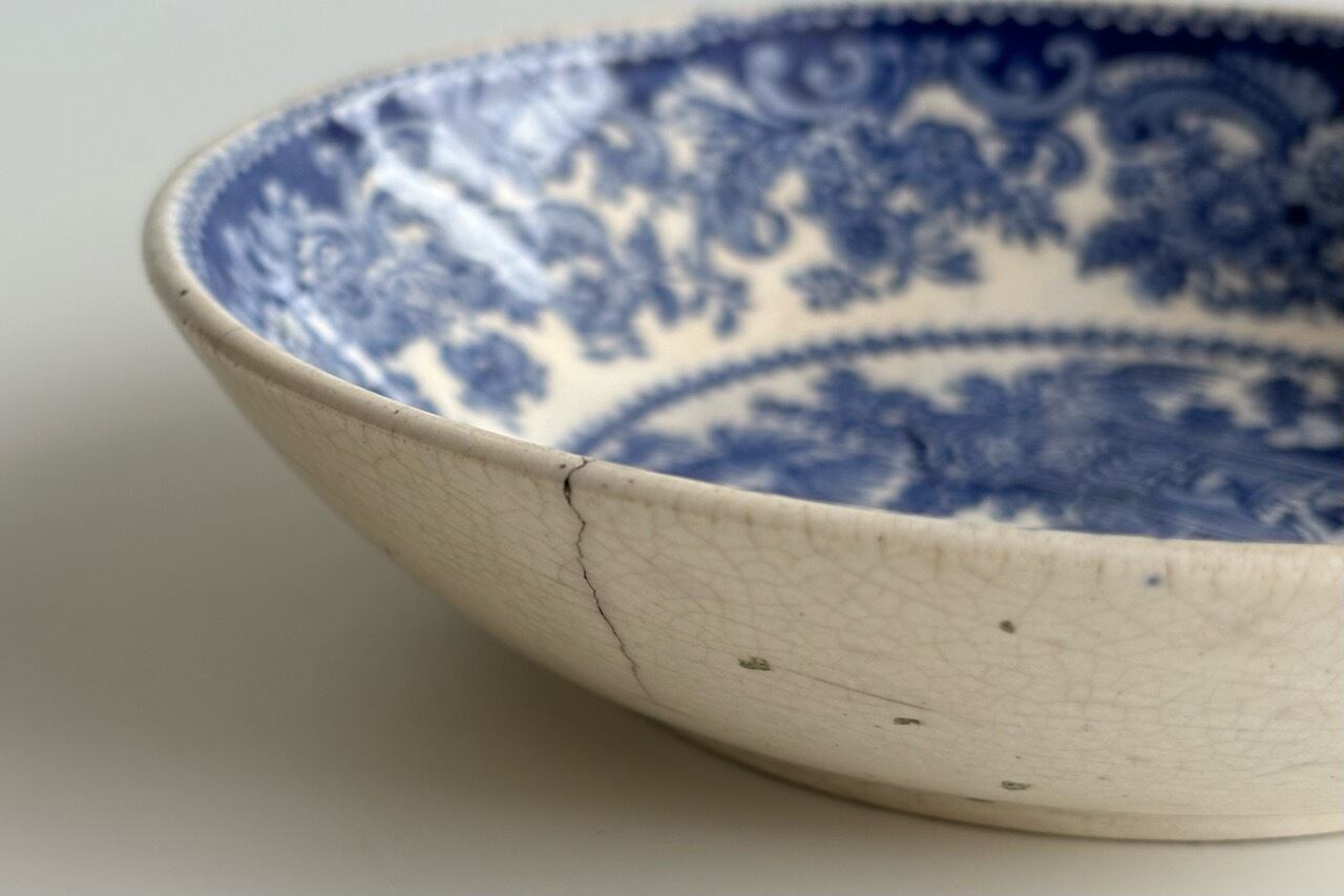 かなり古い陶器なので染みや貫入があります。側面には3ヶ所のクラックが入っています。完全に割れてしまう可能性は無いと思います。