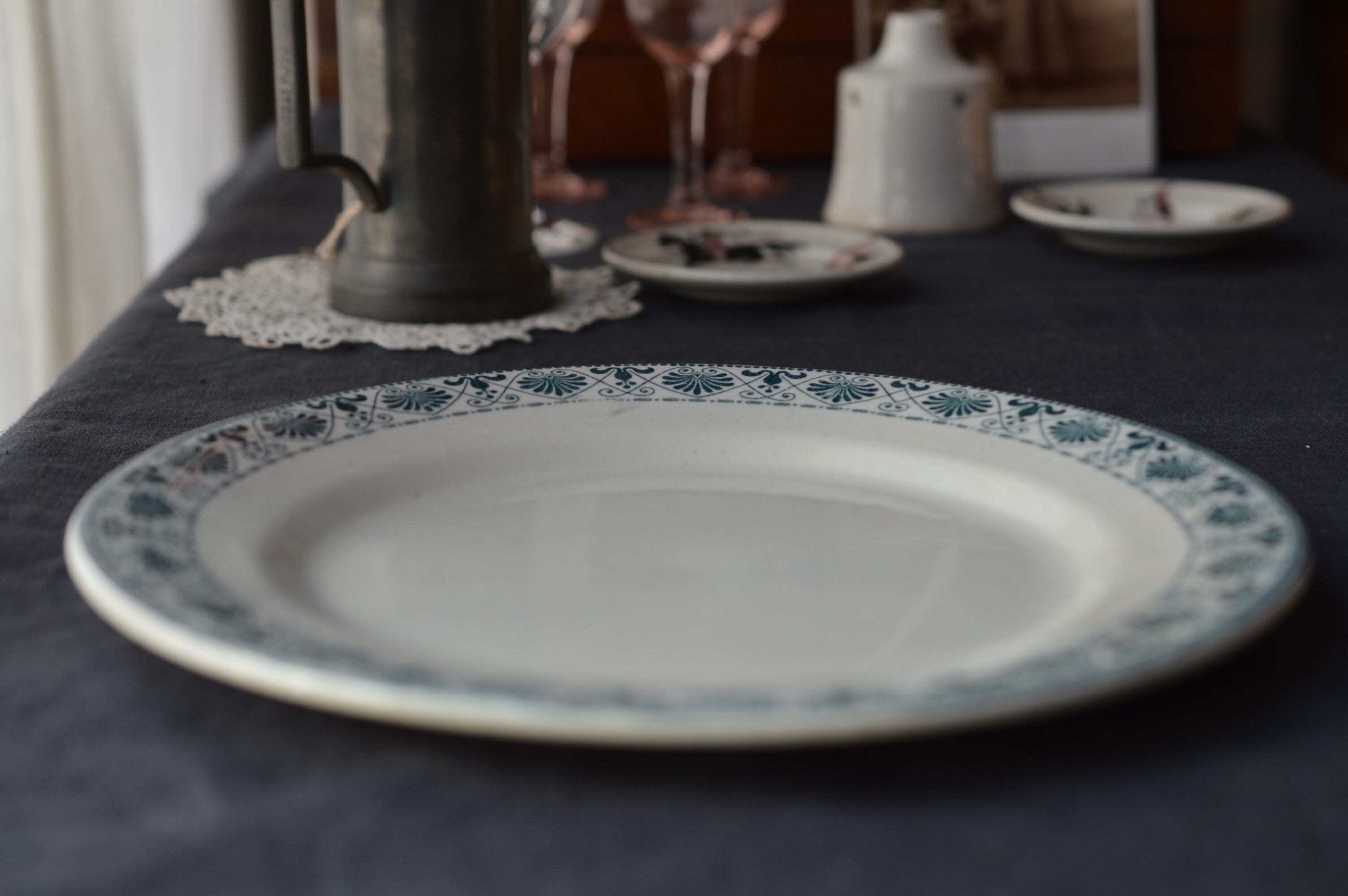 直径21cm程の大きさはデザート用にもディナー用にも使えるサイズ感です。縁柄のグリーン色には少しブルーが入っていてとても優しい色合いです。表面には表面の釉薬の細かな貫入があります。ヒビ、欠け、クラックなどはありません。